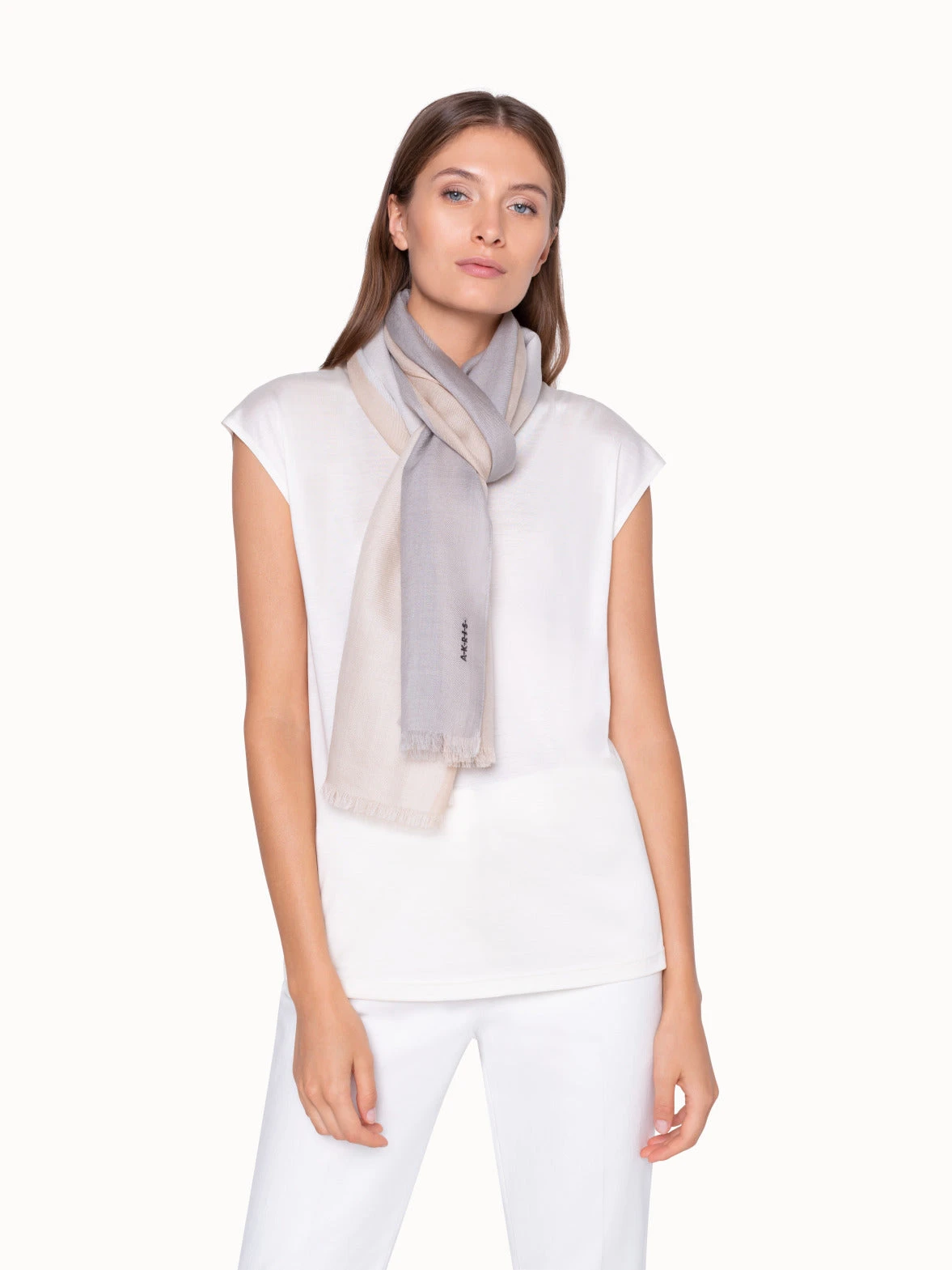 Feel the soft embrace. This cashmere and silk scarf can be easily combined with its neutral beige, white and grey stripes. Cuddle up in the cozy warmth and feel as strong and confident as you are. 70x200cm