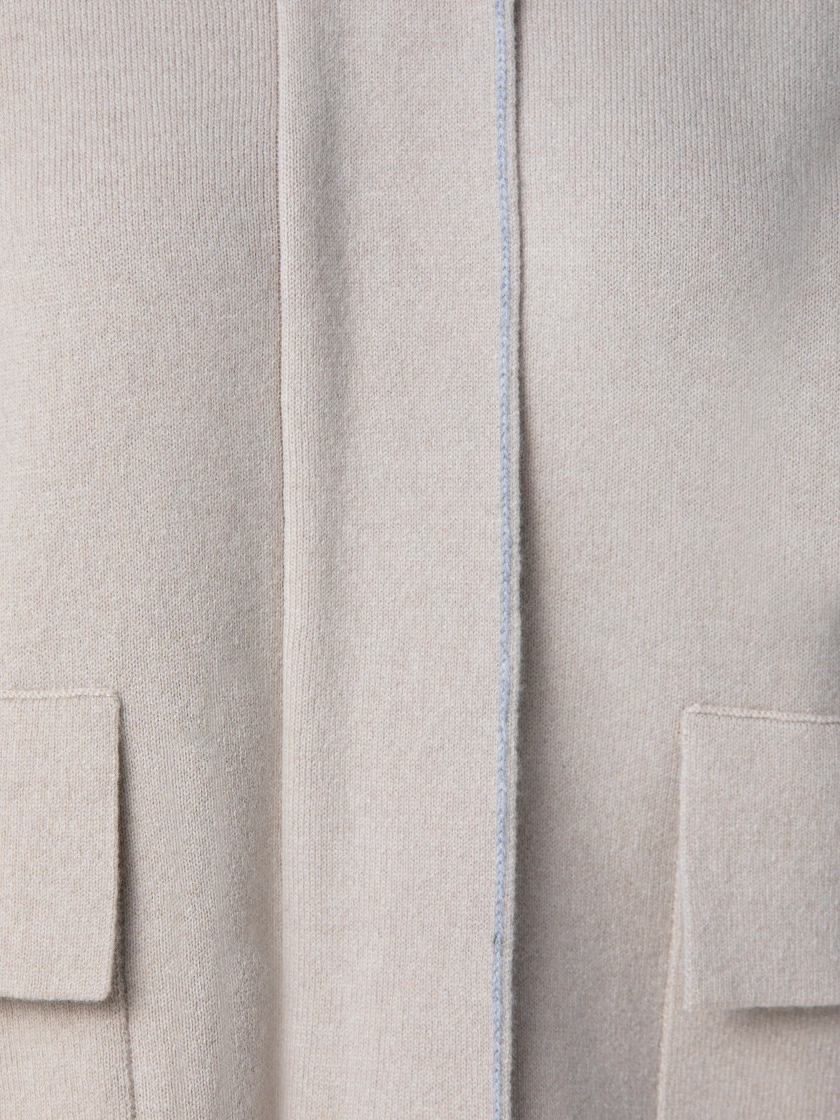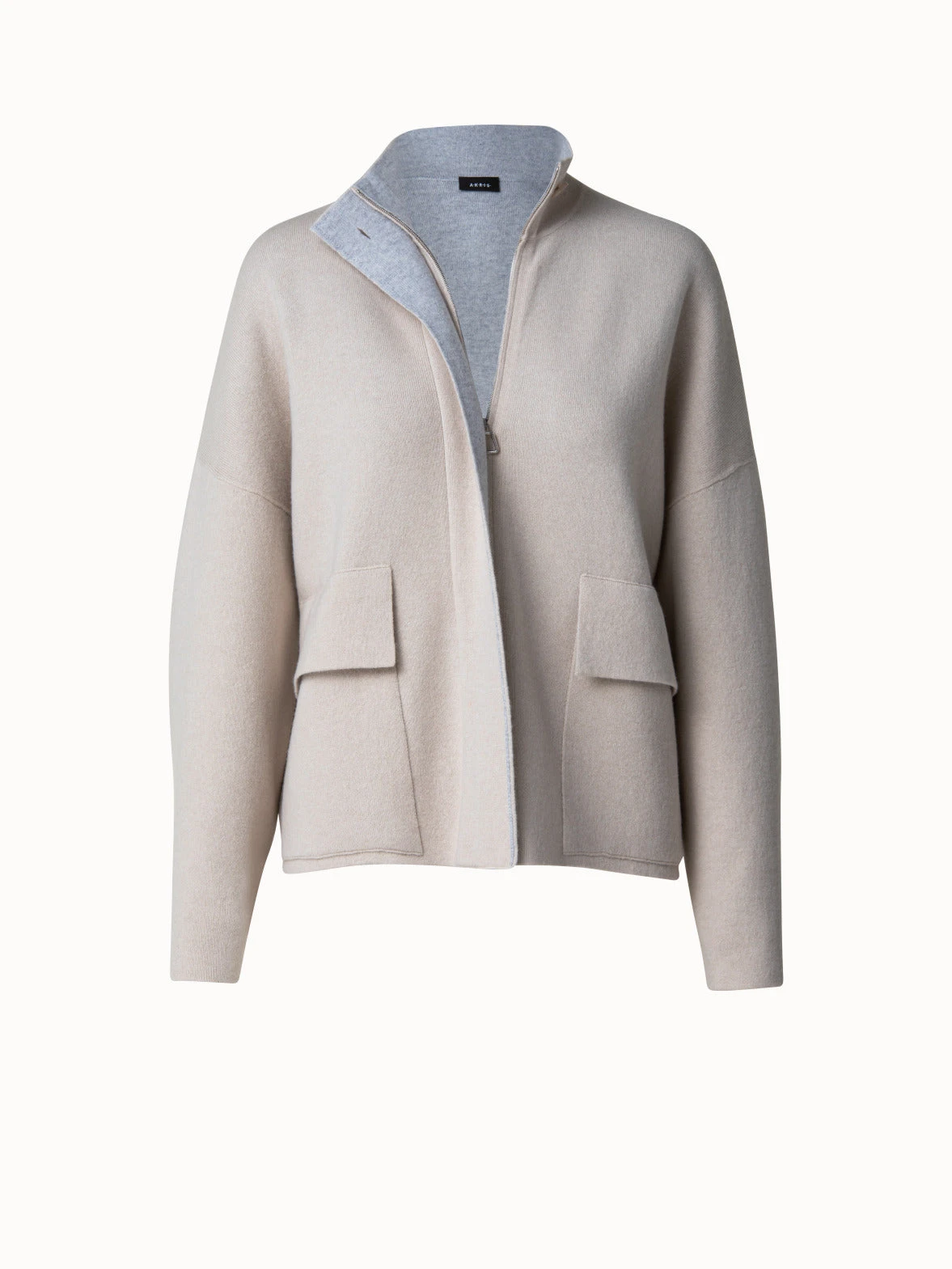 Bi color boxy knit cardigan in cashmere with stand up collar, zip closure, patch utility pockets. It has a