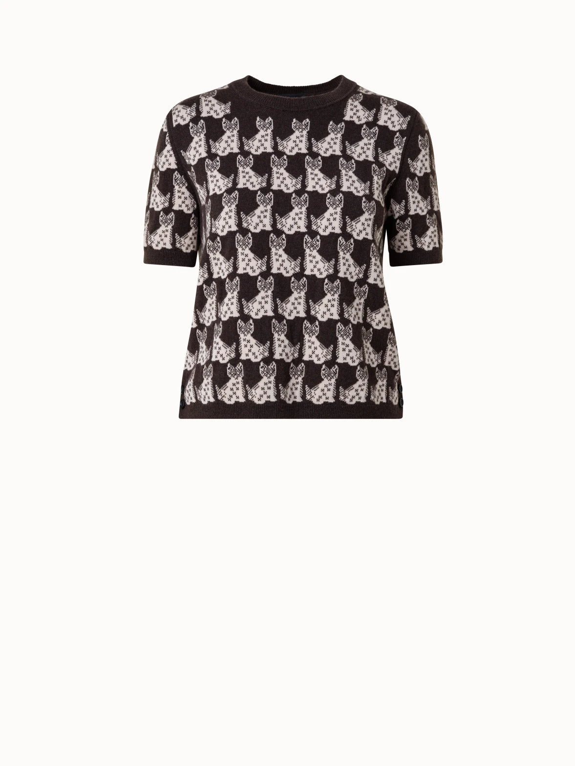 This Akris pullover is crafted in a cashmere cotton Emma jacquard knit. The all-over Emma motif is a playful, witty reminiscence of a 1970s design by Max Kriemler and renamed after creative director Albert Kriemler’s dog. The slightly boxy cut with short sleeves and small side slits with buttons create a versatile silhouette for spring and summer.
