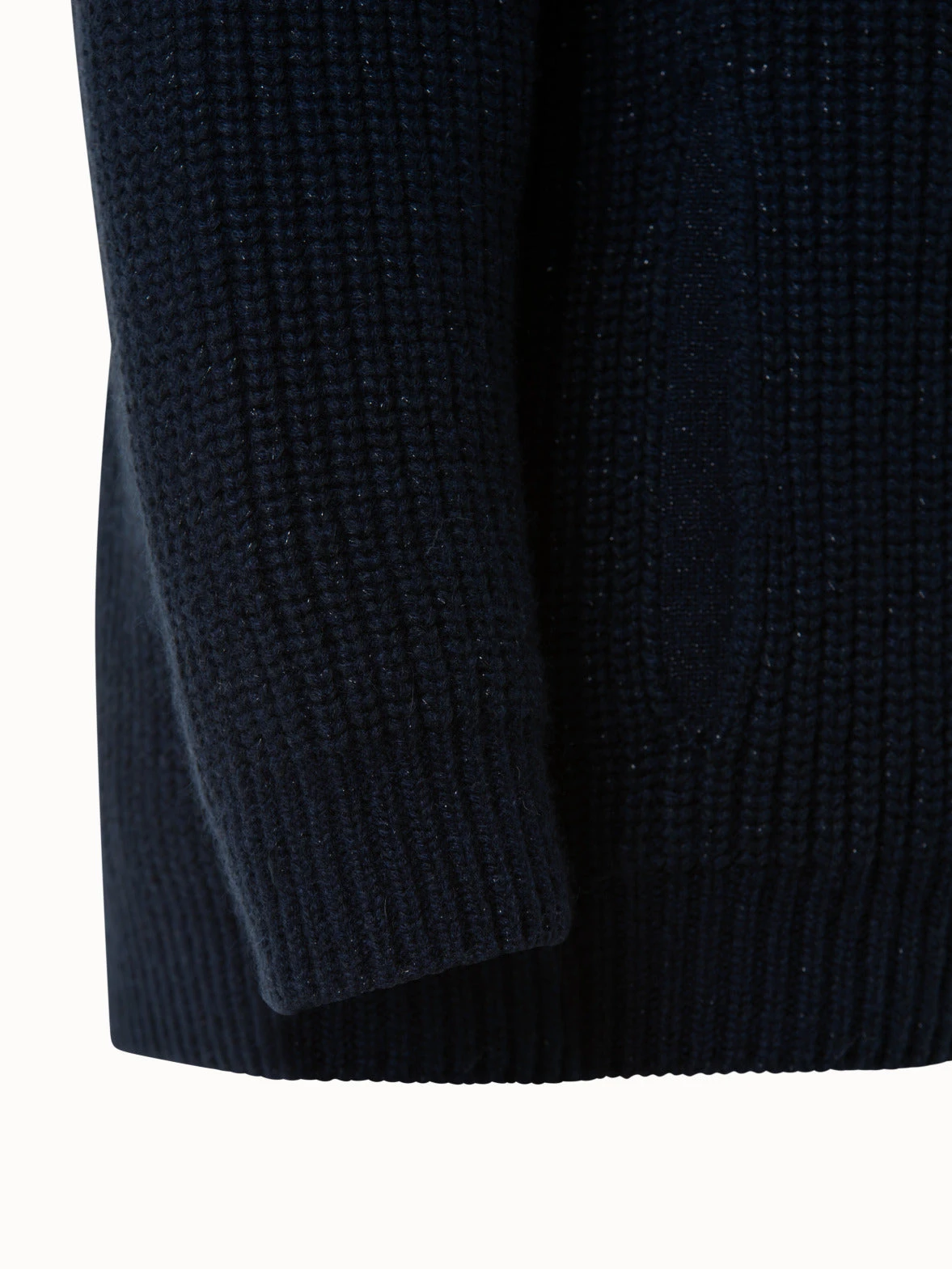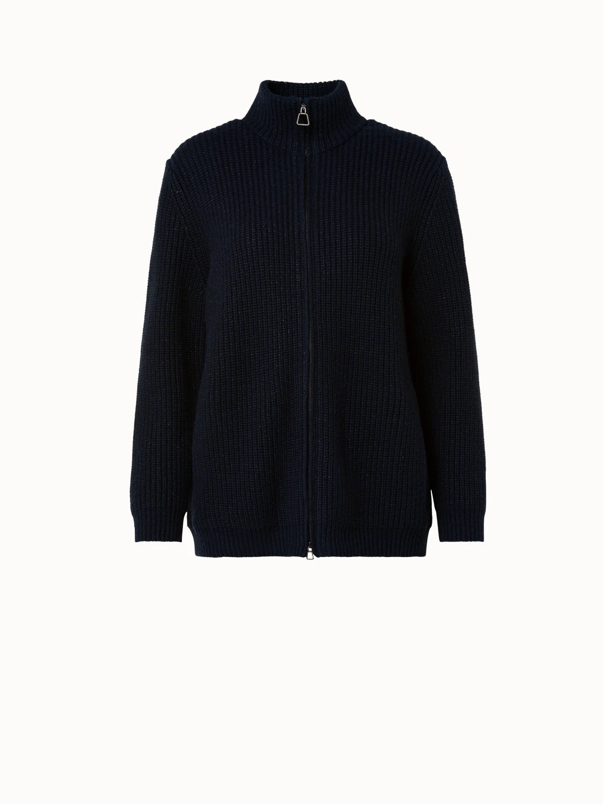This cozy ribbed knit cardigan is spun from cashmere and cotton with fine tonal sequins woven throughout creating a subtle shine when it catches the light. The stand up collar and zip closure will keep you extra warm through the winter months.