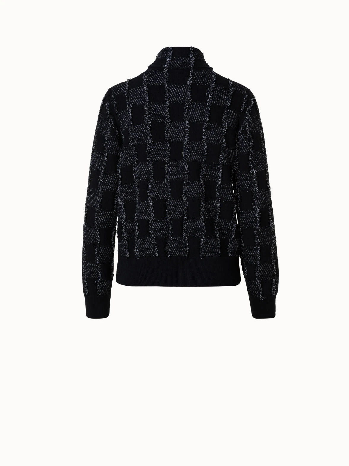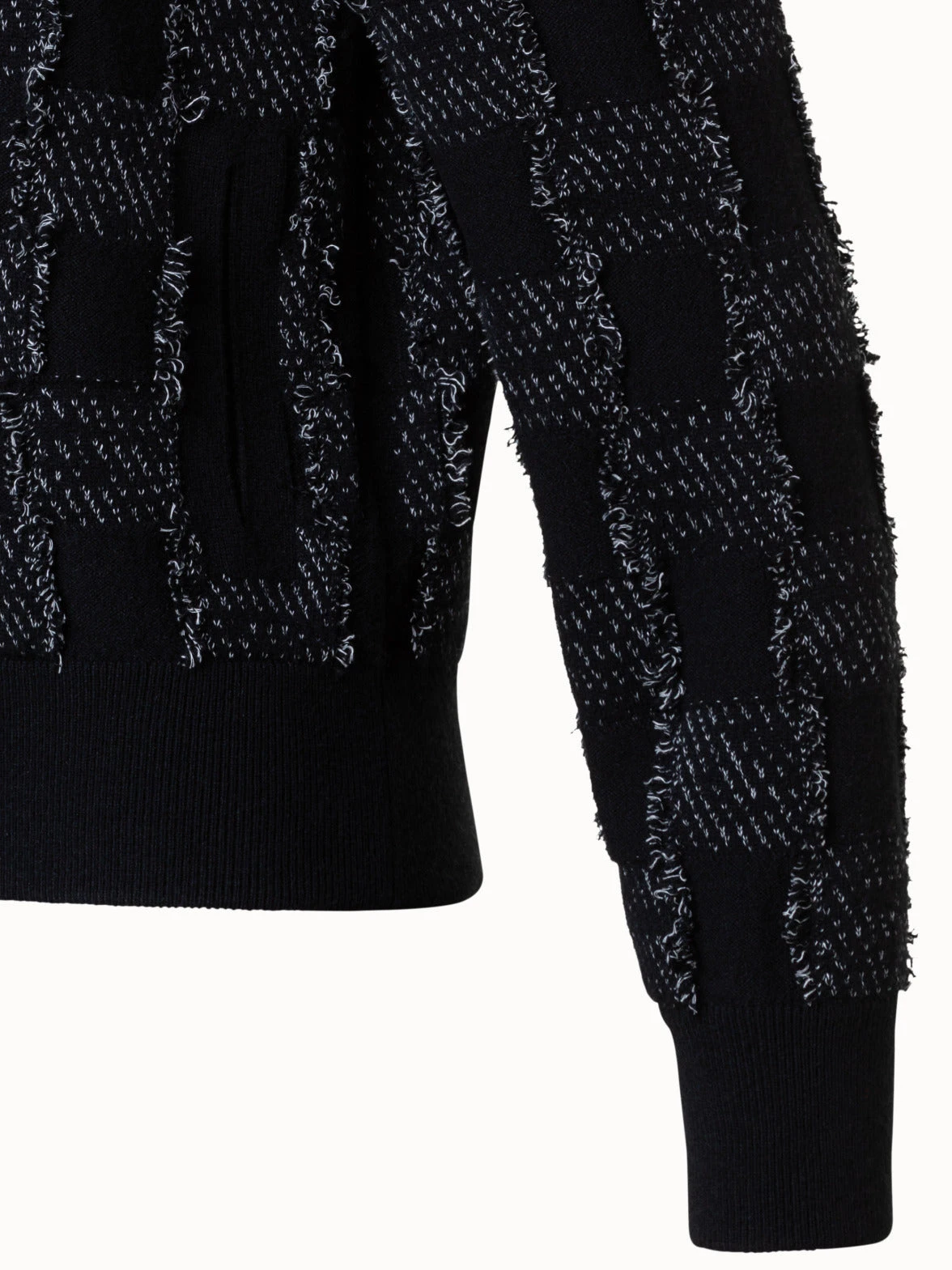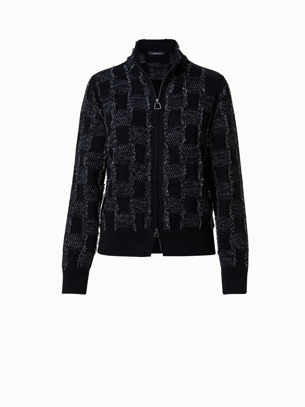 This Akris knit jacket is crafted in a cashmere cotton jacquard with square fringes that gives it a subtle volume and structure. This bomber jacket inspired style with a stand-up collar, zip closure, and pockets is ideal for casual use during spring and summer.