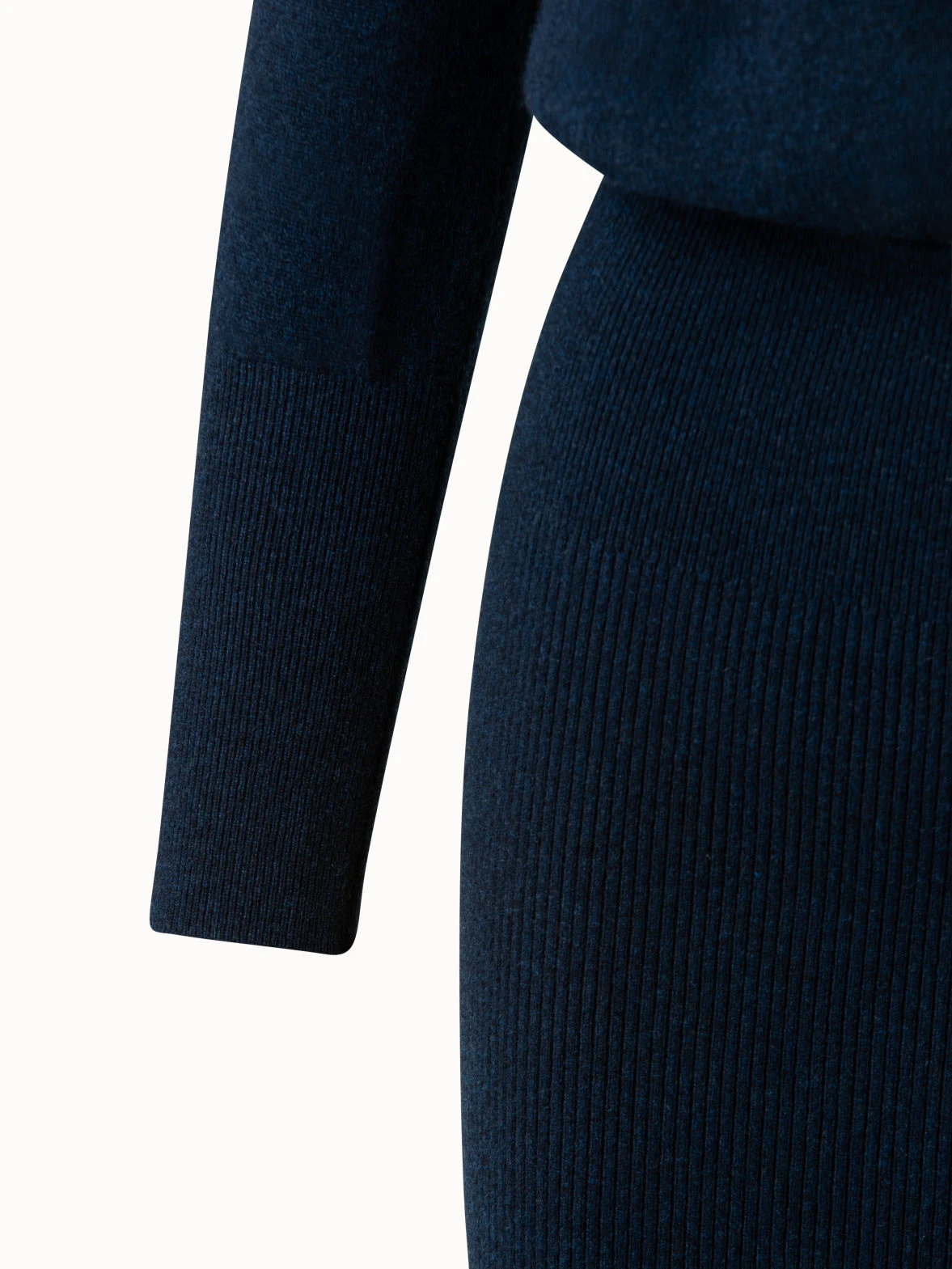 This cashmere stretch knit dress will leave you feeling flawlessly put together without sacrificing comfort. Designed with a blouson top and a fitted skirt accentuating the body. The drawstring cowlneck and front pocket give this dress a sporty twist.
