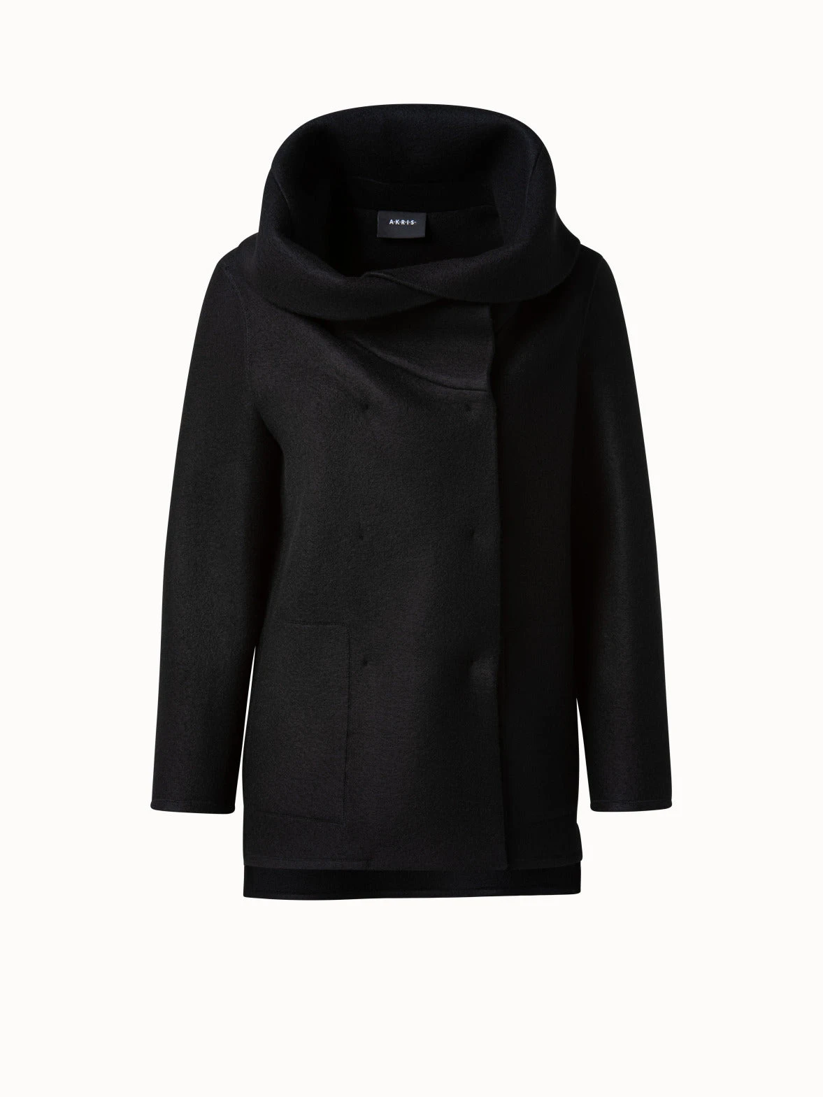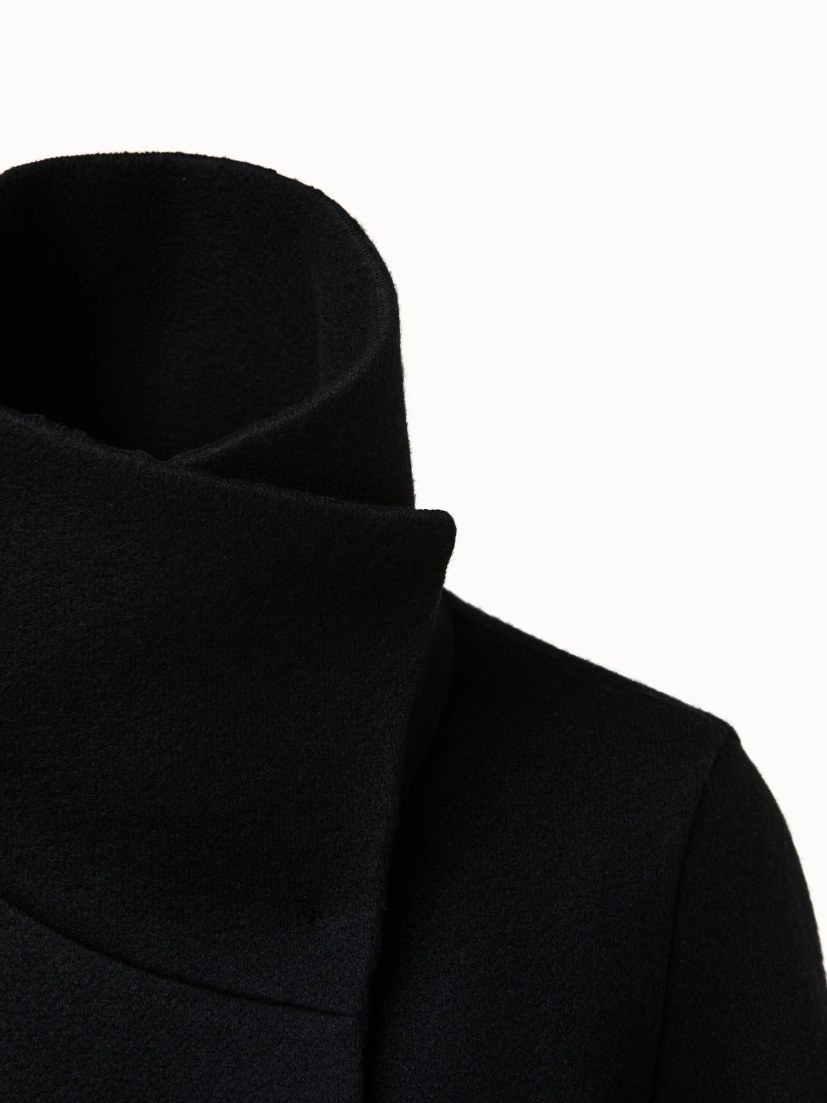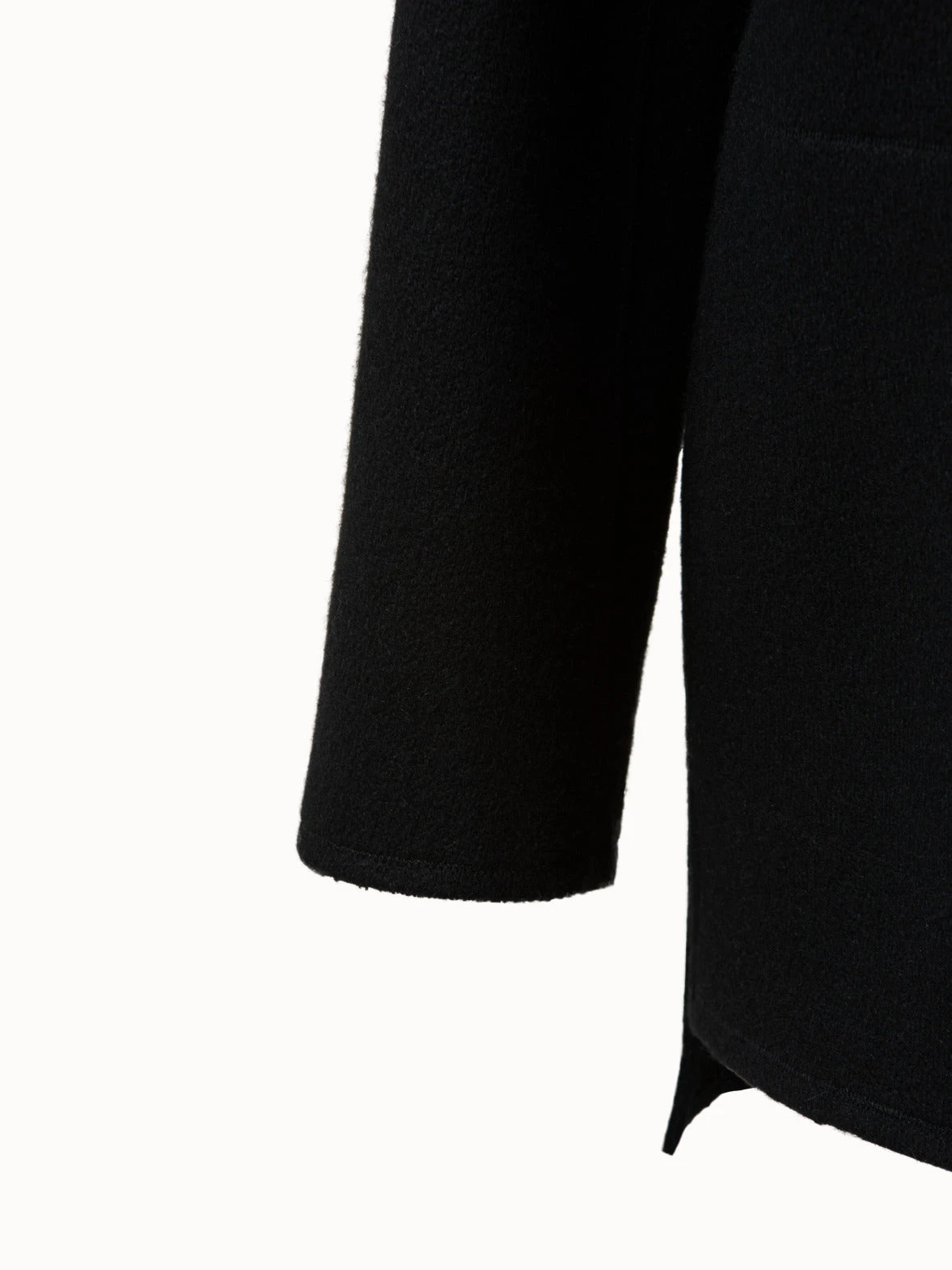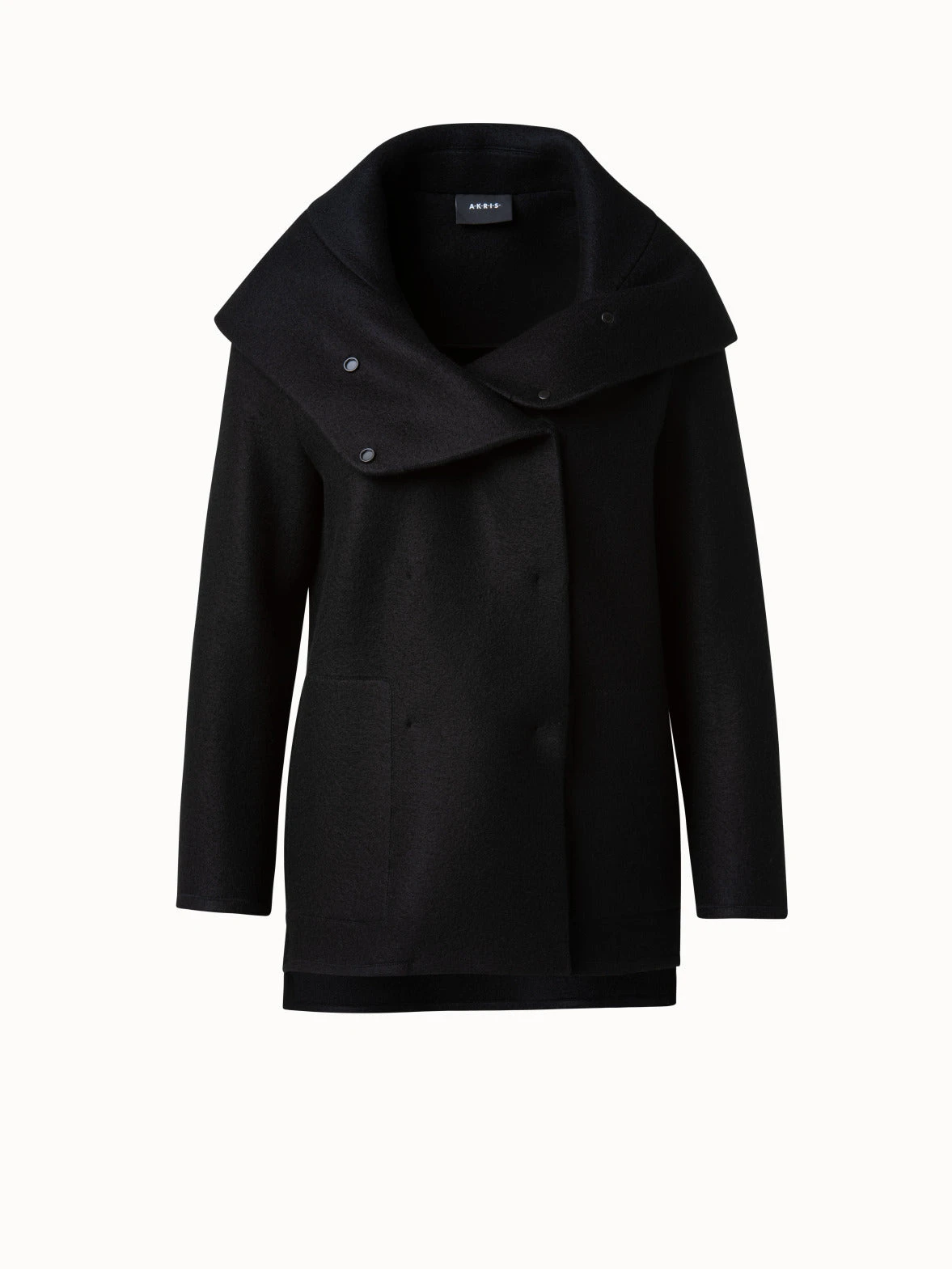 This casual, oversized cashmere jersey jacket feels like a cozy cocoon on your body. Designed with a stand up collar, snap closure with trapezoid metal buckle, pockets, and slightly longer back hem.