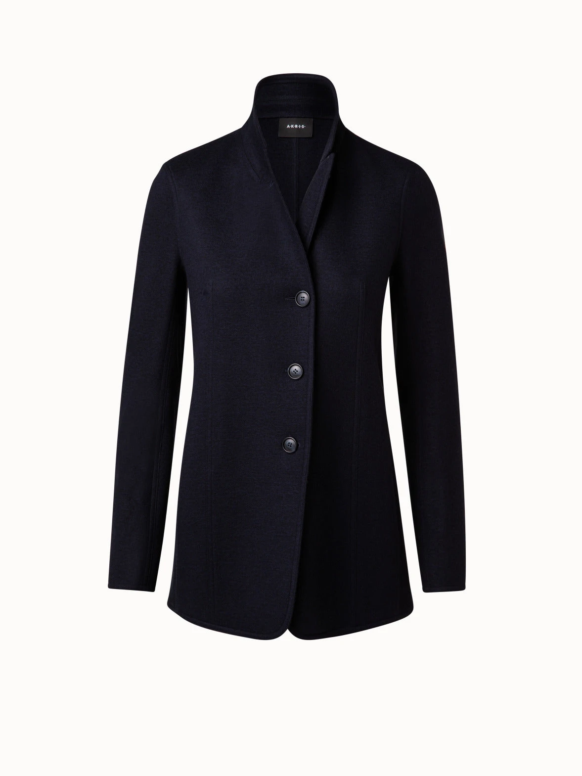 This Akris long jacket Liam is crafted in a comfortable yet elegant cashmere jersey. It features a button closure with the look of an inward folded lapel. The tailored silhouette creates a sophisticated and flattering silhouette that is underlined by sleek seam pockets.