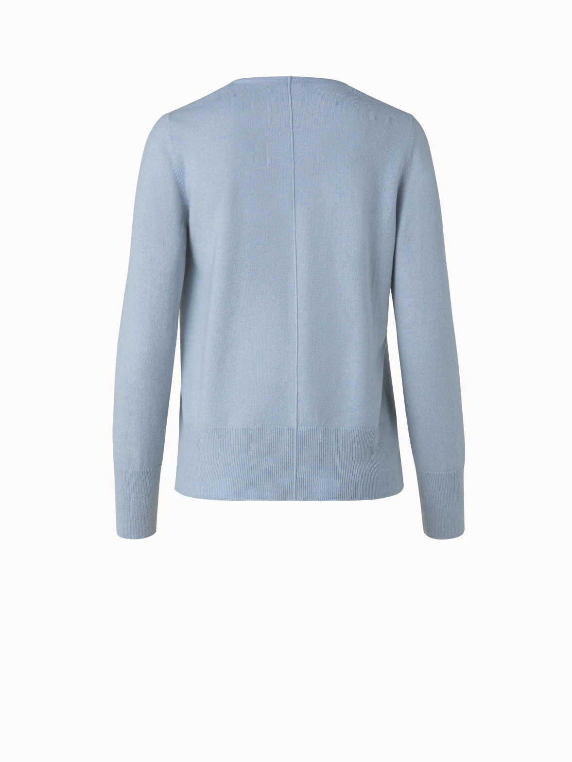 A prominent purveyor of high quality cashmere, Akris is renowned for its well-crafted and luxuriously soft sweaters. This one has a ribbed hem and cuffs that allow it to hug your body in a flattering way while a front middle seam adds an interesting detail.