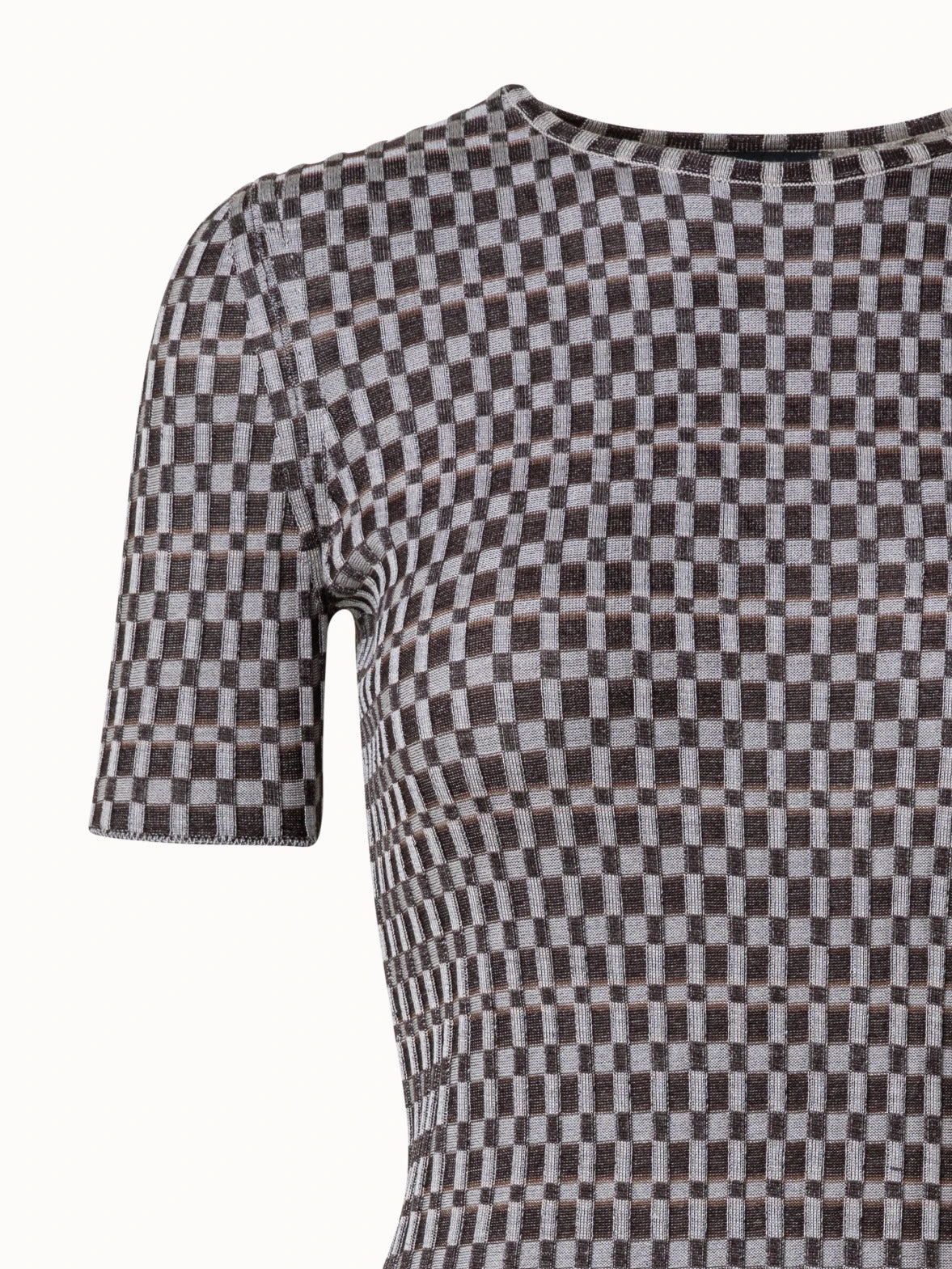 This Akris pullover is crafted in a structured check silk knit, creating a comfortable and elegant style that is perfect for spring and summer. The round neck, fitted silhouette, and short sleeves make it ideal for layering or as a versatile standalone piece.