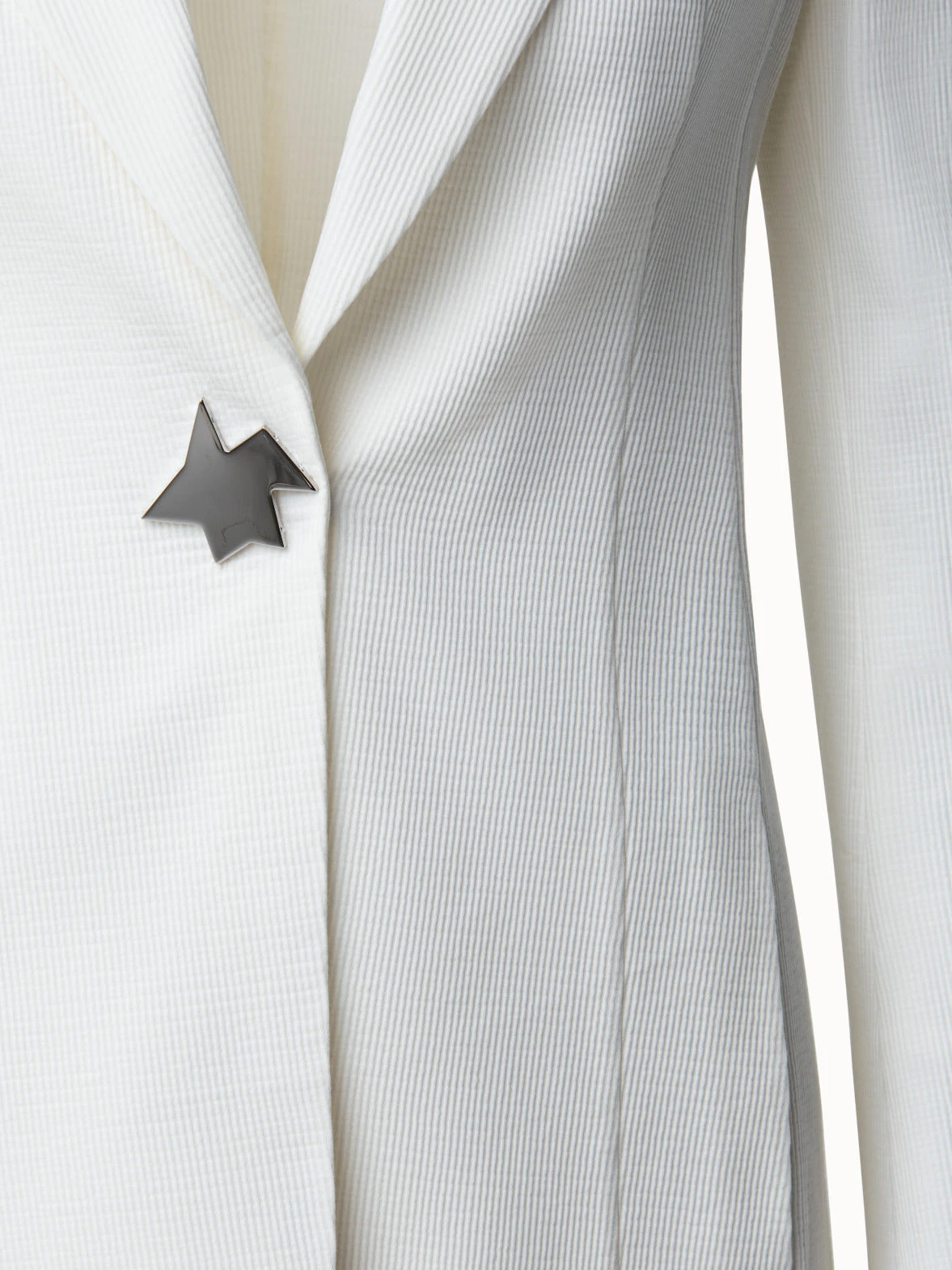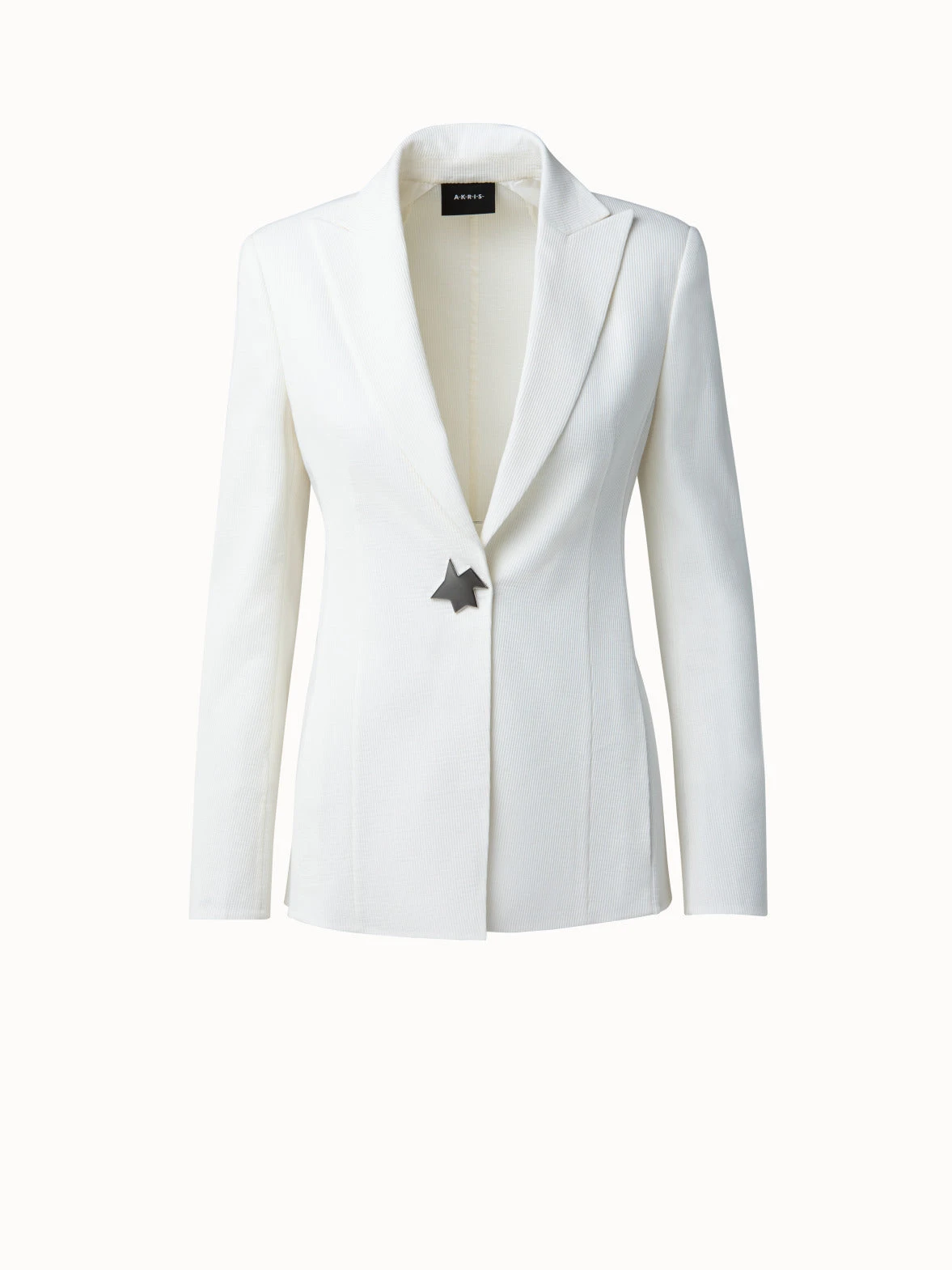 This timeless jacket gets a modern and artistic spin with the abstract star-shaped front button. Features an elongated lapel collar and seam pockets.