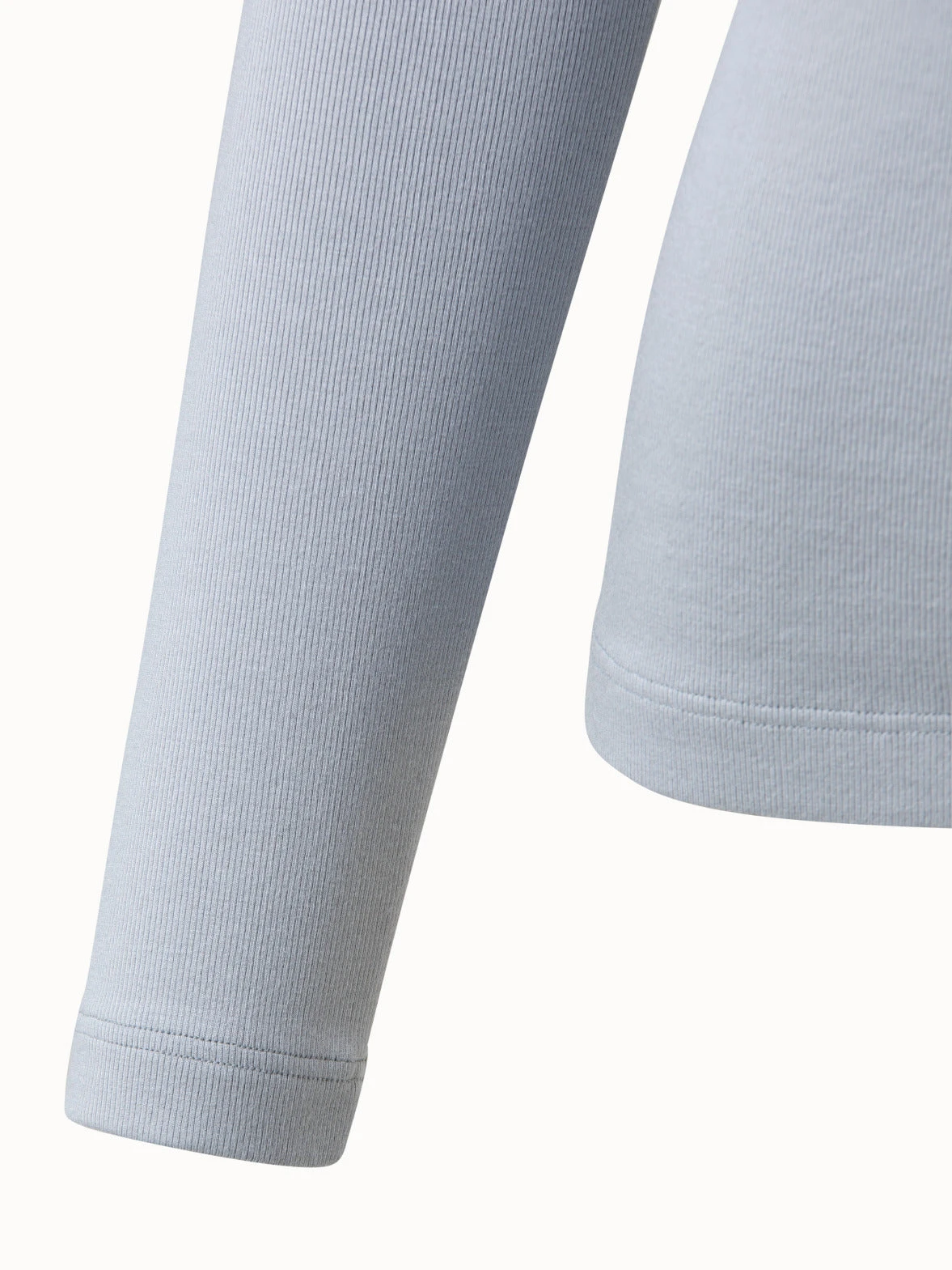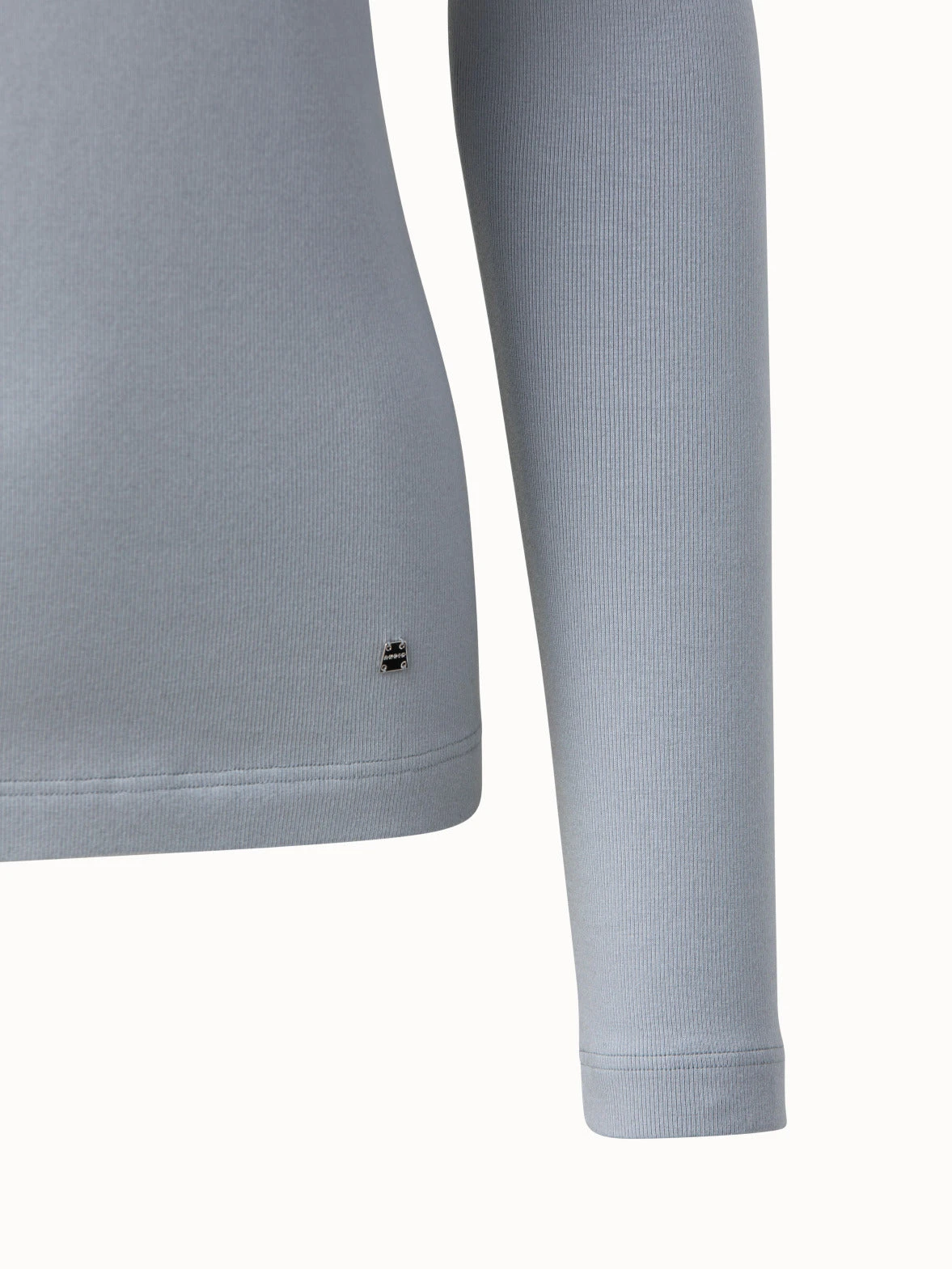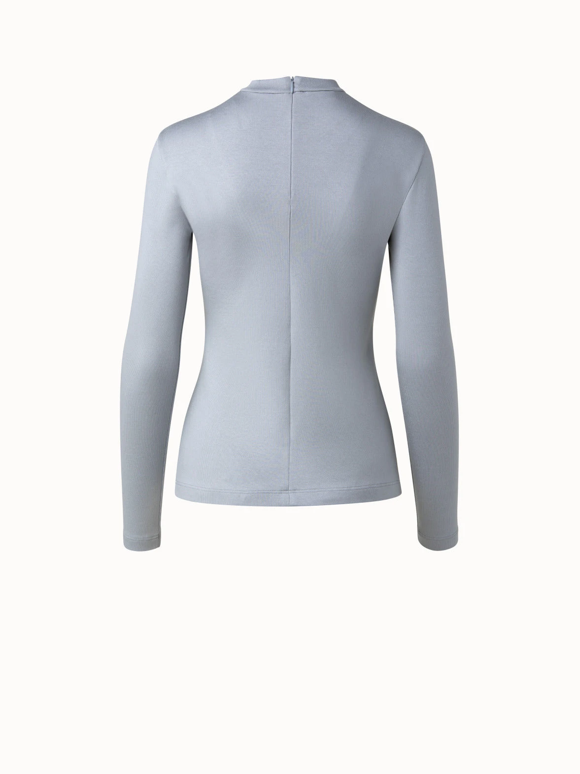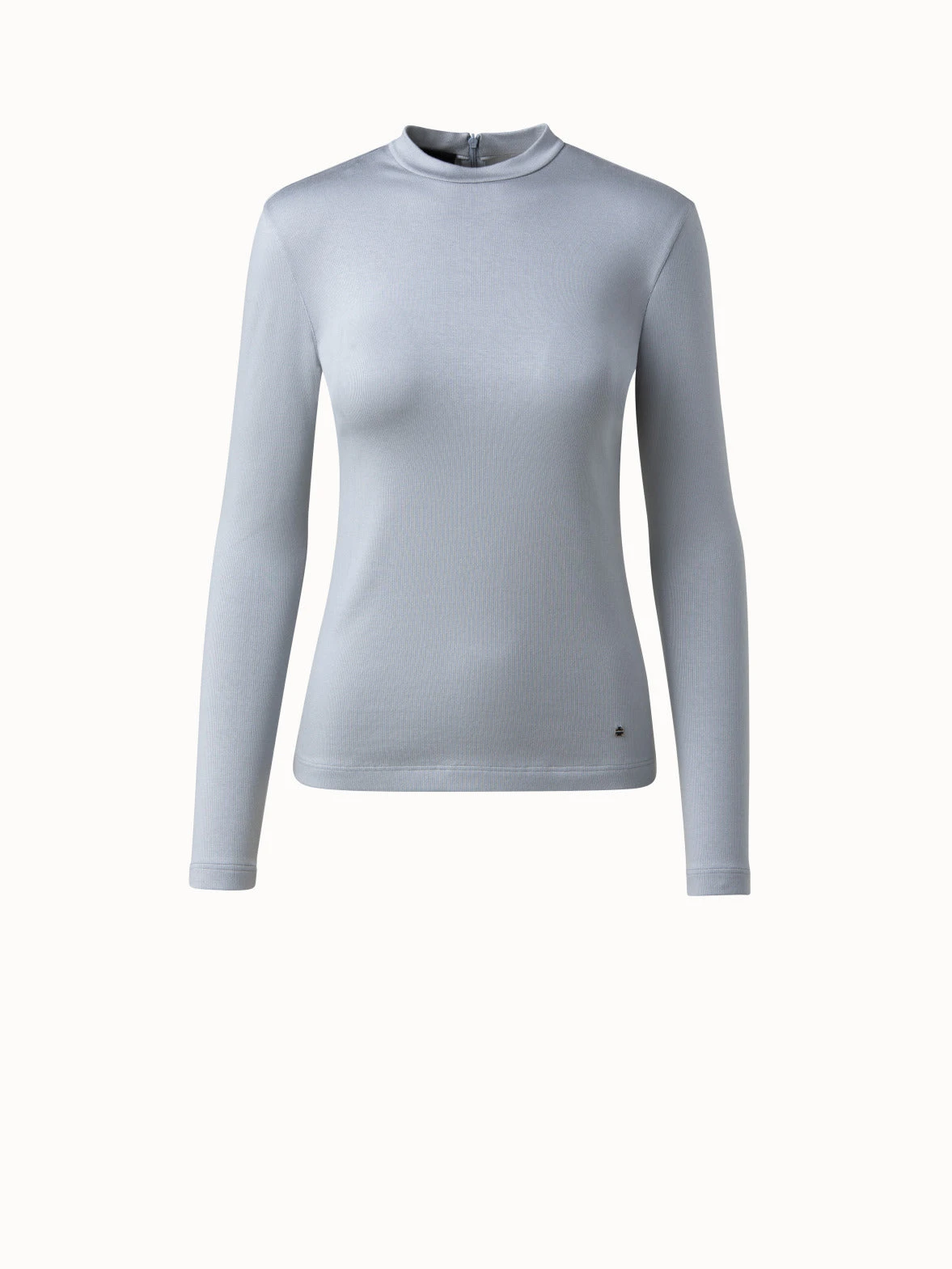 A sleek and streamlined cotton silk jersey top perfect for layering under a jacket. The slight mock neck style has a back zip closure, fine rib structure, and long sleeves.