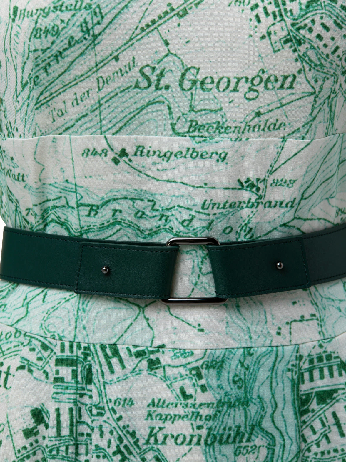 This day dress featuring the St. Gallen map print in ultra soft wool jersey is sophisticated without sacrificing comfort. The mock neckline and fitted waist seam details hug the body in all of the right places. The softly pleated skirt with front slit hits just at the knee and our tonal trapezoid buckle belt in leather and elastic ties everything together.