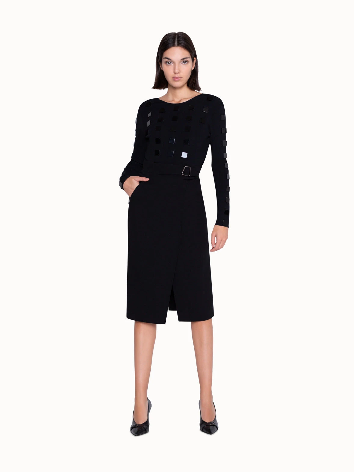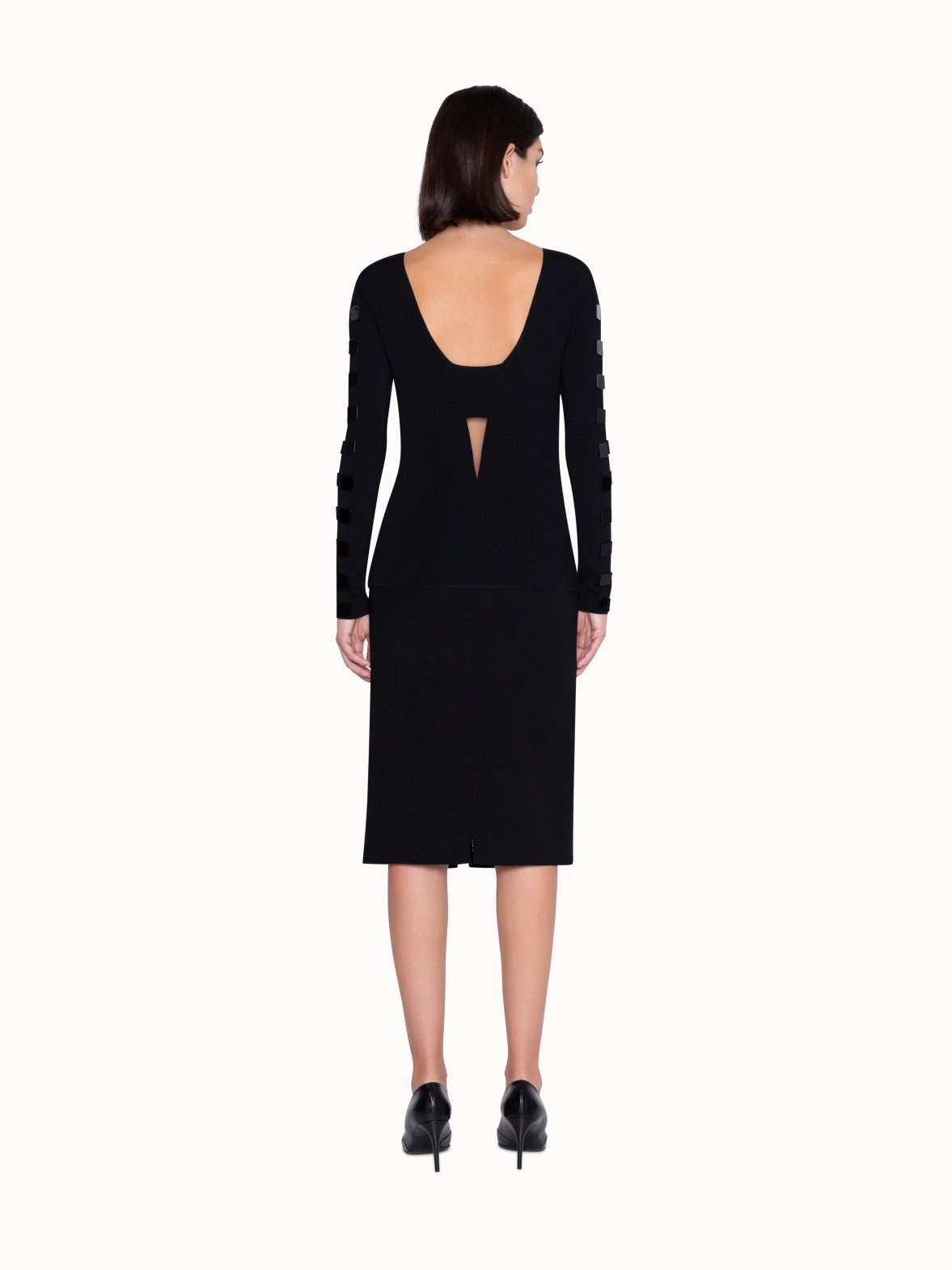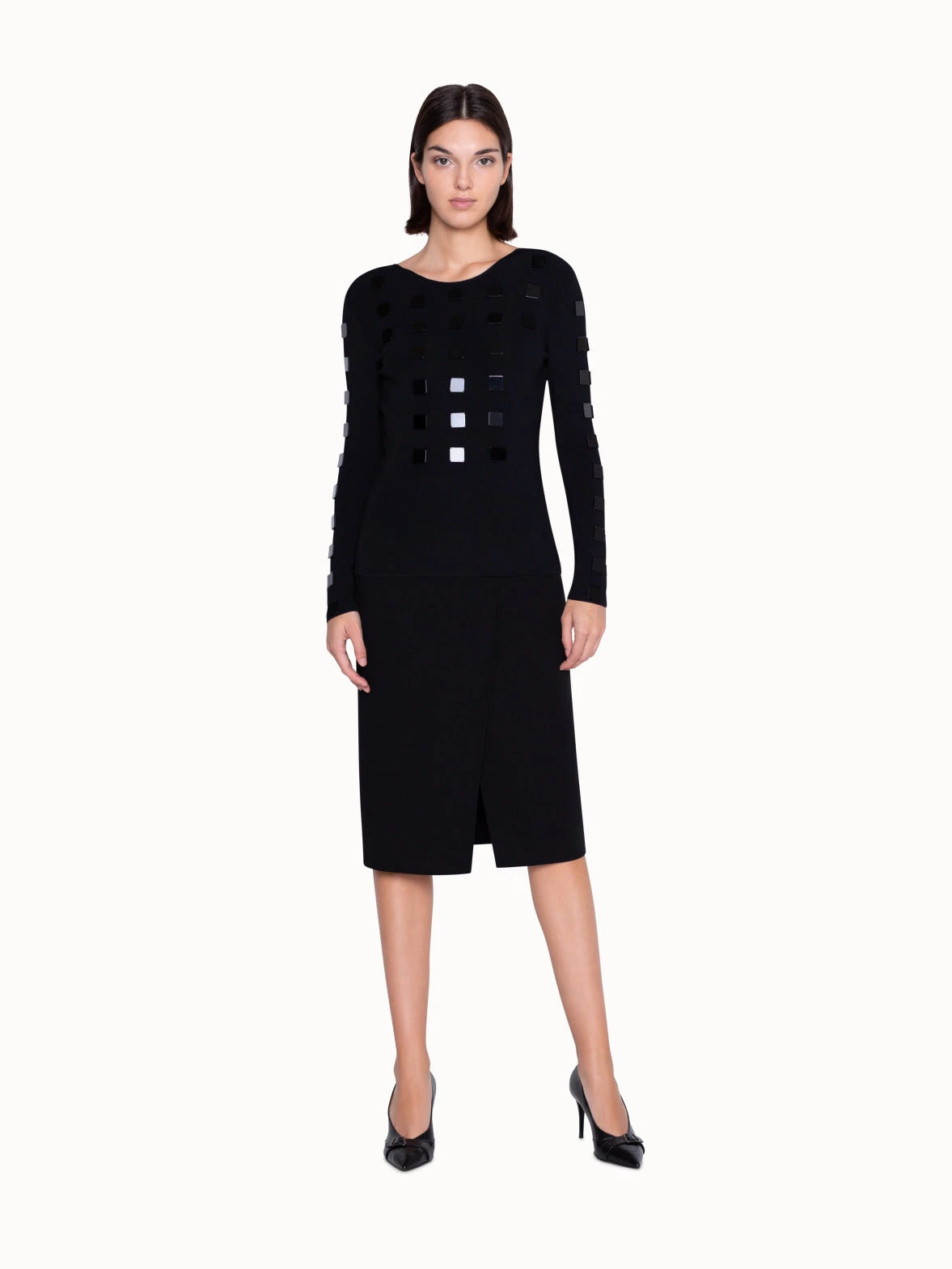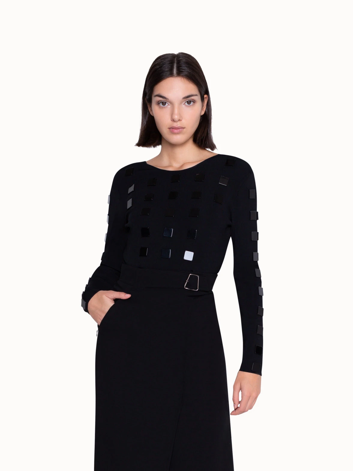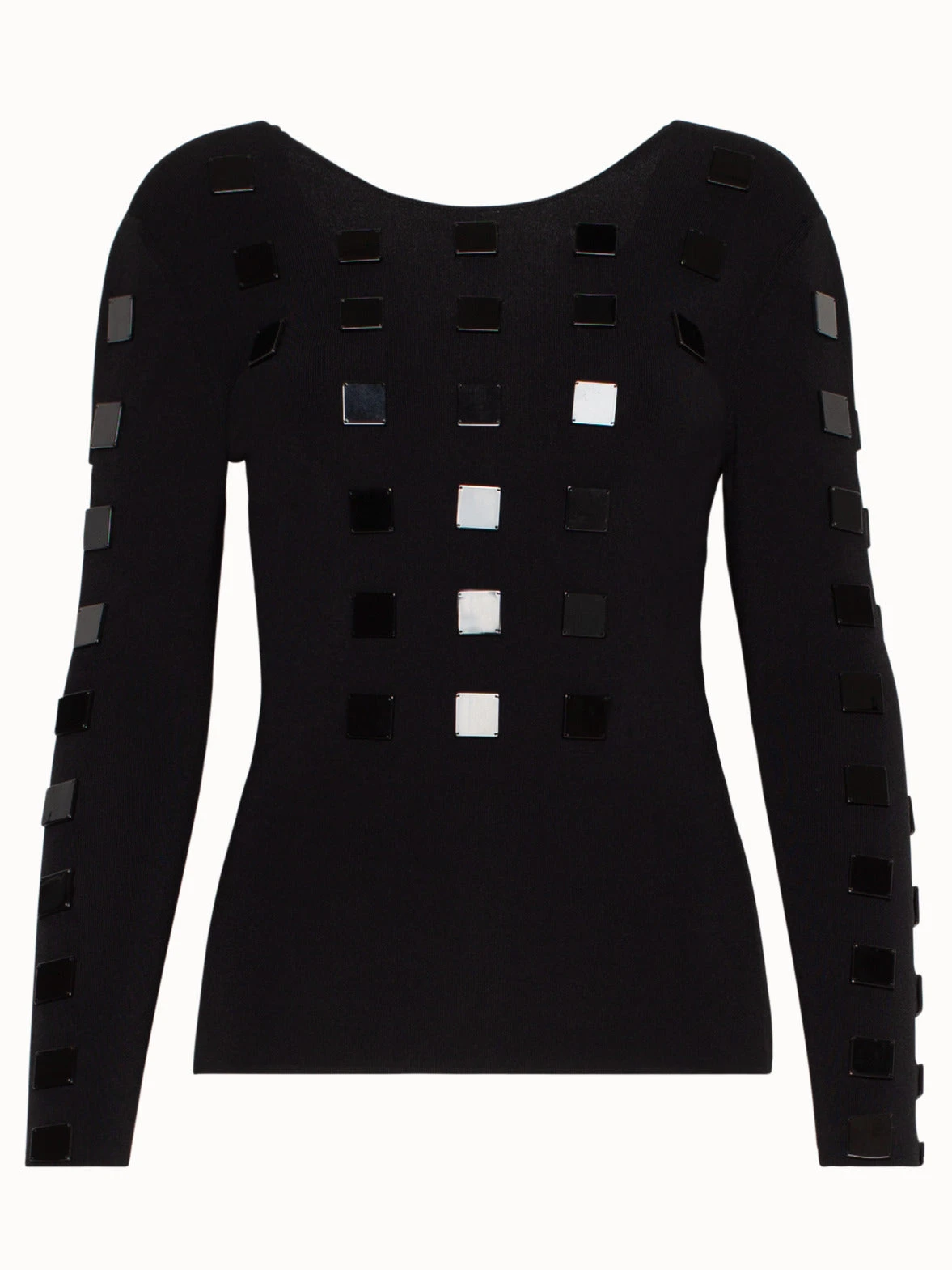 Add some shine to your outfit with this embellished knit pullover. The square stone detailing on the front of this sweater spruces up a basic black outfit, while the plunging back cutout adds a sensual twist. Easy to dress up or down, this pullover can be worn in the office with a jacket thrown over it, or to an evening soiree.