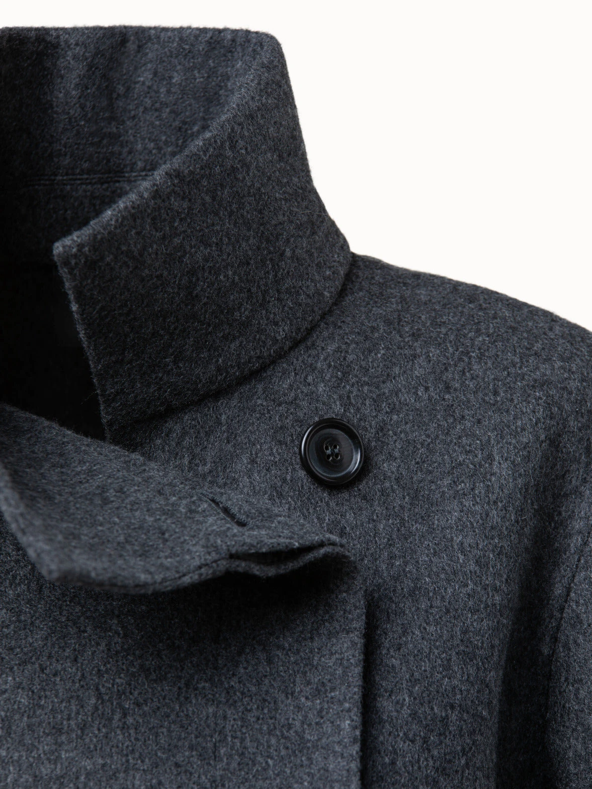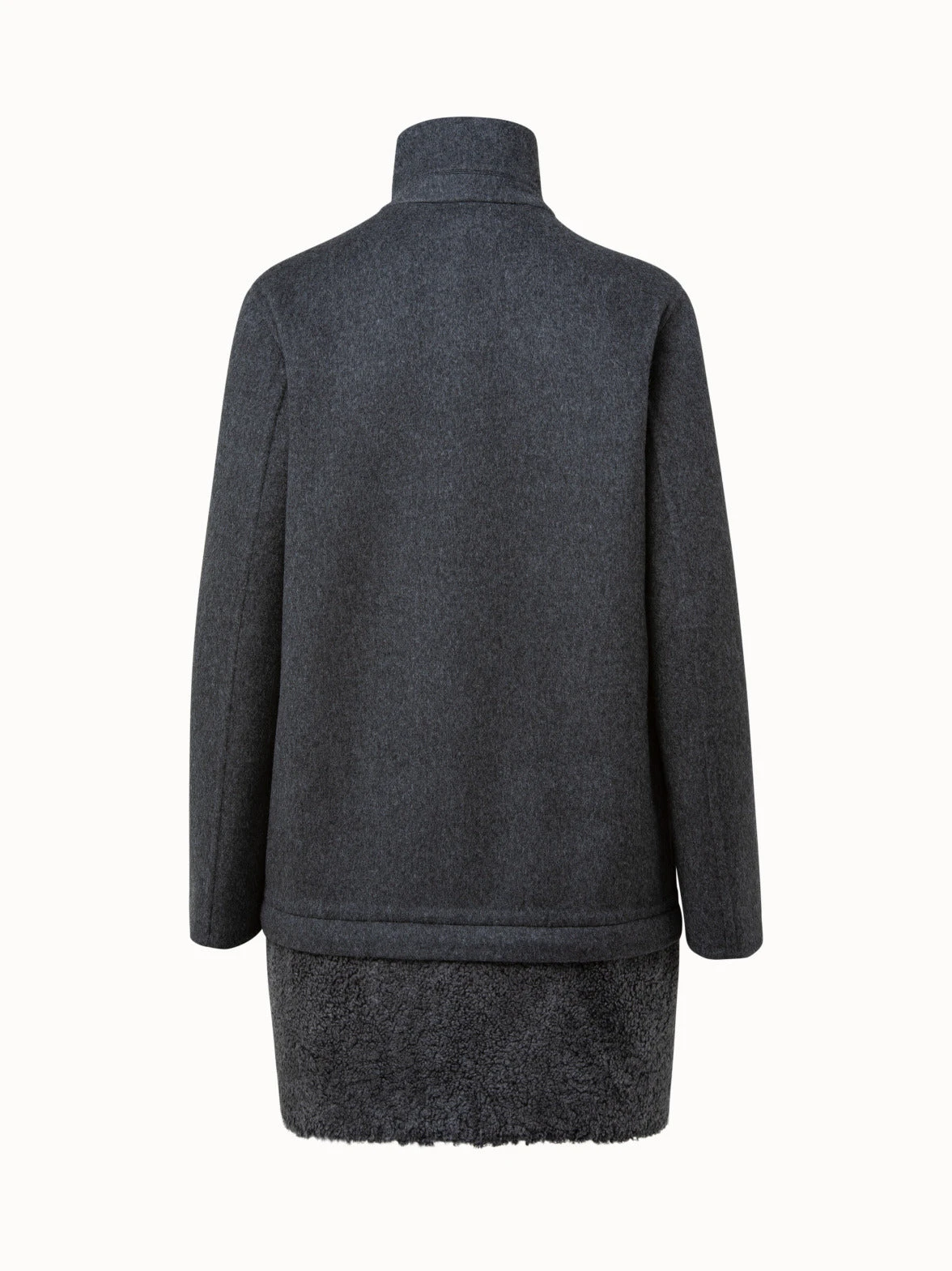 This cocoon style coat in double face cashmere with detachable lamb shearling trim exhibits signature Akris functionality. The stand up collar, covered button closure and pockets create a sleek and cozy silhouette.