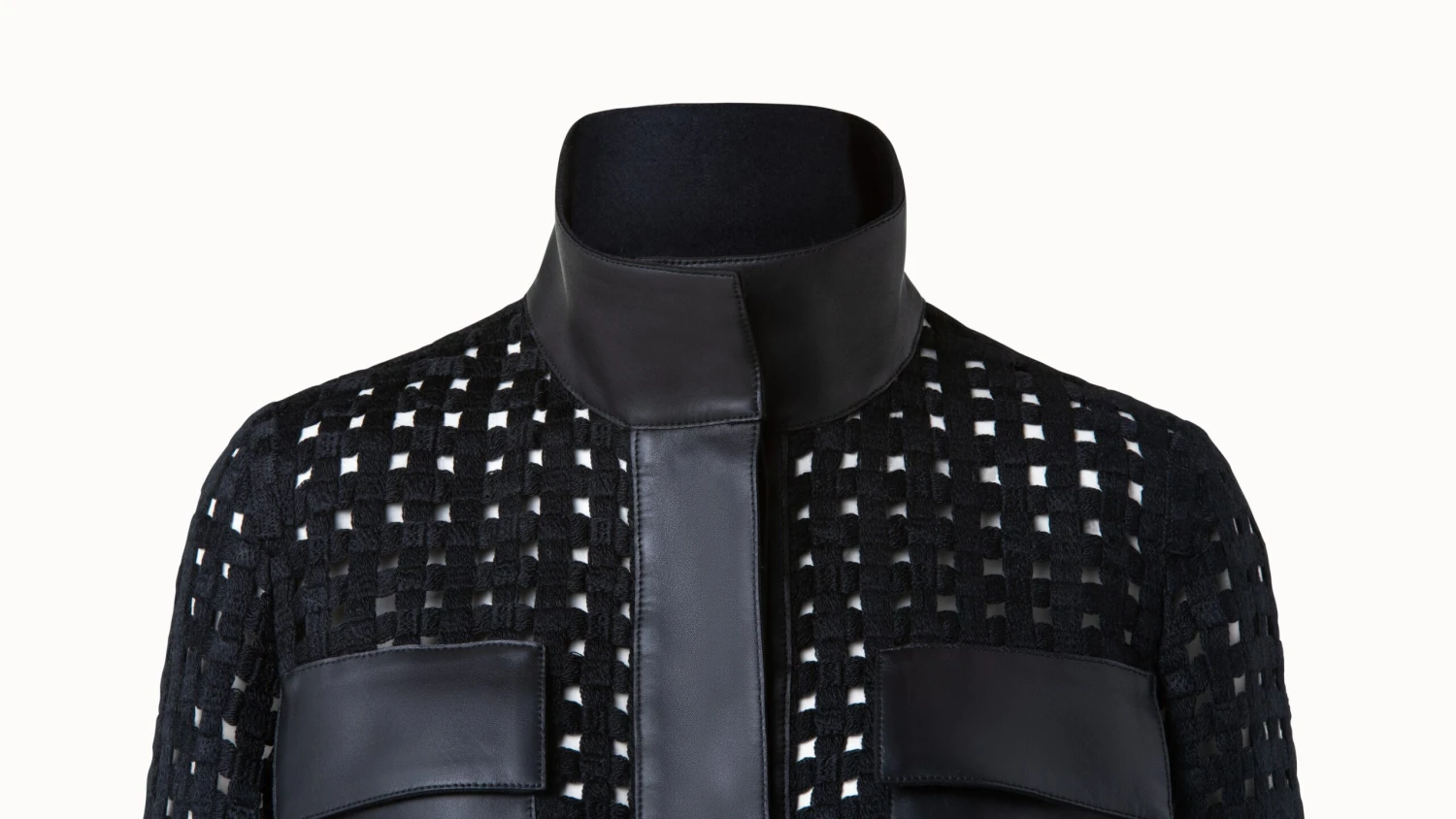 This stunning long jacket is crafted in a wool open grid embroidery with lamb nappa leather trimming. The classic safari-style silhouette is designed with covered button closure, patched pockets, and an adjustable drawstring waist. This style is a truly unique addition to your wardrobe.
