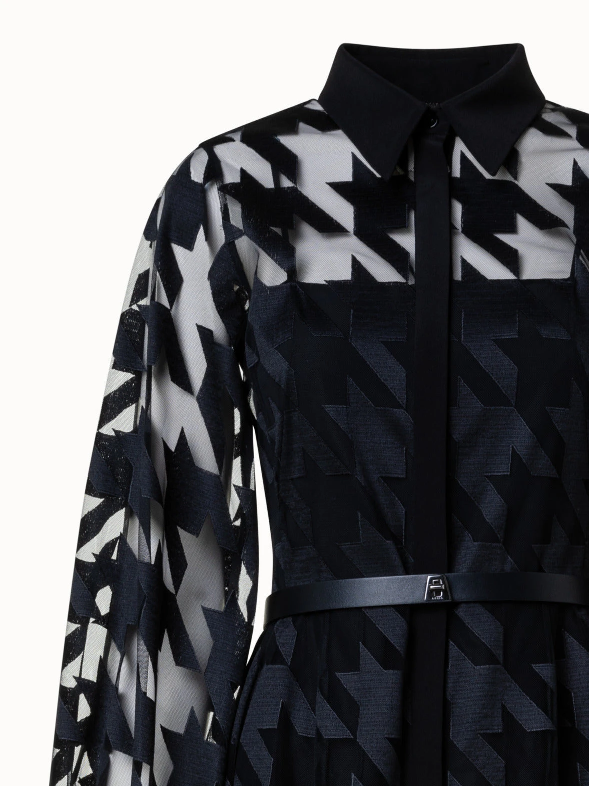 This Akris gown is crafted in an airy, transparent tulle with houndstooth embroidery. The shirt collar and covered button placket create a sophisticated look and various styling options. The included belt accentuates the tailored waist and creates a flattering silhouette together with the A-line cut of the skirt and volume sleeves. Includes a slip dress.