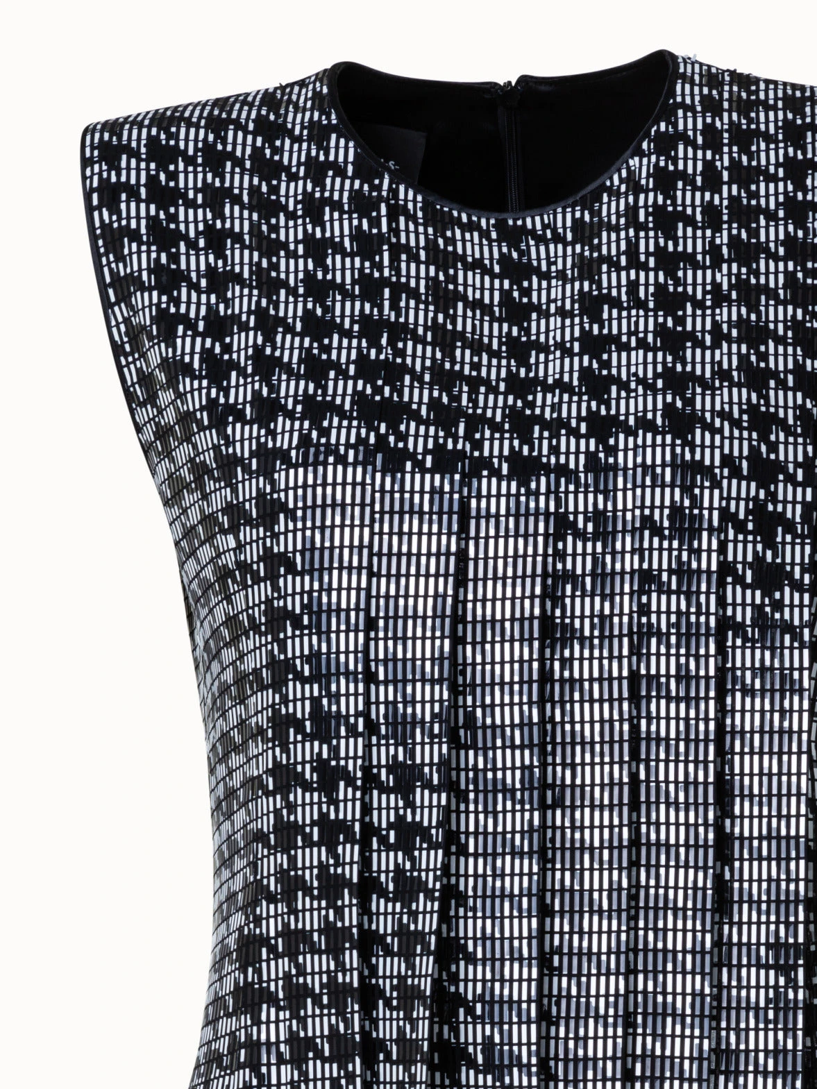 This Akris midi dress is crafted in organza covered with rectangular sequins printed with a houndstooth pattern to create a truly unique look. The dress is cut for a sleek and modern silhouette with an elegant side slit. Closes with a back zip.