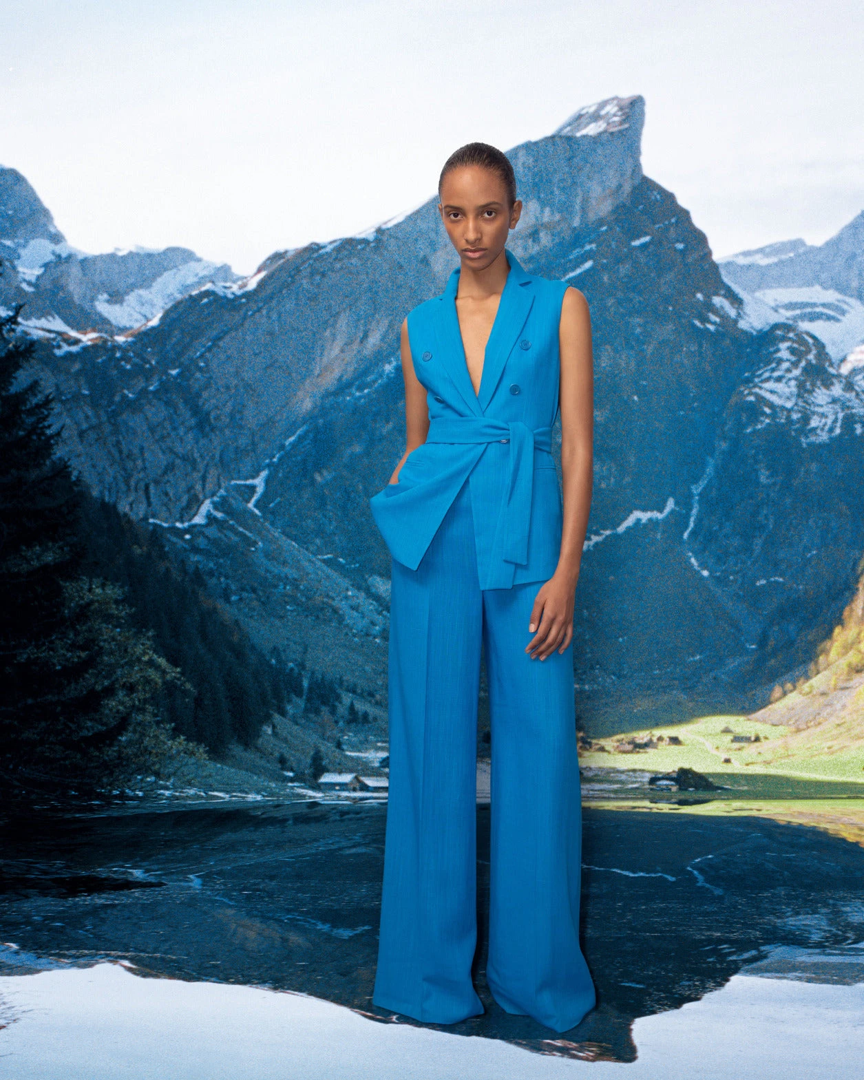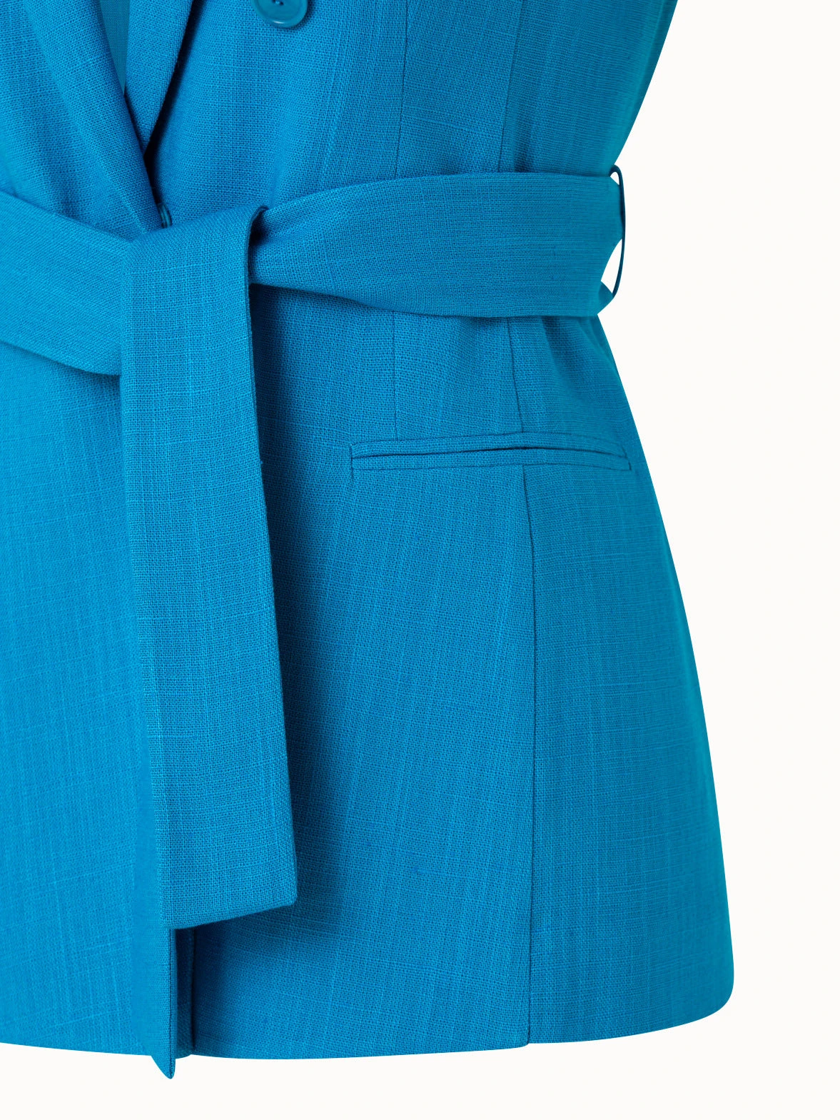 The Akris gilet Georgia is the ideal companion for the summer, when you do not want to give up an elegant look on warm days. Made of an elegant linen wool crêpe double-face, it wears lightly and comfortably. The faux double-breast buttoning with snap closure and a matching belt accentuate the figure and sophisticated look.