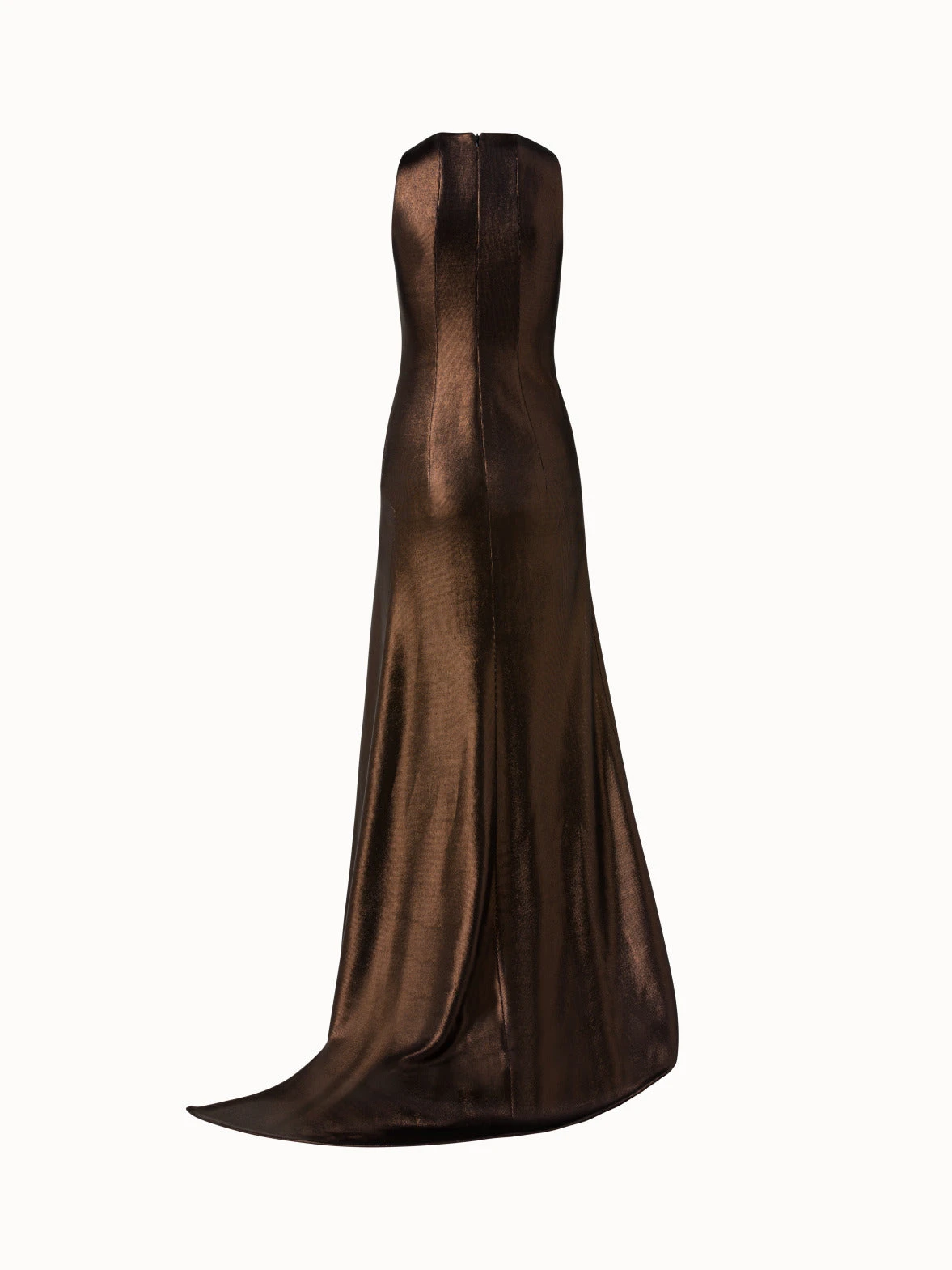 This liquid jersey gown elegantly emphasizes the body with its faux wrap style and falls into a chic a-line silhouette with long train. Designed with a v-neckline and back zip closure. This stunning metallic dress is the perfect choice for the holidays.