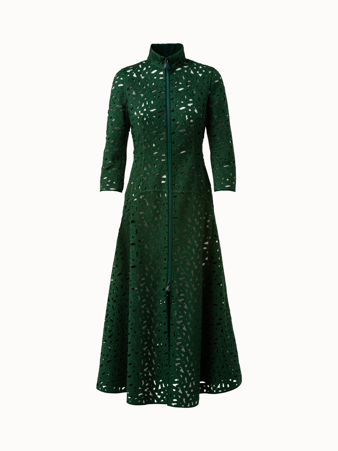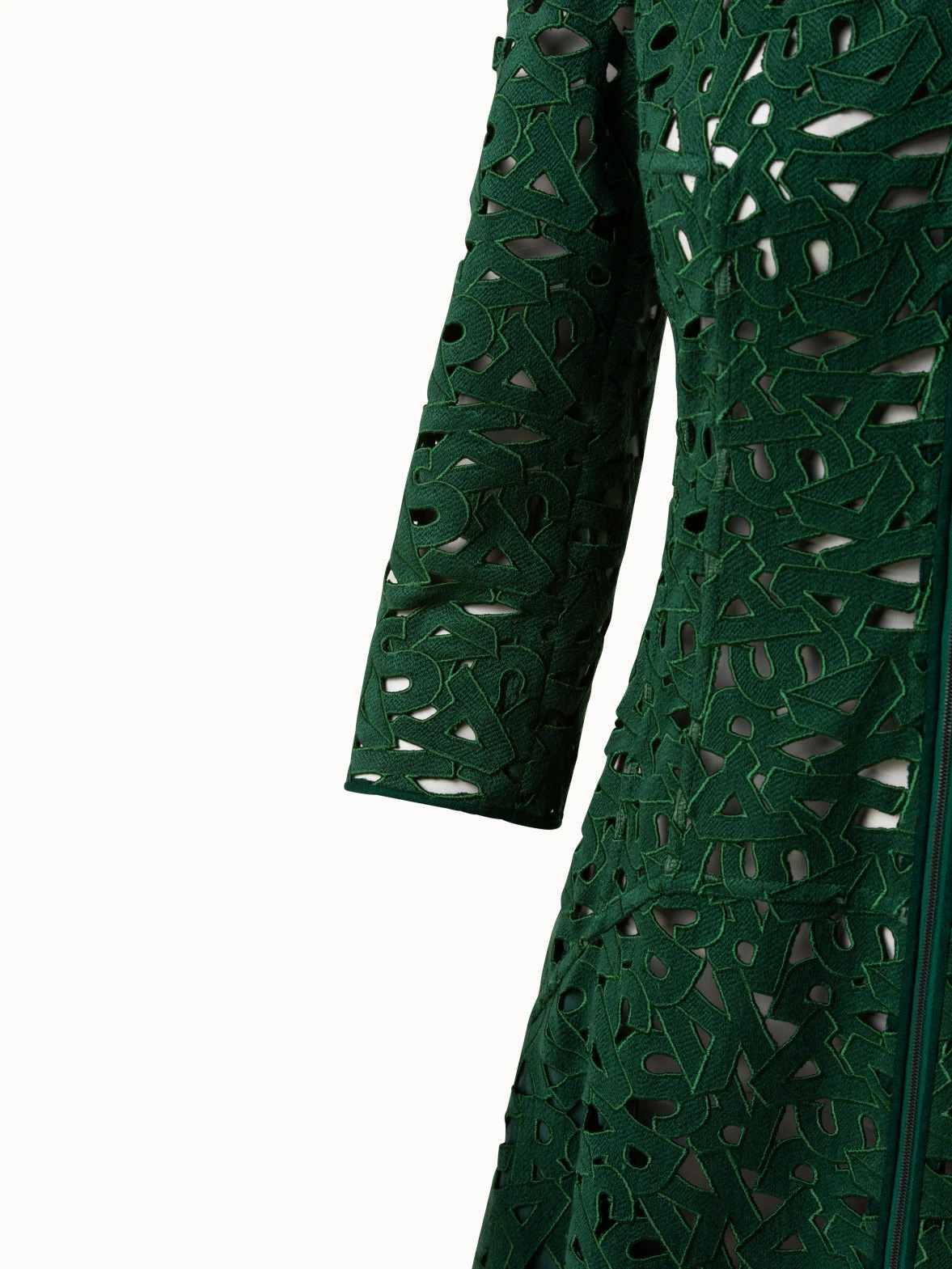 This long dress in second glance embroidery displays exquisite craftsmanship using a centuries old technique developed in St. Gallen. The silhouette hugs the body through the hips and the a-line skirt adds lightness and movement. Features a front zip closure and pockets.
