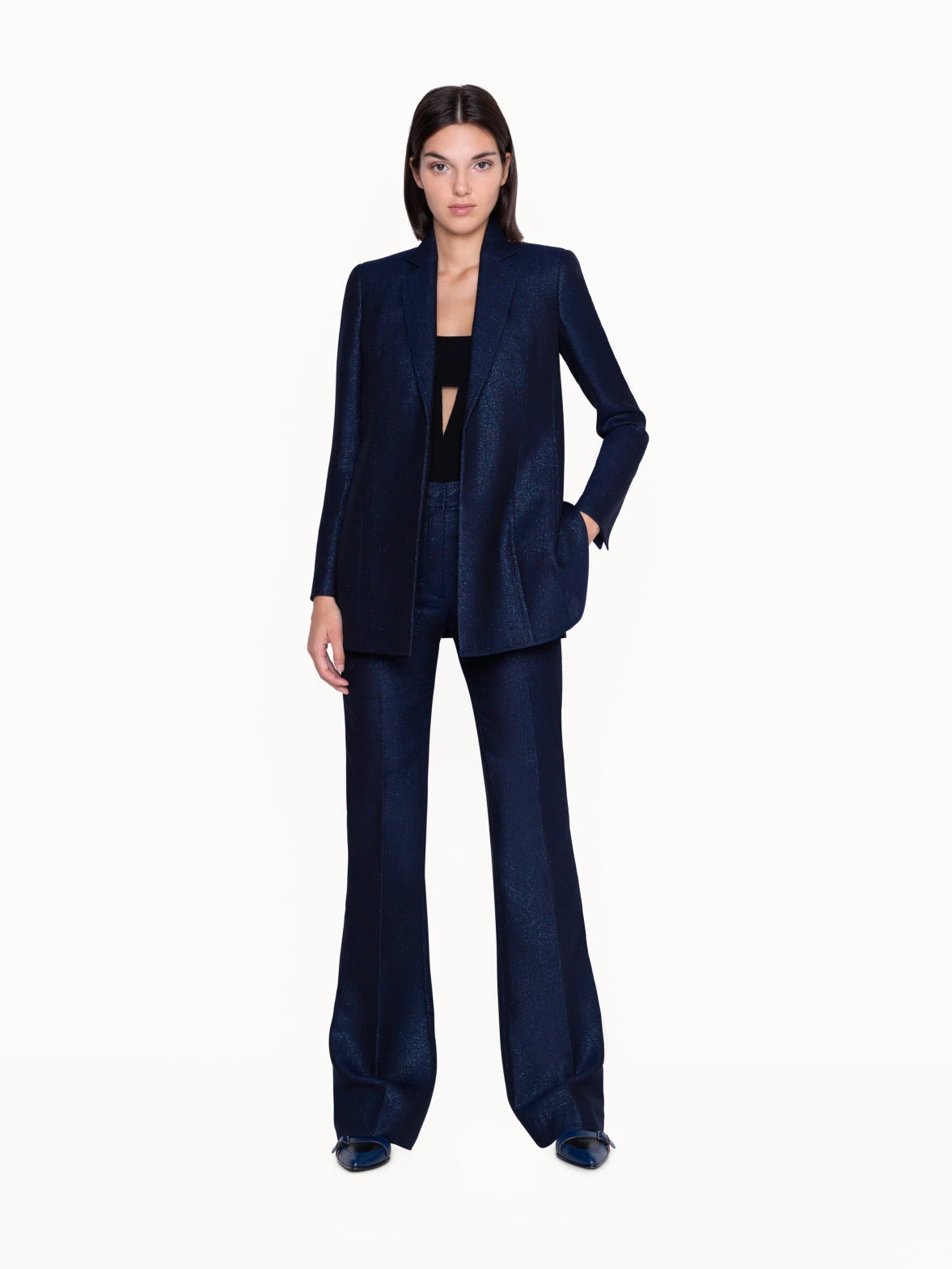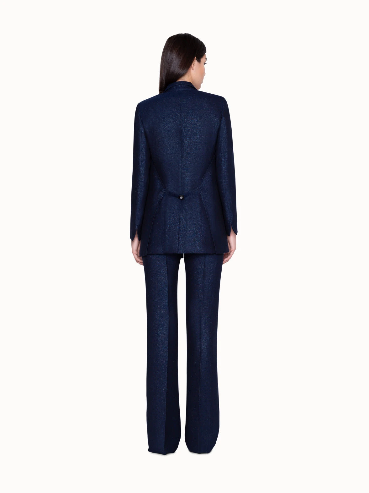 This long jacket without closure will be the perfect companion for an evening out. Build your casual yet elegant outfit with the lurex jacket in wool, which will keep you cool in summer. Features a lapel collar, no closure and a back detail with the Akris’ signature AI trapezoid,