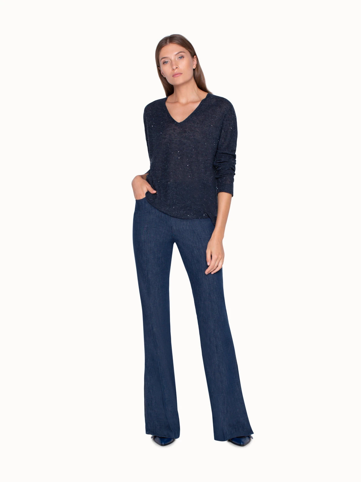 Feel the softness of linen with this designer pullover. The starry design makes it trendy while remaining discreet. Casual elegance at its best. Features a v-neck and will be easy to mix and match, for example with wide leg pants in navy.