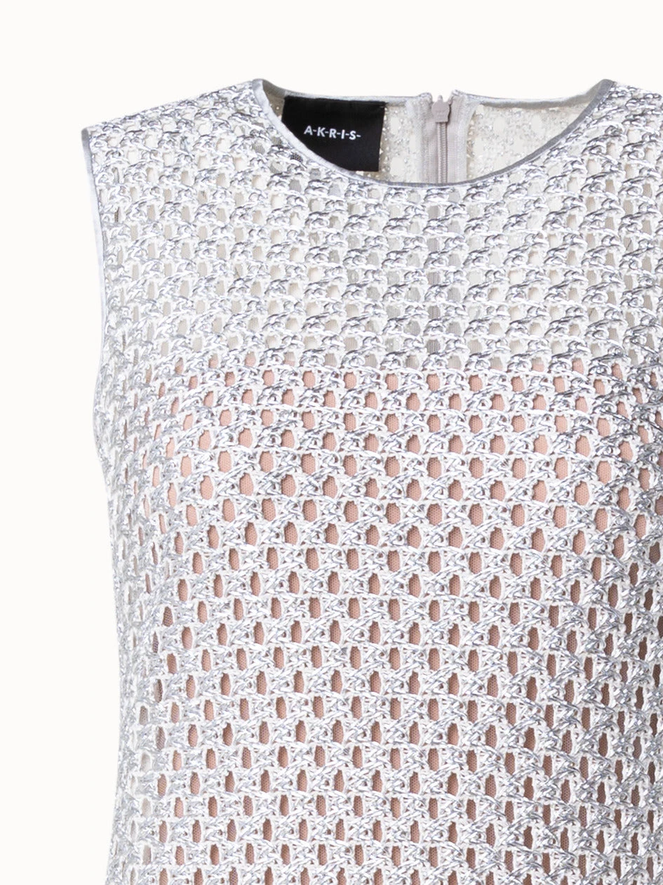 gown, lurex cotton metallic crochet embroidery, round neck, side slits, sleeveless