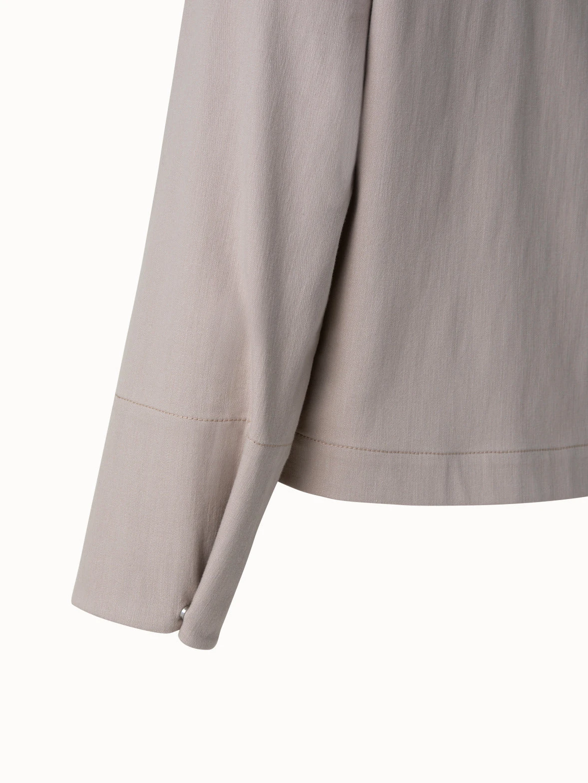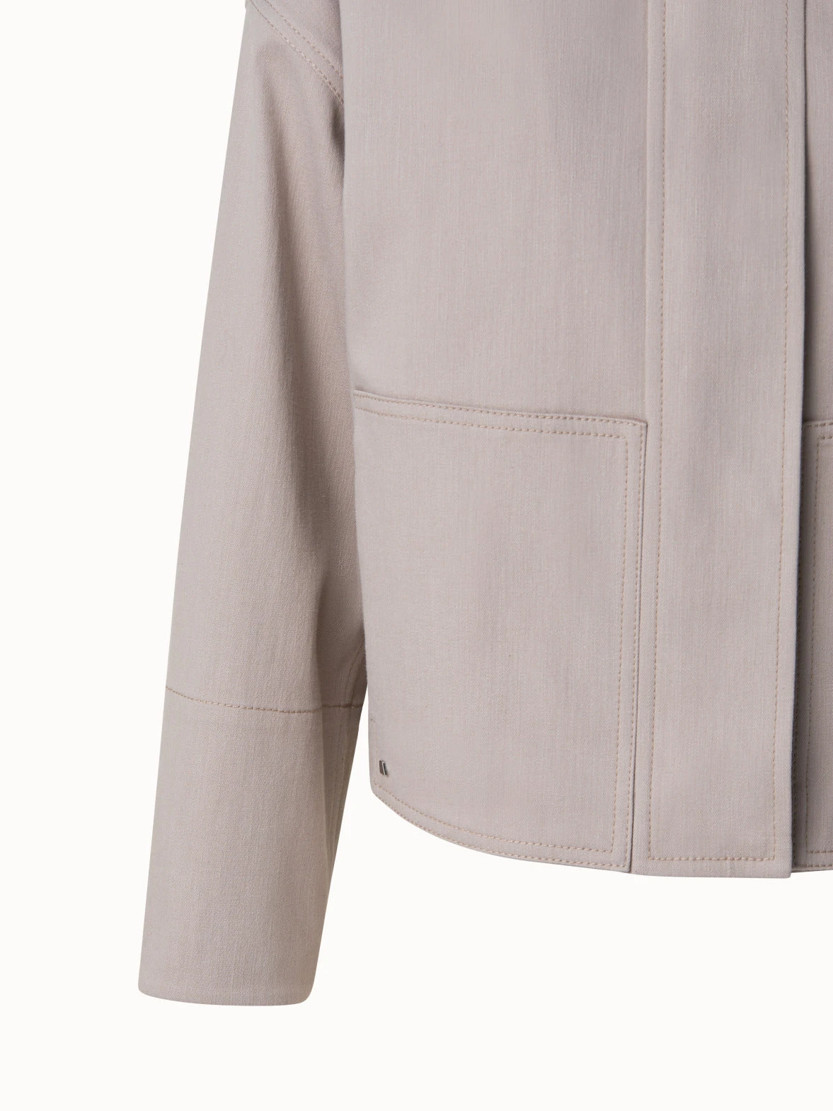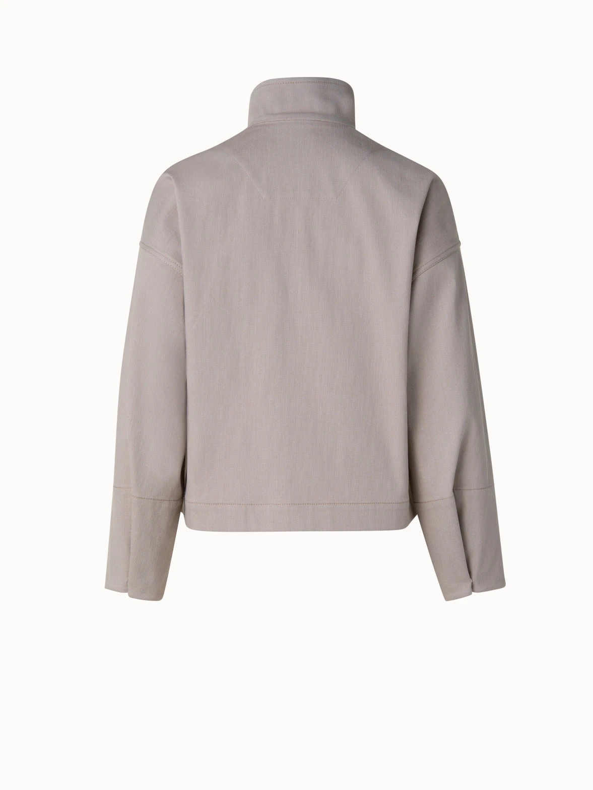 Sporty short jacket in cotton denim stretch with roomy fit and dropped shoulder has stand up collar, zip closure, patch utility pockets and long sleeve with press button detail.