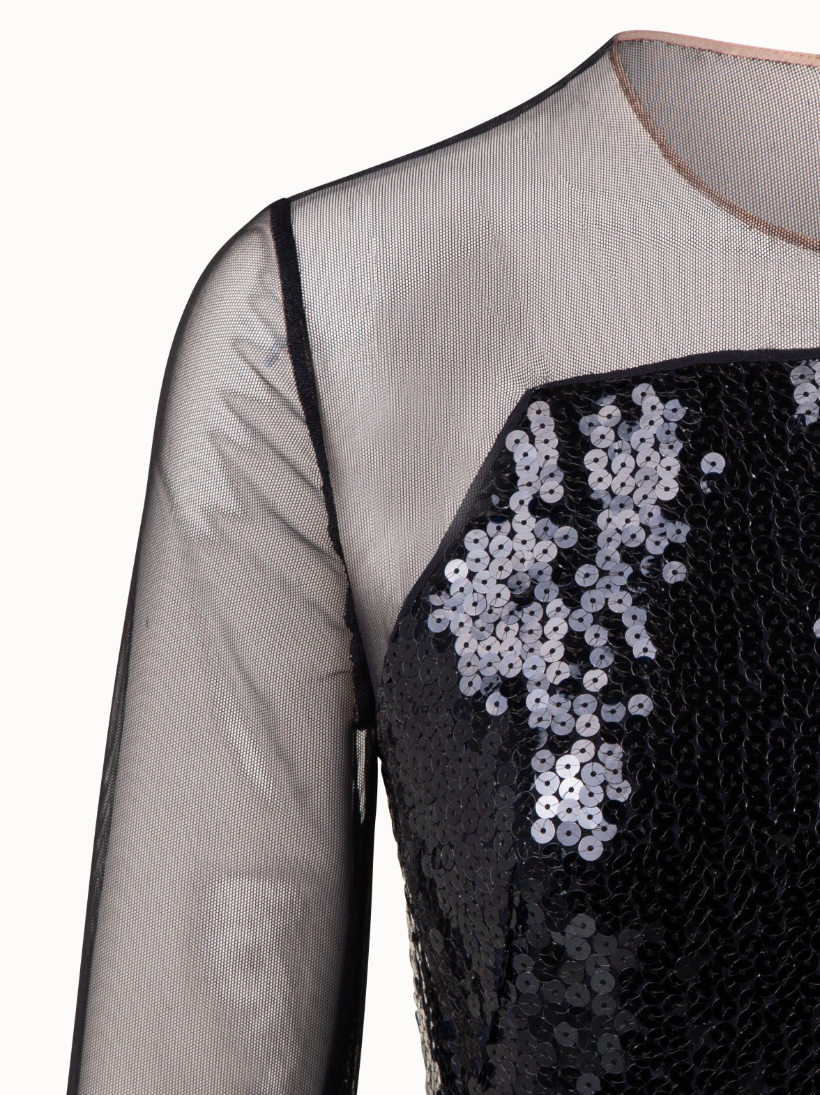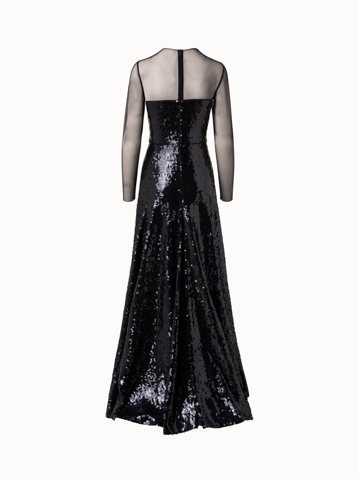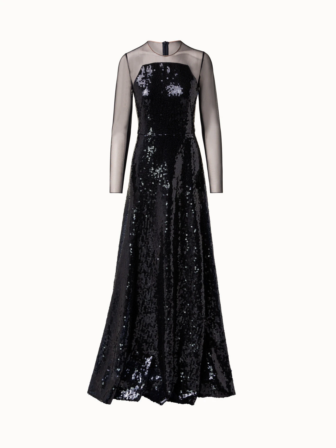 Make a statement in the Akris gown. Crafted in sequins on silk, it is equally elegant and extravagant. The long sleeve tulle shoulder panel features a round neck, while the sequin bodice is cut in a sharp apron shape. The A-line skirt creates shimmering movement with every step.