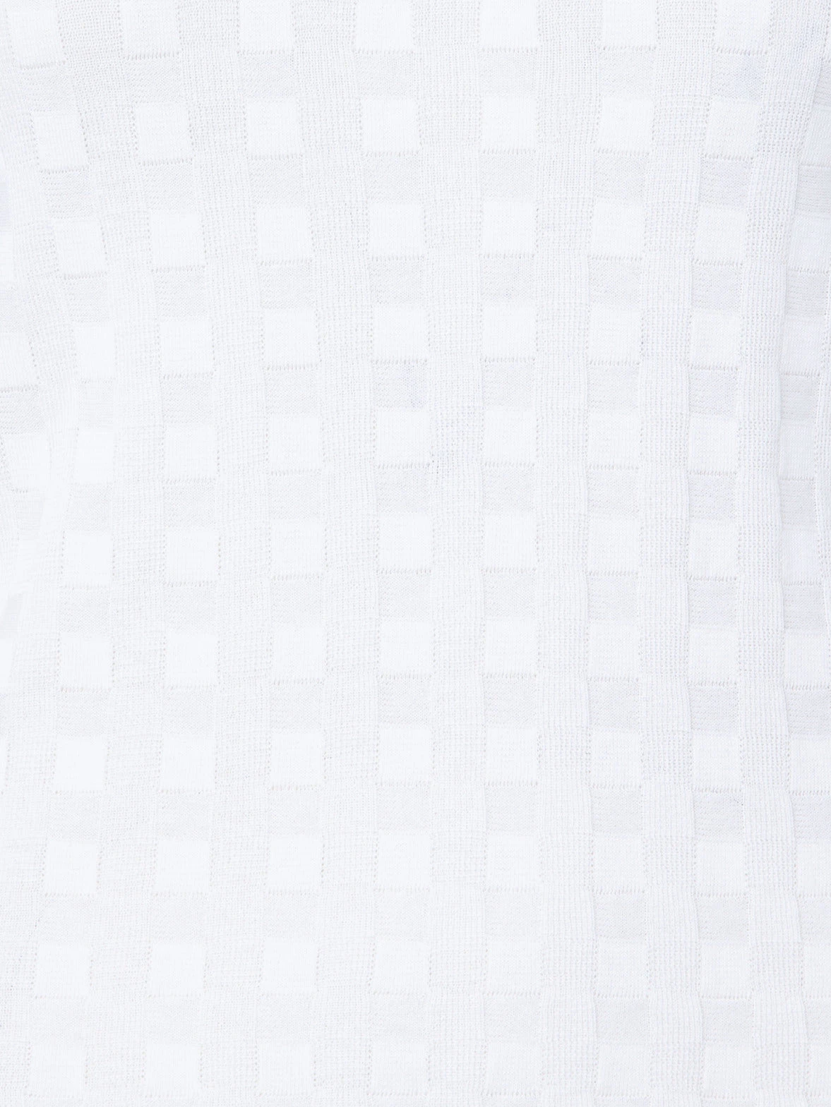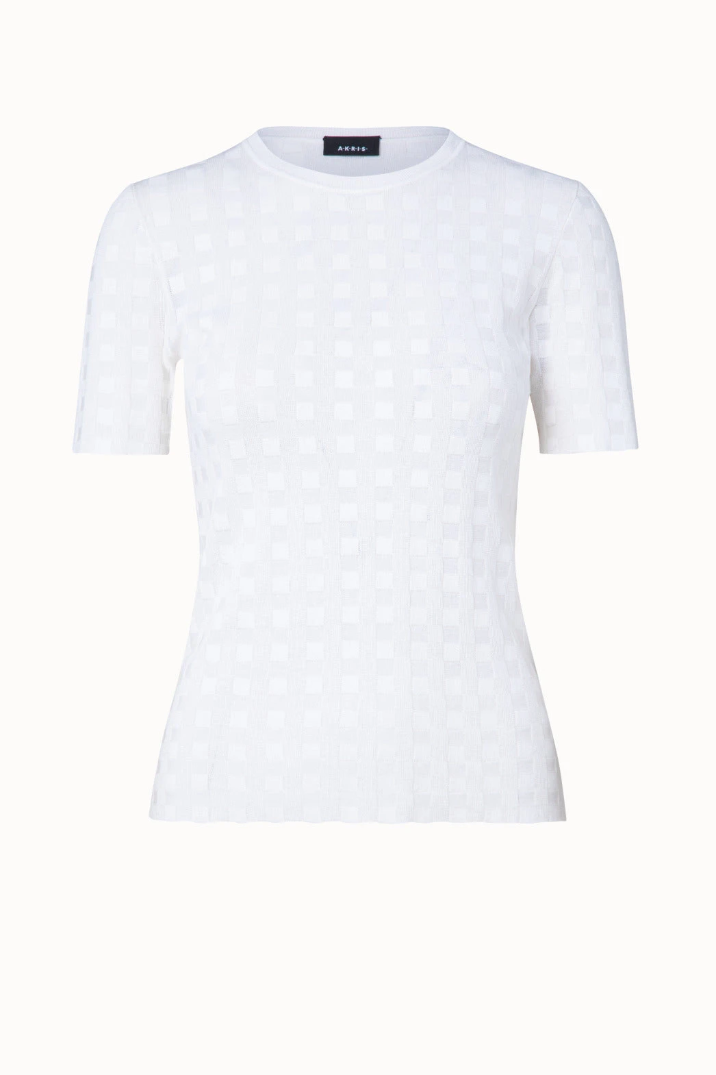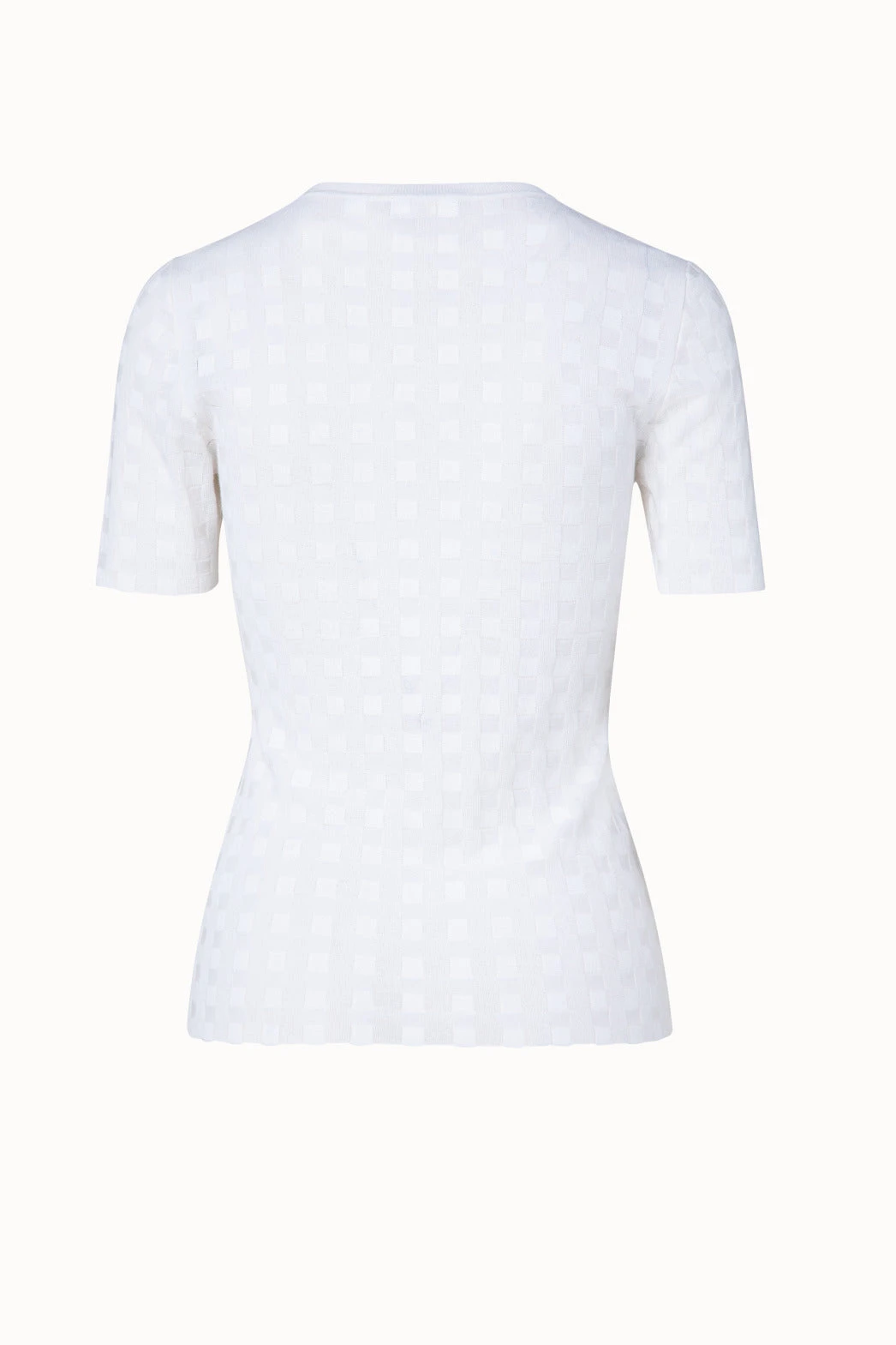 This short sleeve Akris pullover is crafted in a silk and cotton blend square jacquard knit. The intricate fabric elevates this essential to create a sleek underpinning and stand-alone piece for spring and summer.