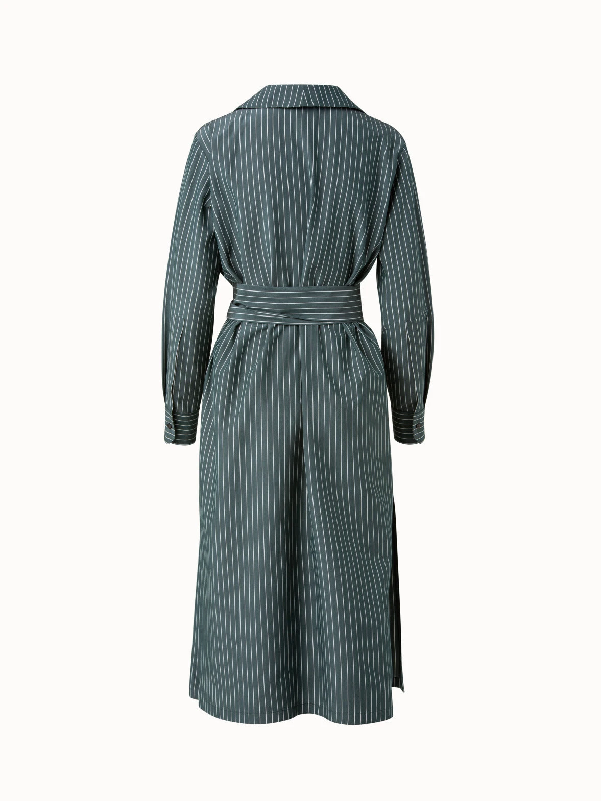 This easy going shirt dress in striped silk crêpe features long front sashes that can be wrapped around for a more defined shape. Adjustable zippers at the waist provide a functional detail and the slide slits allow for easy movement.