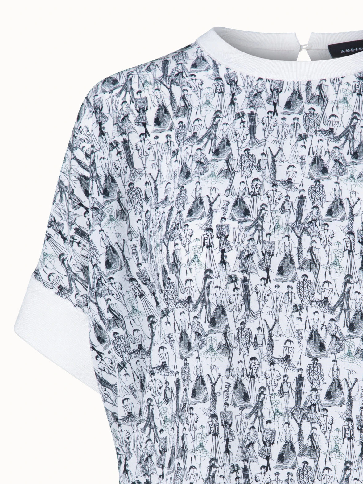This Akris tunic features a knit back and silk crêpe front with Croquis print. It is cut for an oversized silhouette with a boat neck and ribbed cap sleeves.