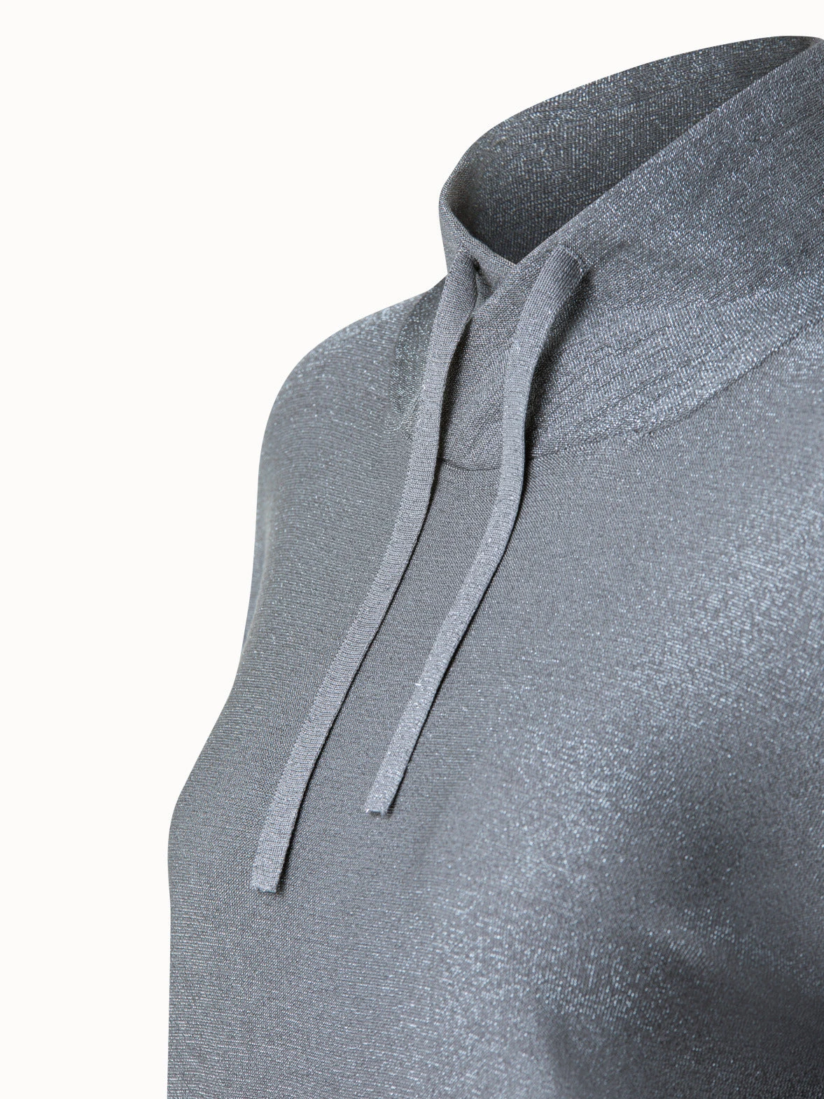Subtle lurex threading adds instant novelty and shine to this silk knit pullover. The sporty yet elegant style is designed with a drawstring cowl neck and ribbed hem.