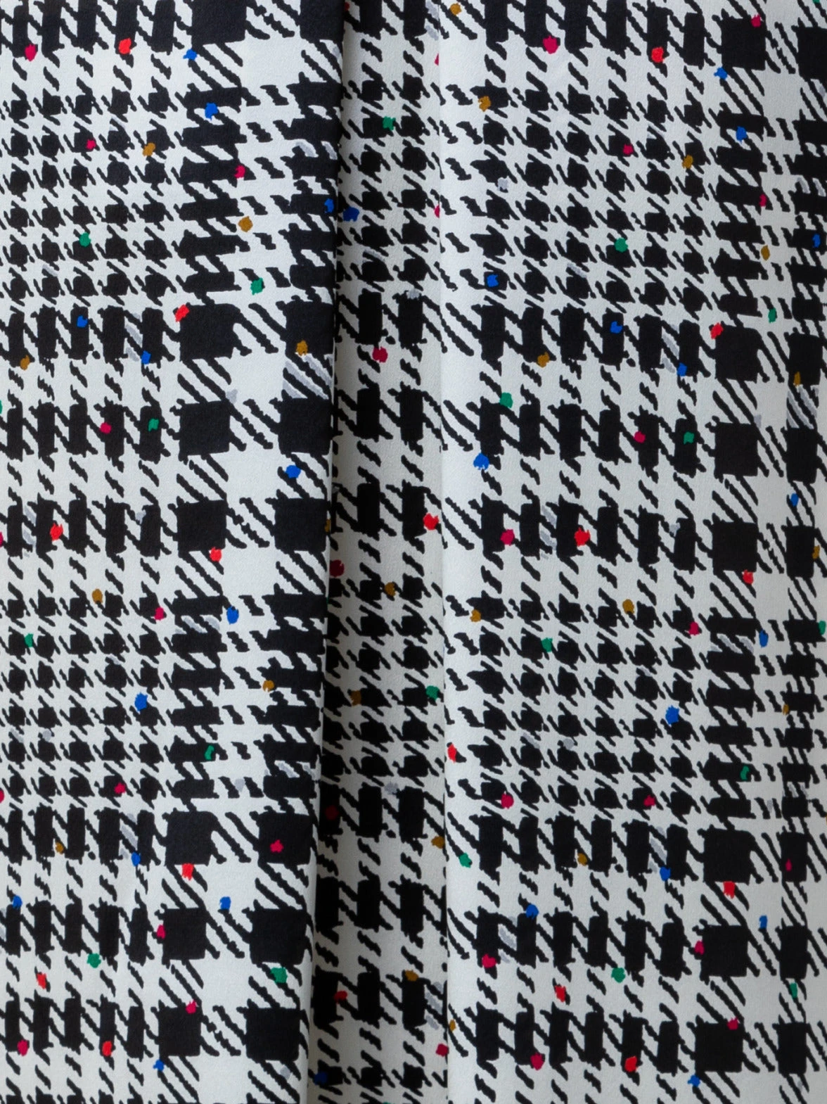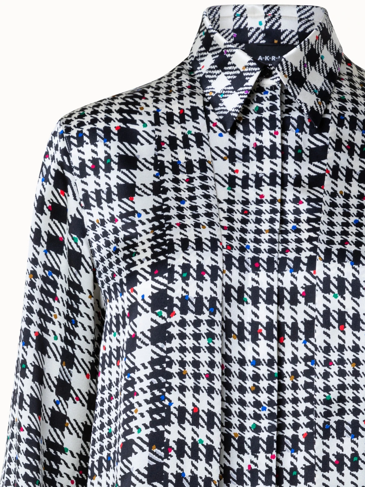 This Akris shirt dress is crafted in flowing silk satin with a tweed check print and subtle color splashes that add a playful touch. The shirt collar and covered button placket create a sleek look, while the back pleat and side slits add volume and movement to this airy silhouette. Includes a detachable bow.