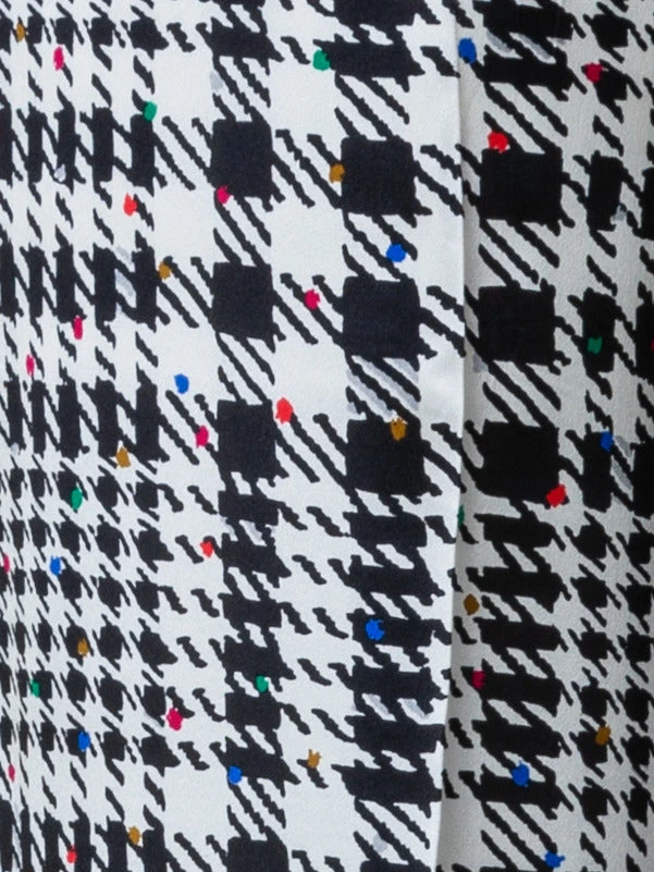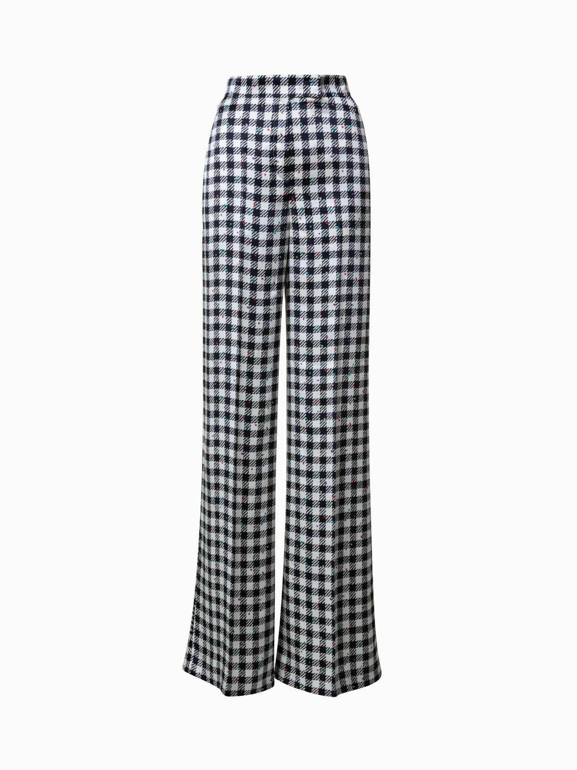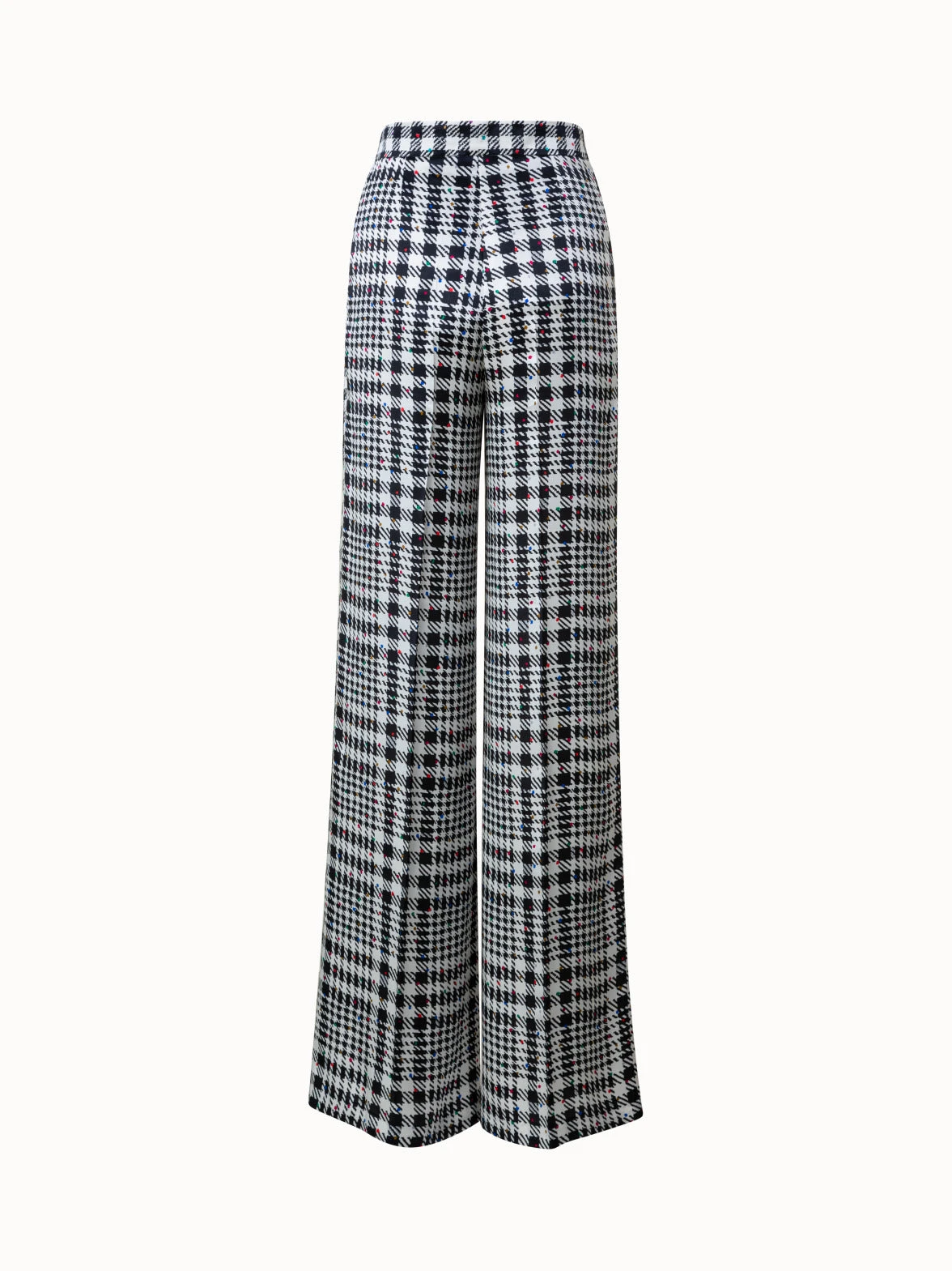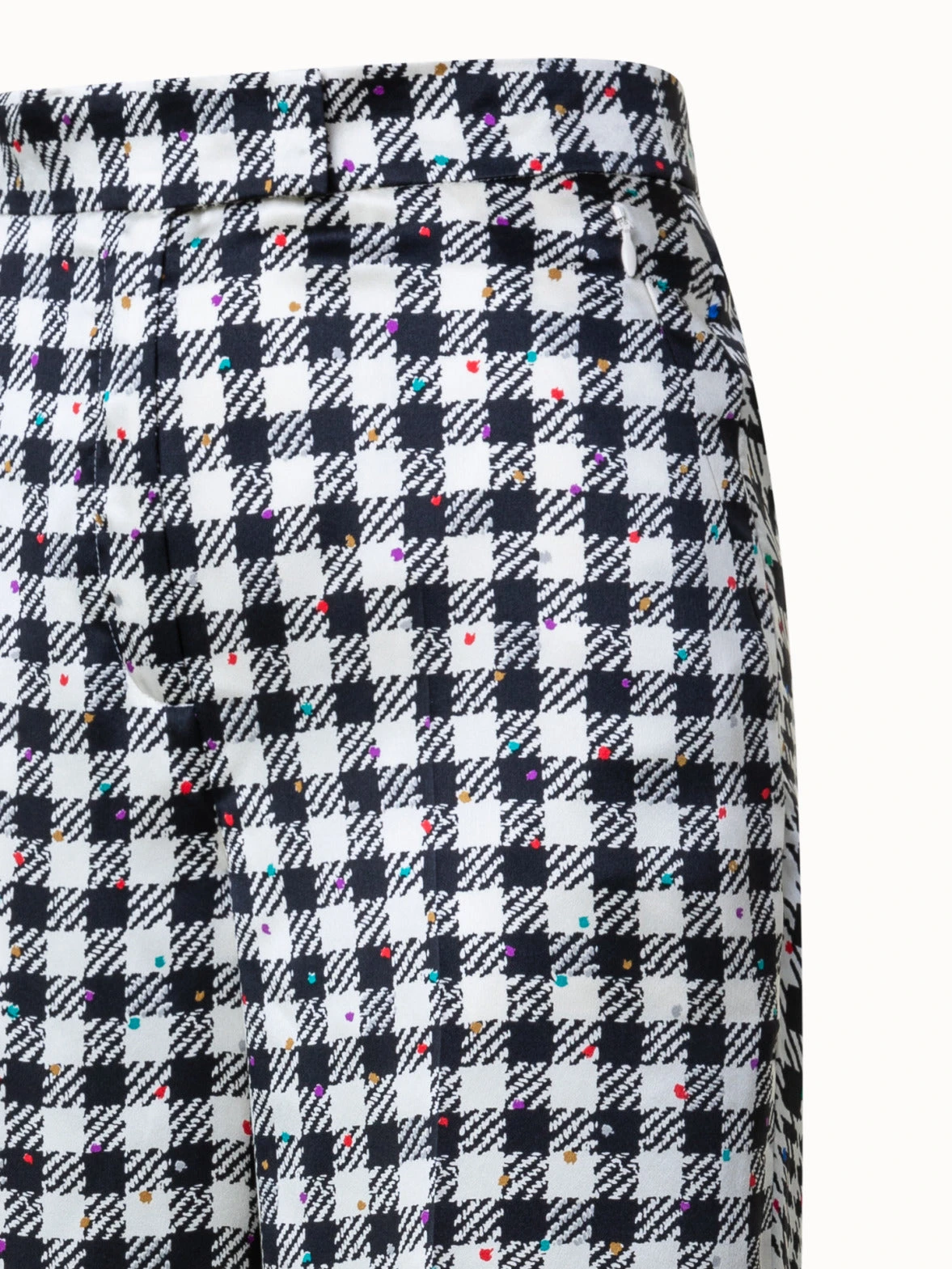 These Akris FLORETTA pants are crafted in lightweight silk satin with a tweed check print, making them perfect for spring and summer while creating an elegant look for many occasions. Small color splashed in the print add a playful touch. These pants are cut with a high rise and wide leg for a flattering silhouette and modern style. They feature a front closure and zip pockets.