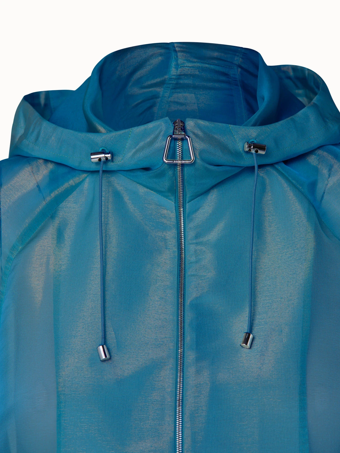 This Akris Grazielle blouson jacket is made from silk techno iridescent organza. It has a voluminous silhouette with raglan sleeves and patched pockets that are emphasized by a drawstring at the hem. It features a stand-up collar, a concealed hood, and front zip fastening. The ideal versatile option to dress up or down and a light layering piece for spring and summer.