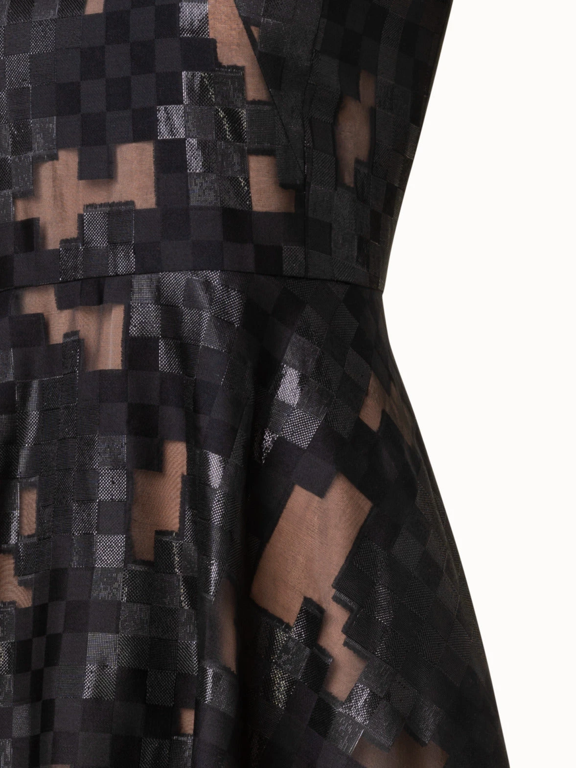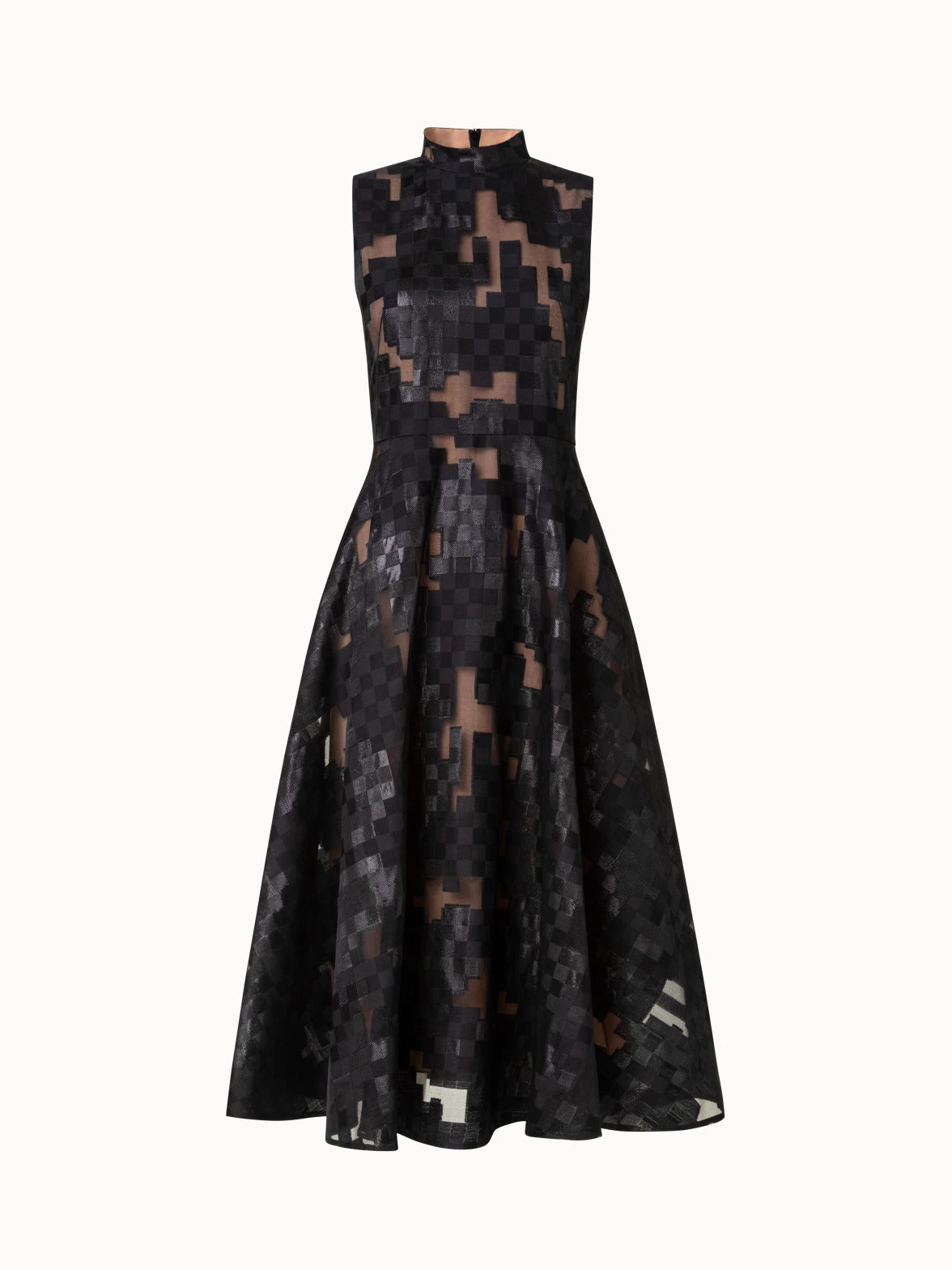 This Akris Midi Dress is crafted in a Square Jacquard made from wool, viscose, silk, and lurex, creating a pixelated look that plays with structure and implied transparency. Featuring a mock neck, fitted body, and A-line skirt, the dress creates a modern, flattering look. Closes with a back zip.
