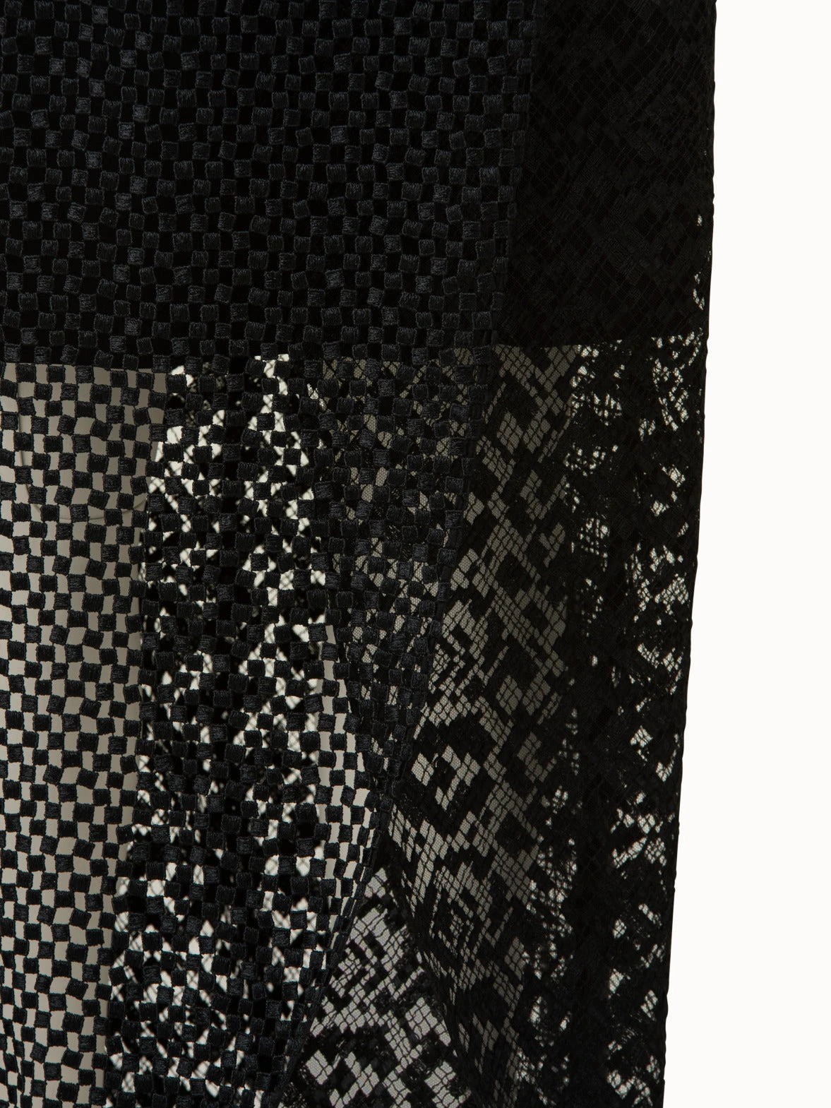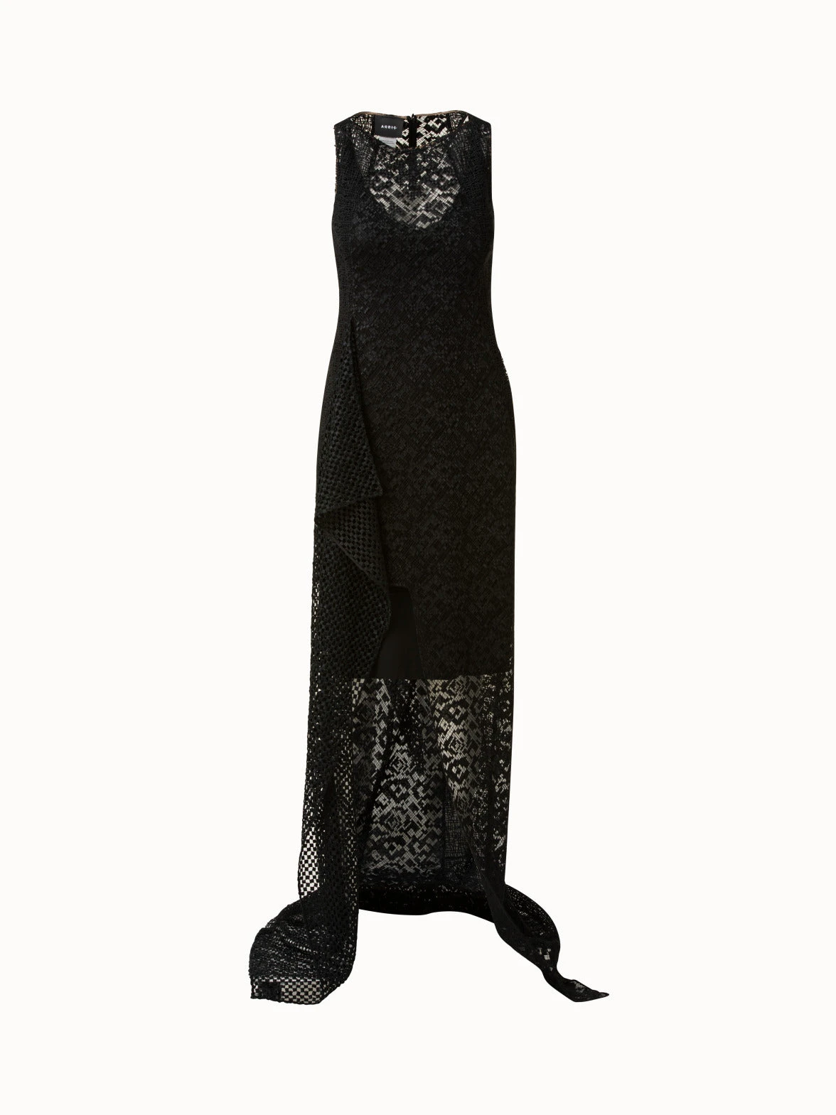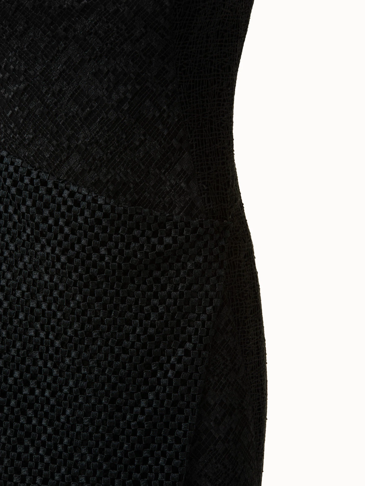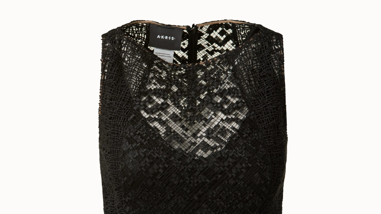 Akris’ expertise in craftsmanship shapes this gown from lightweight techno embroidery patchwork and molds it to the body with an elegant boat neck and a front apron panel ending in a train that moves beautifully as you walk. The nude lining provides coverage and peeks out delicately from under the sheer fabric.