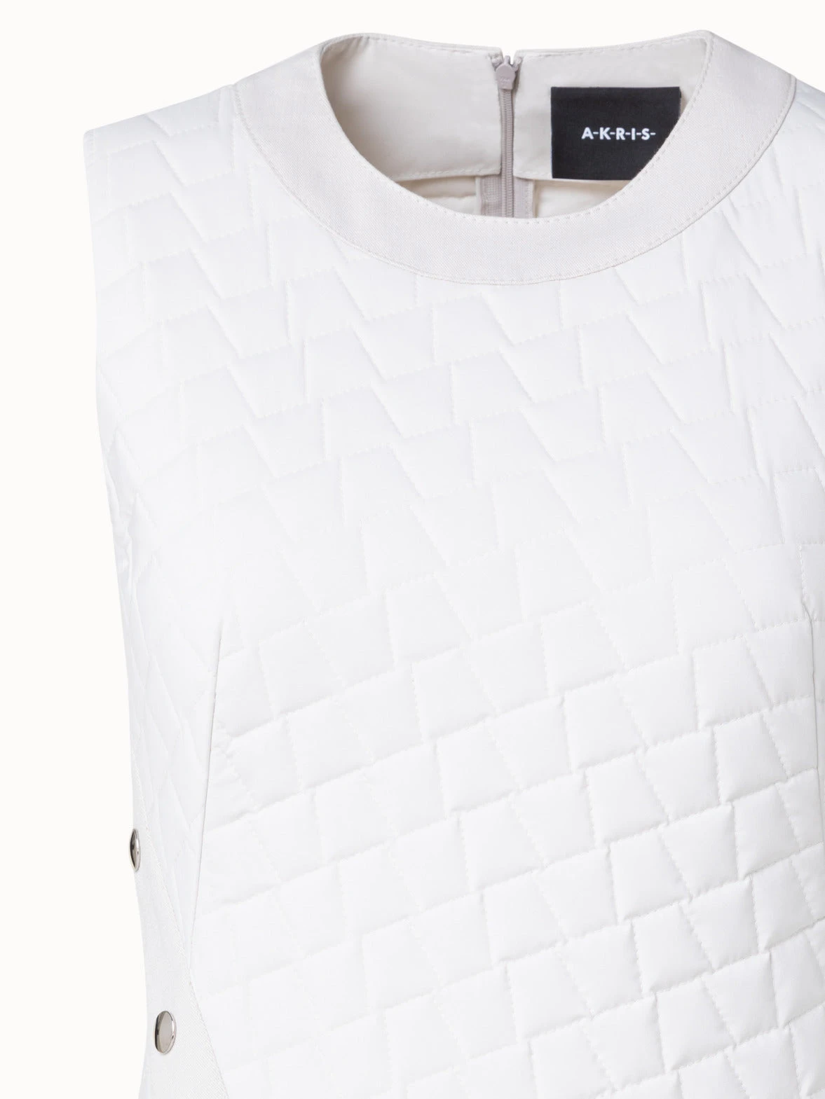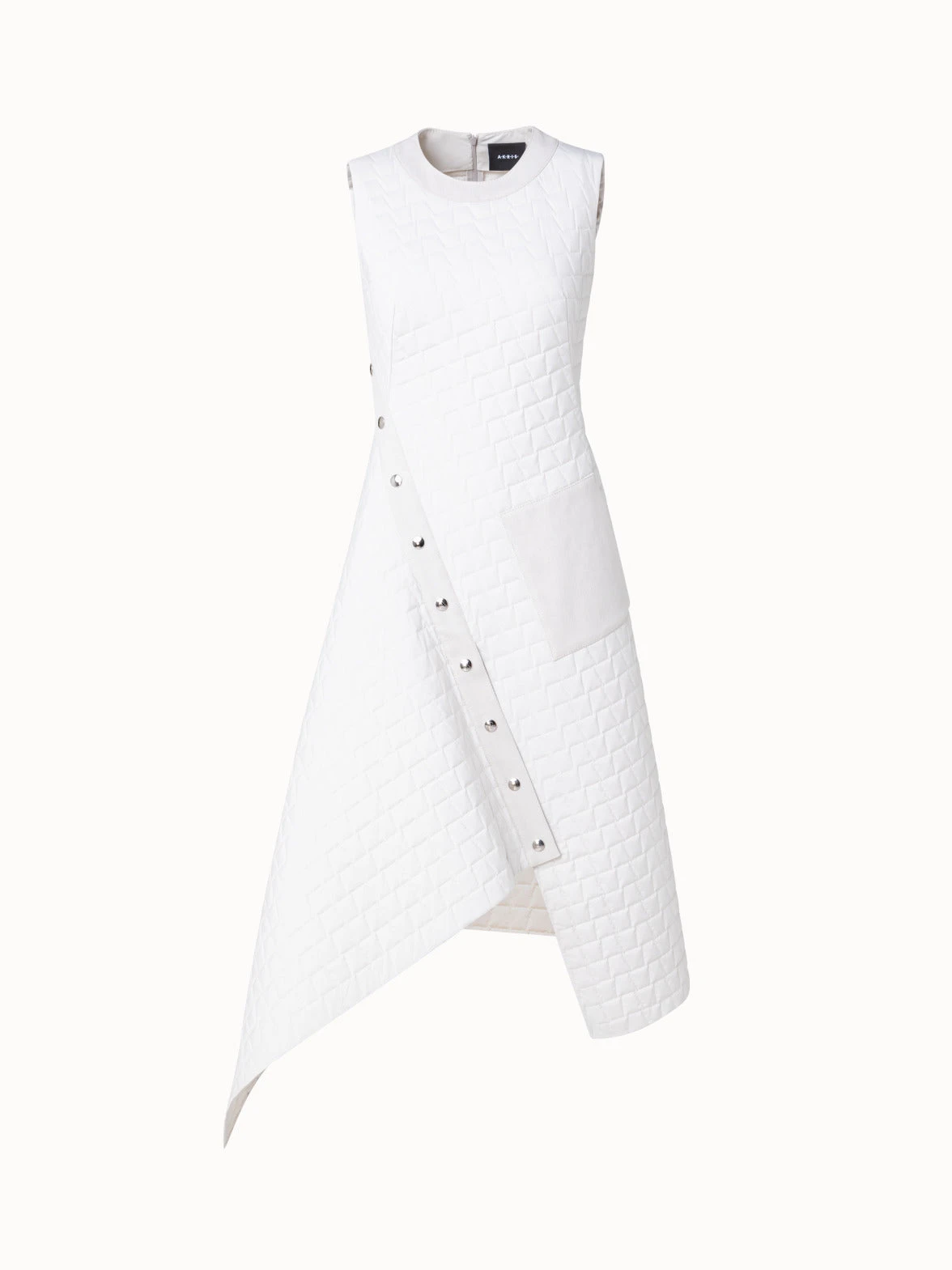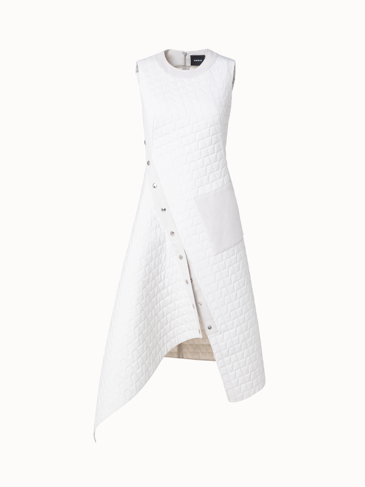 This Akris dress showcases the signature Akris trapezoid as a modern techno taffeta quilt. The denim trim and pocket add a casual touch. The asymmetrical shape can be adjusted with the front buttoned slit. Features a back zip.
