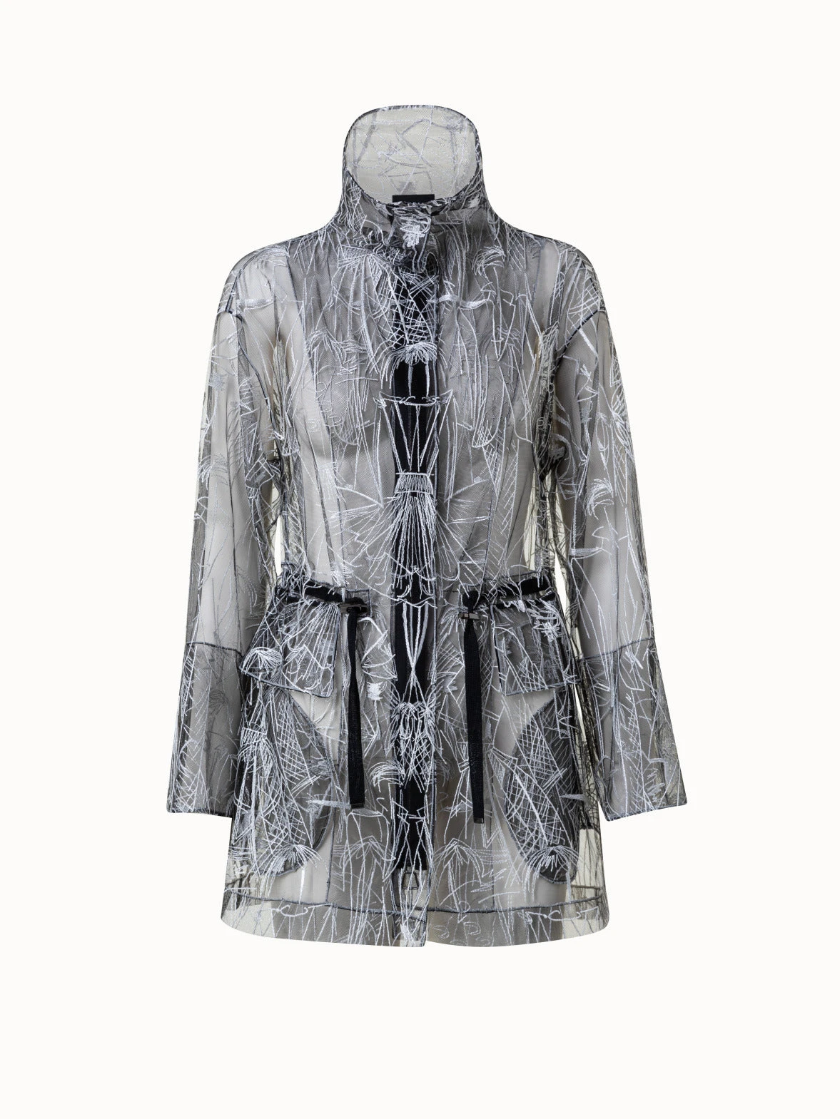 Using a transparent techno tulle as the base for the embroidery, this Akris parka is a light layering piece, perfect even on warm days. It features a stand-up collar and drawstring at the waist. Pockets ensure functionality. “