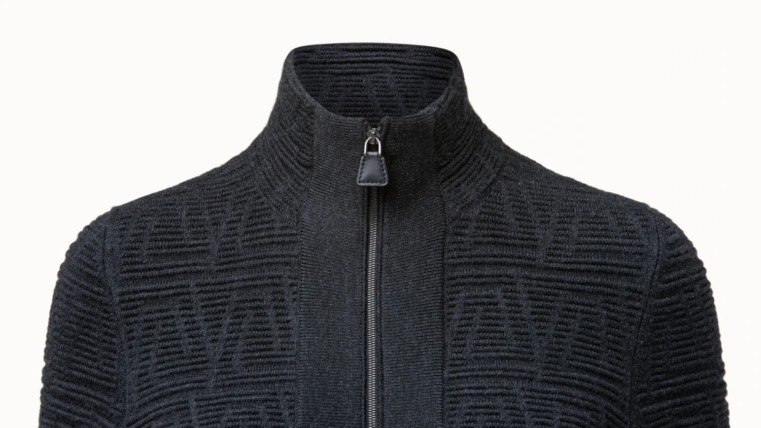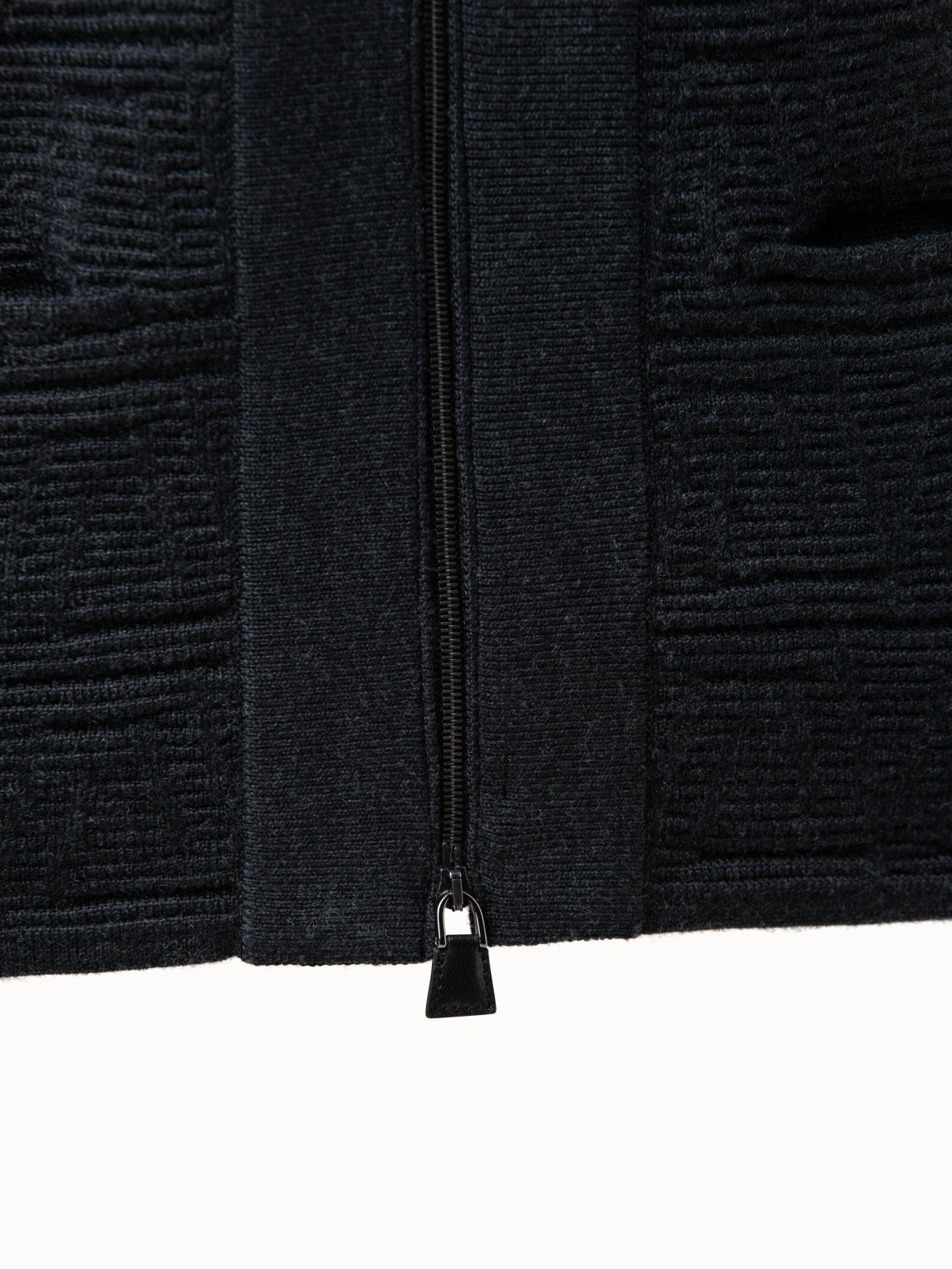 This cardigan knitted in wool silk stretch has an interesting trapezoid maze jacquard structure. The fitted shape features a stand up collar, double zip closure, slash pockets and long sleeves.