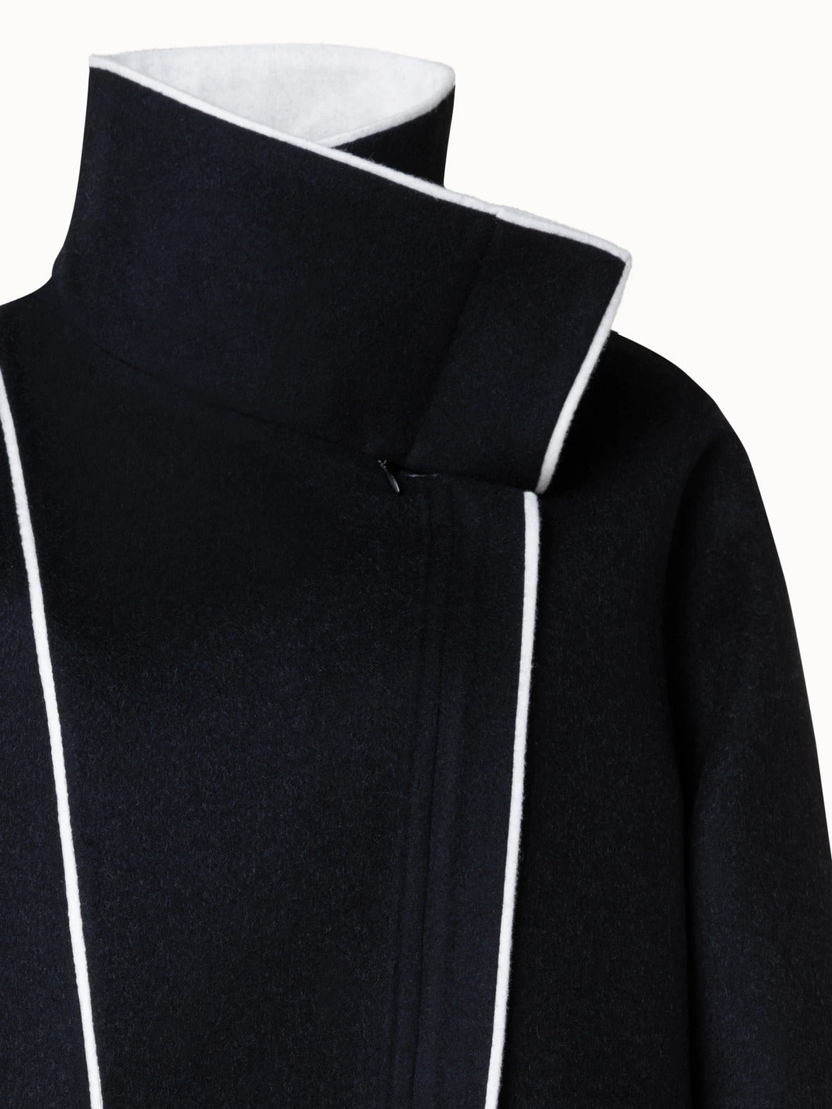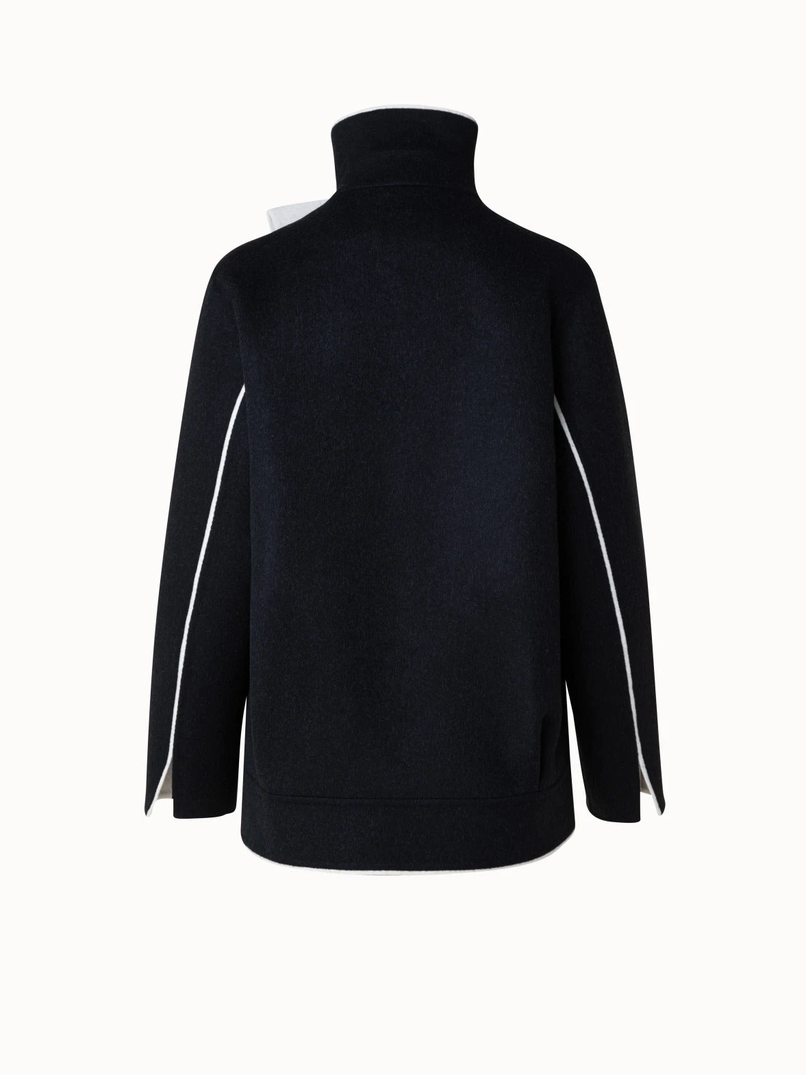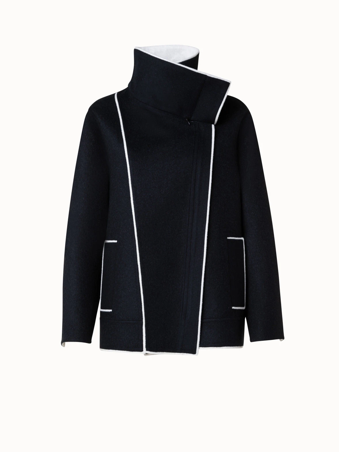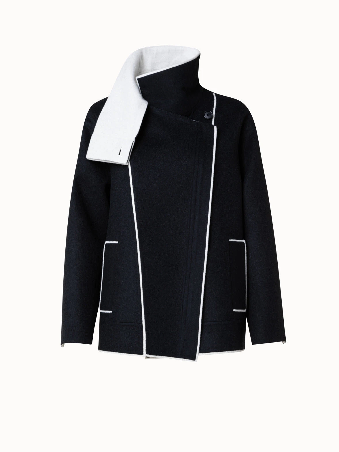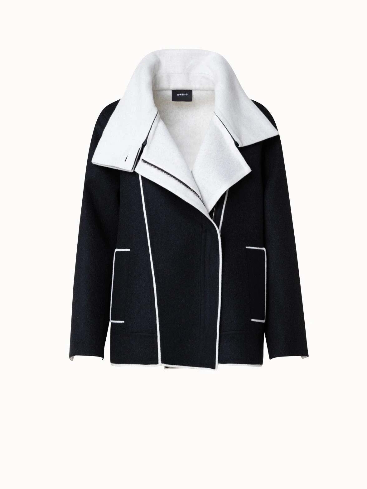 This Akris jacket is crafted in two-tone double-face made of wool and cashmere. A contrast edge highlights the asymmetrical zip closure, stand-up collar, and pockets. Cut for an oversized fit that creates a contemporary silhouette.