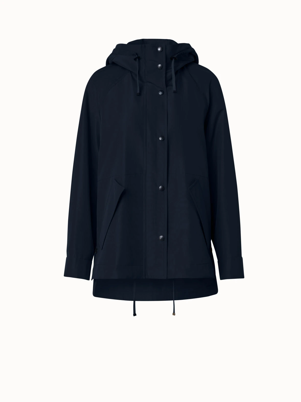 This Akris jacket Palina is crafted in waterproof Ventile® cotton, making it a sustainable outdoor style to protect you from the elements. This parka is cut for a slightly oversized fit with a longer back and snap buttons on the bottom of the side seams that can be opened to add volume and let in air. The front bottom seam and hood feature drawstrings to perfect the fit. The front zipper is hidden behind a snap button flap that keeps water out. Two pockets add additional functionality.