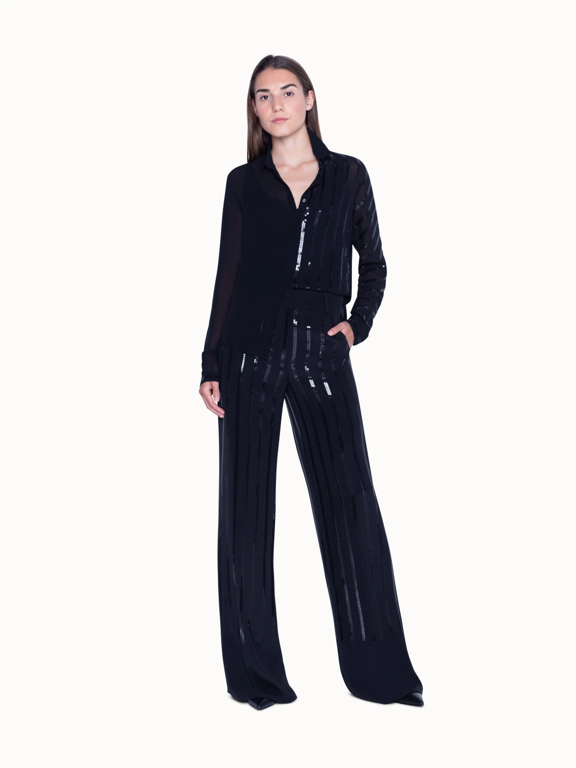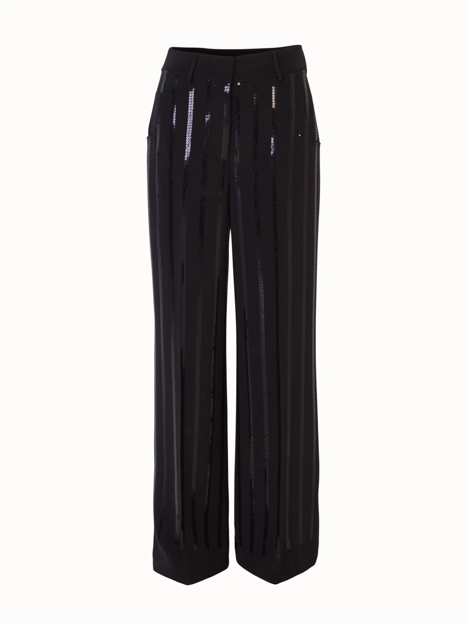 Crafted in luxurious stretch silk and adorned with sequin stripes, these high quality pants are comfortable and chic. The high-waisted fit and flared wide leg silhouette are also incredibly flattering on any woman. Features a front zip and pockets. Wear yours with an Akris silk crepe blouse for an “ahead of the curve”, show-stopping evening look.