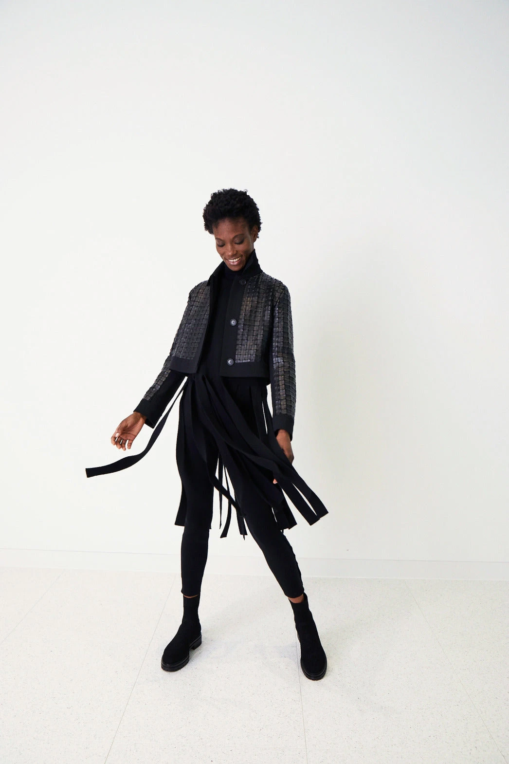 This Akris short jacket Lewitt creates a standout look with faux leather superposé grid embellishment over luxurious wool double-face. Its boxy shape and the superposé grid are inspired by the square artworks of artist Reinhard Voigt, with whom Creative Director Albert Kriemler collaborated for Akris Fall 2022. The jacket features a classic shirt collar and button closure for a design that lets the fabric and shape speak.