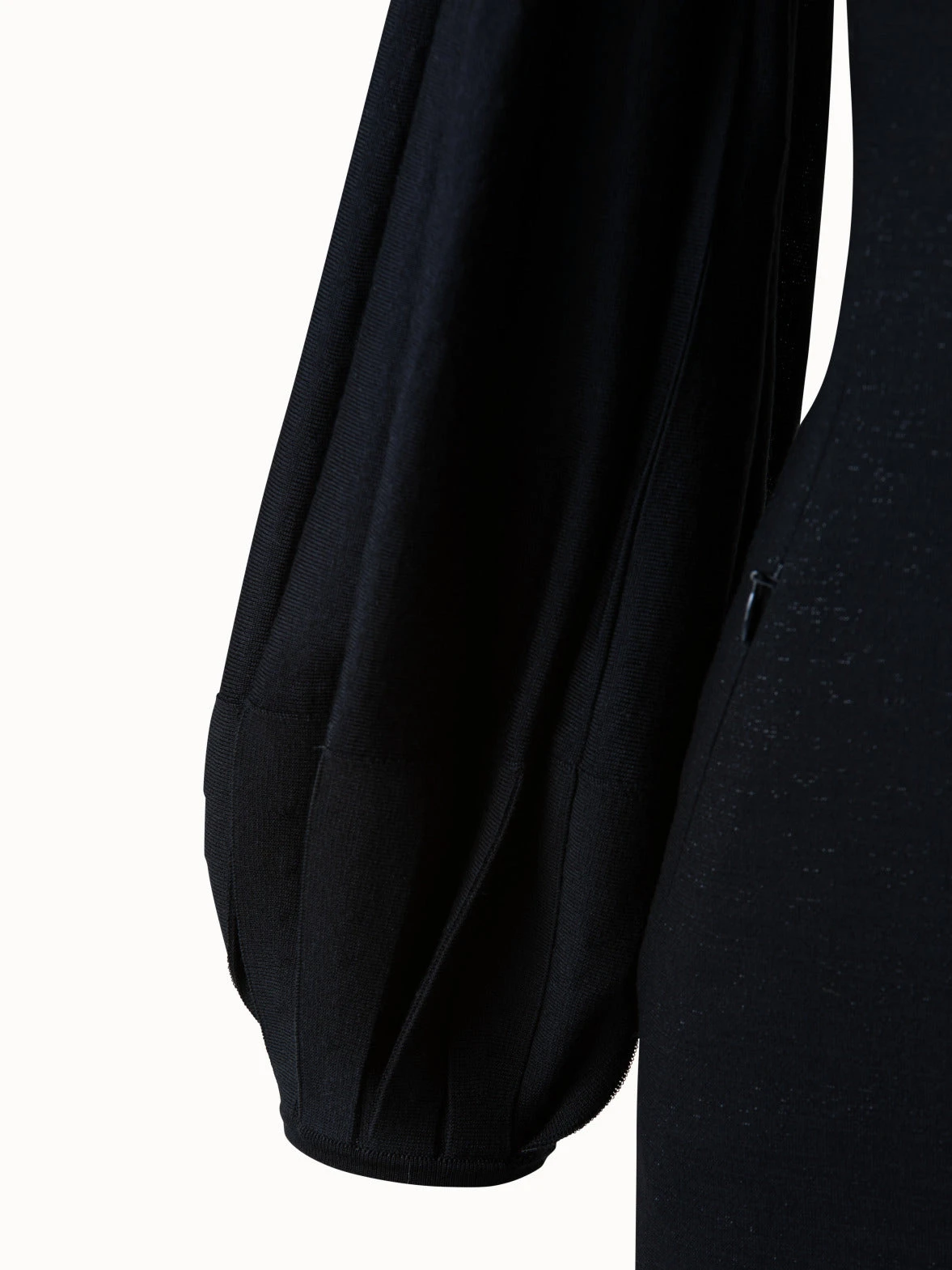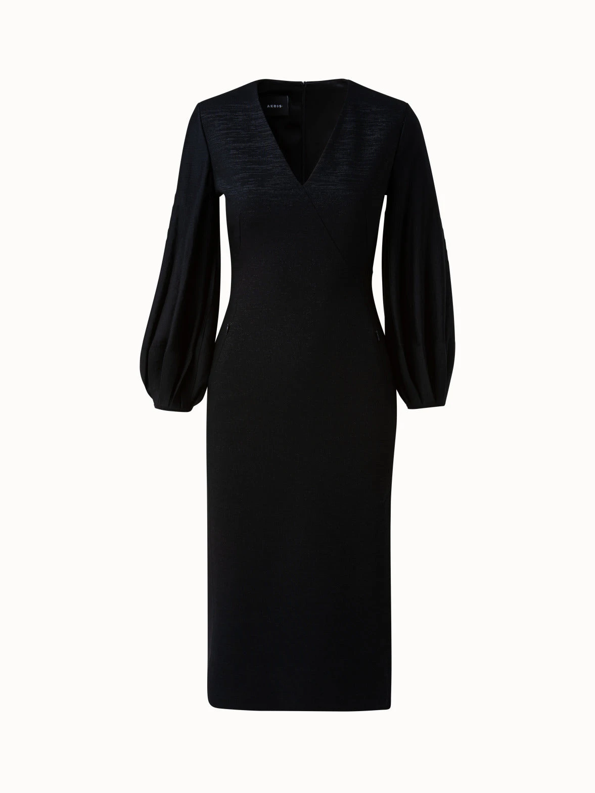 This wool lurex double face dress has an easy elegance. The v-neck and faux wrap details with a knitted volume sleeve add a feminine touch. Complete with back zip closure and side slits.