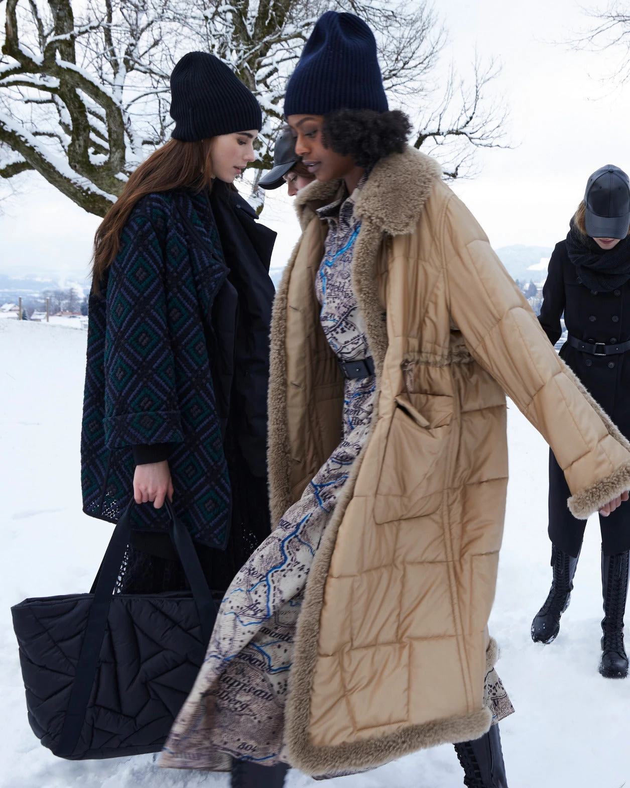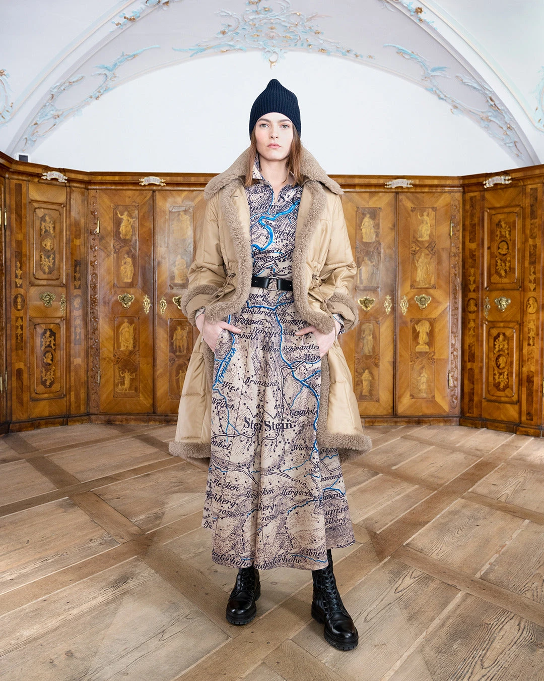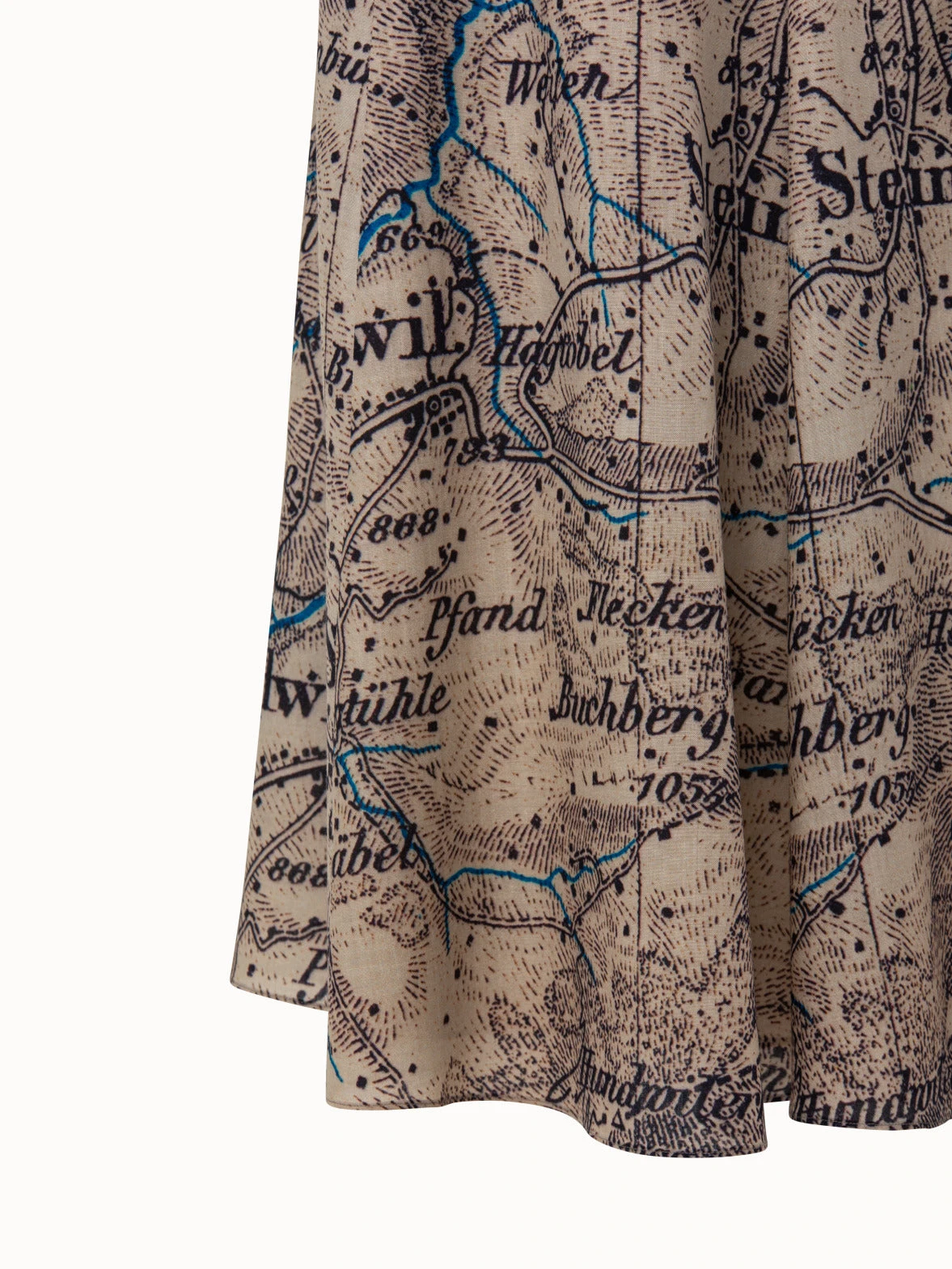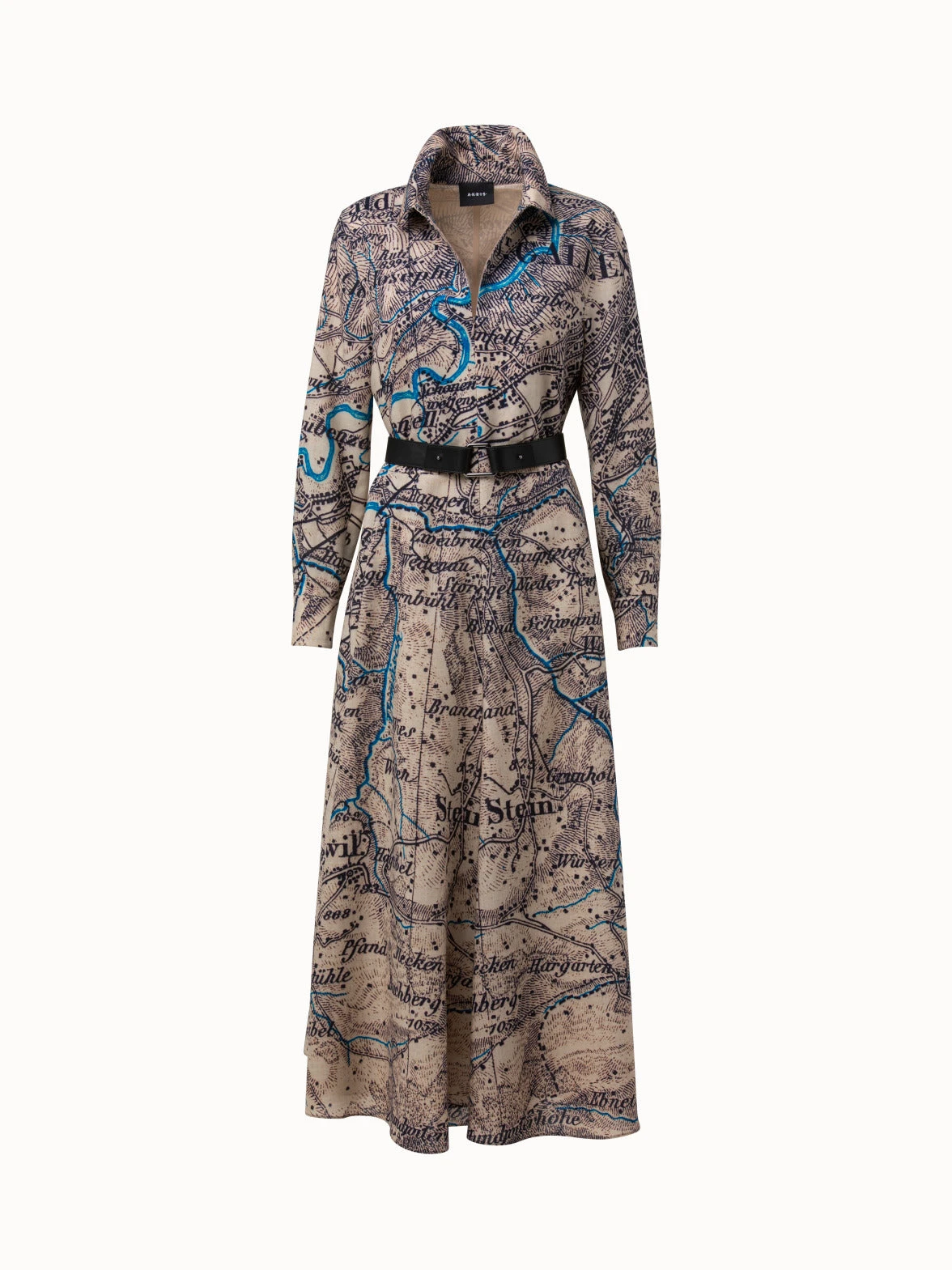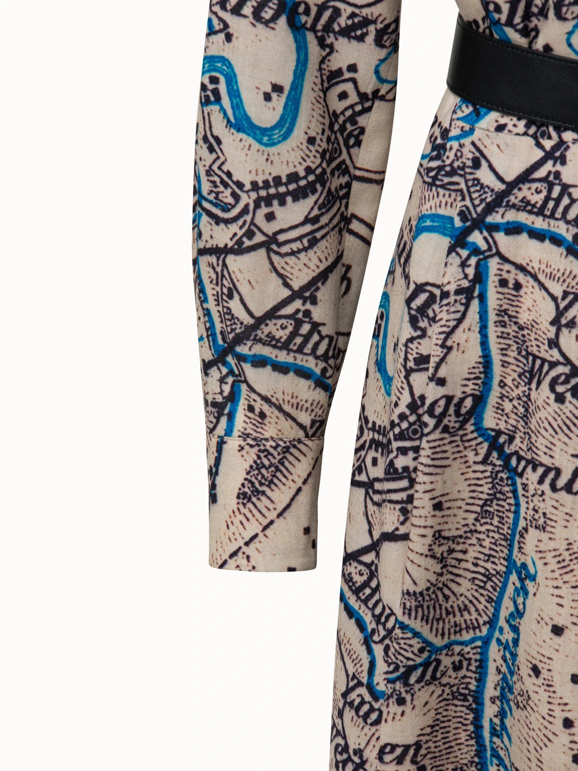 This statement-making long shirt dress in wool mousseline features a vintage map print of St. Gallen and contrast trapezoid leather belt. With a zipped shirt collar, long sleeves with button cuff, and pockets, this dress is surely a collector’s item and conversation starter.