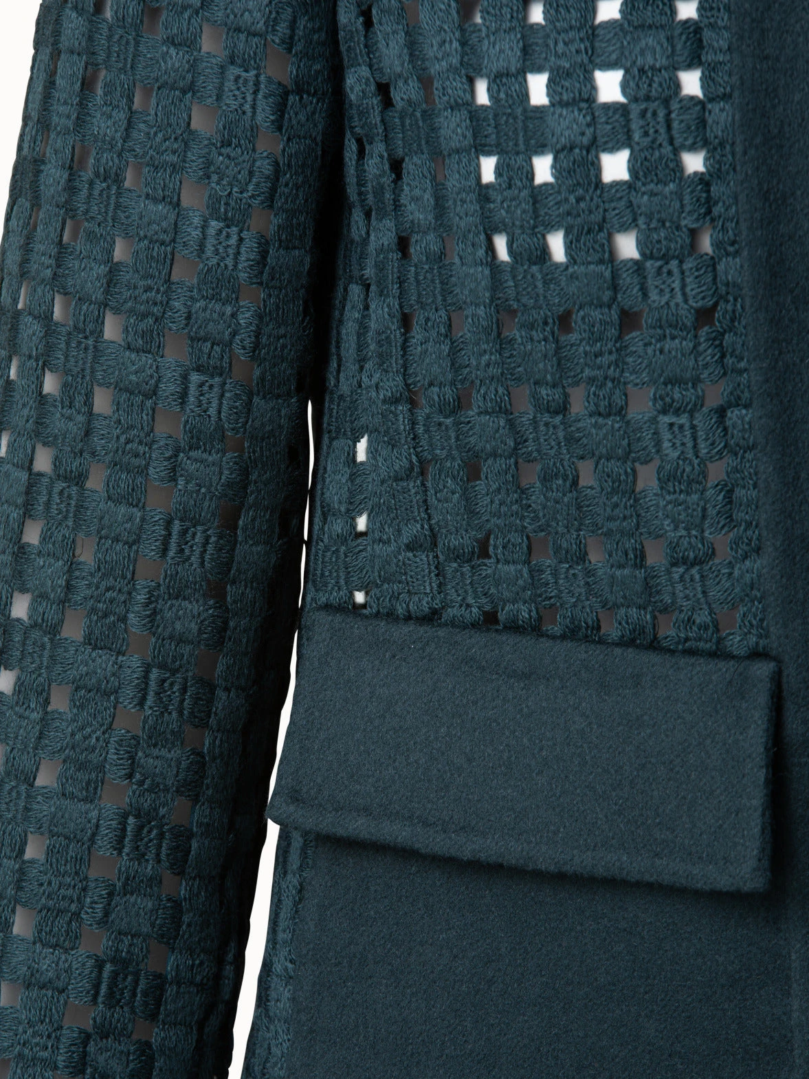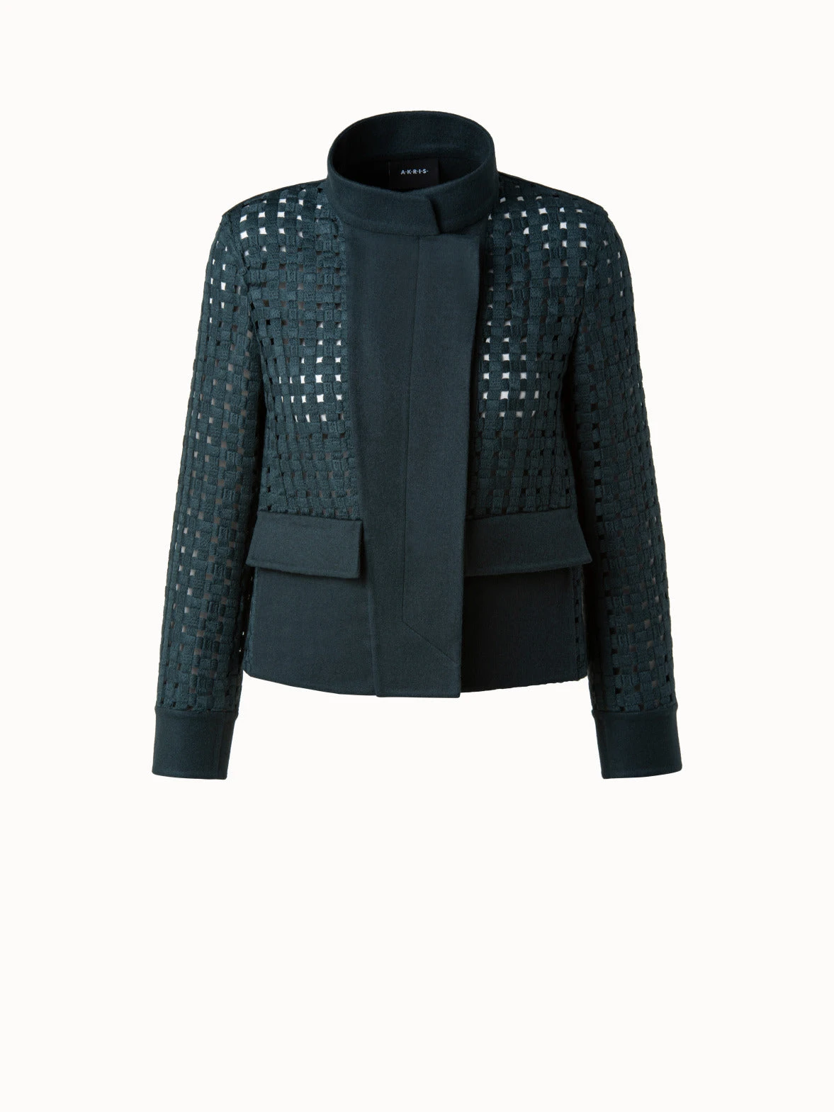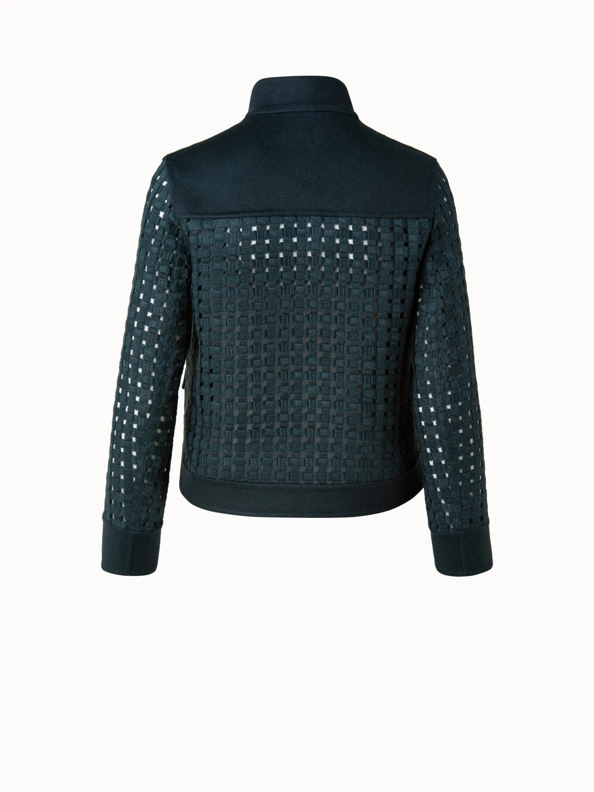 This moto-style embroidered jacket is the epitome of understated luxury. The body of the jacket is crafted in a wool open grid embroidery while the trim is finished in double face cashmere. The soft, relaxed shape layers easily over a seamless cashmere silk knit and can be dressed up or down.