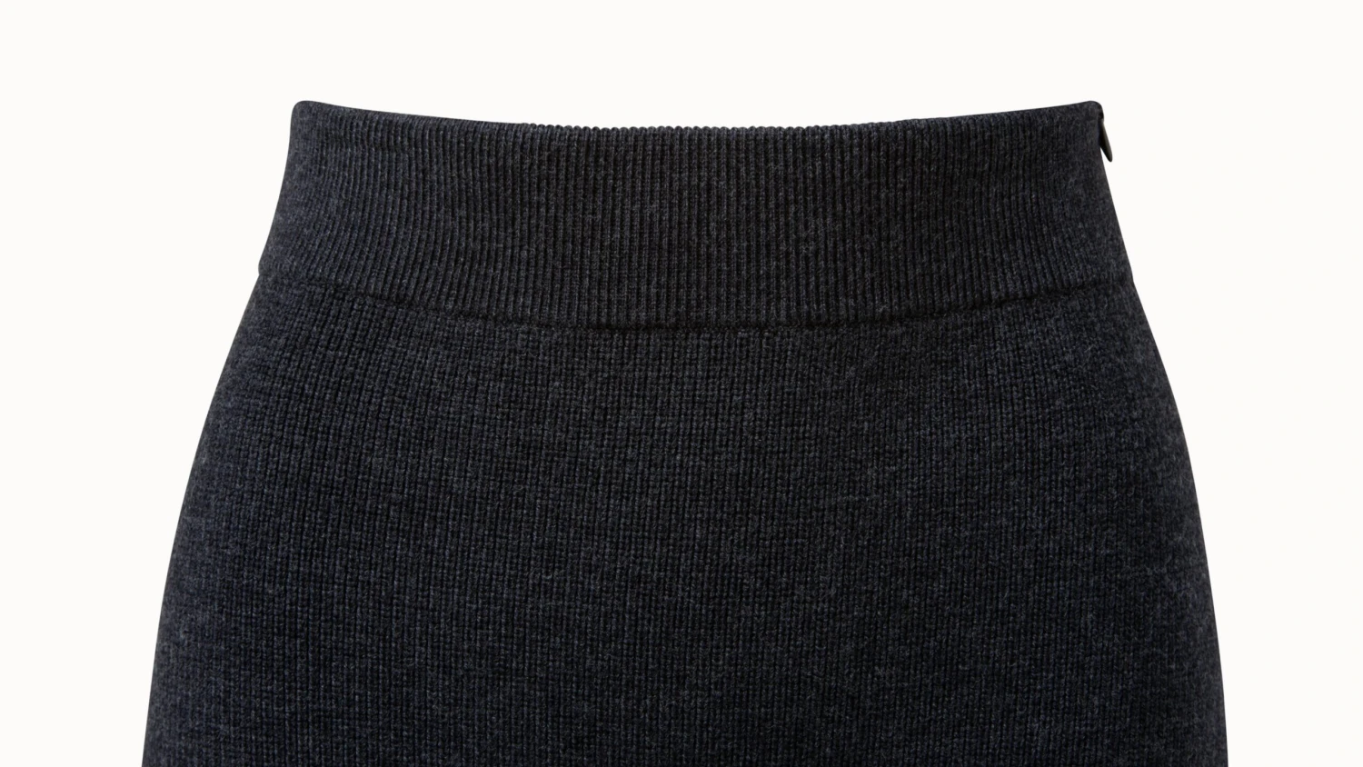 Knitwear dressing is a huge trend for fall. This wool stretch ribbed midi length pencil skirt is an easy way to take on the trend. Complete with a side zip closure and made to match with the accompanying cardigan and knit tank in the same fabrication.